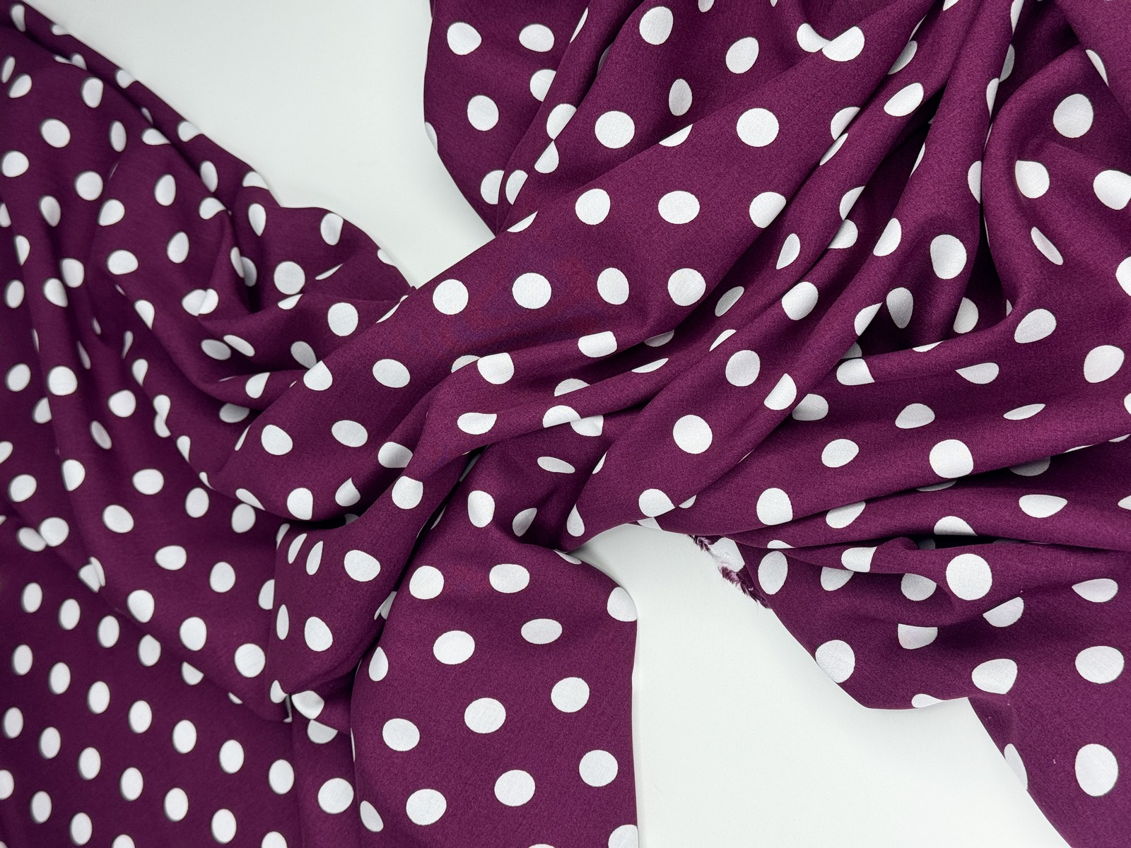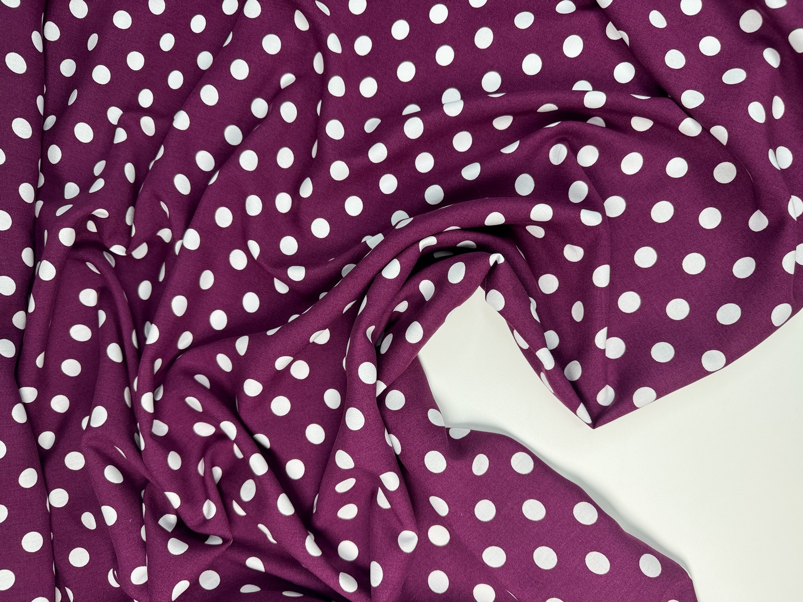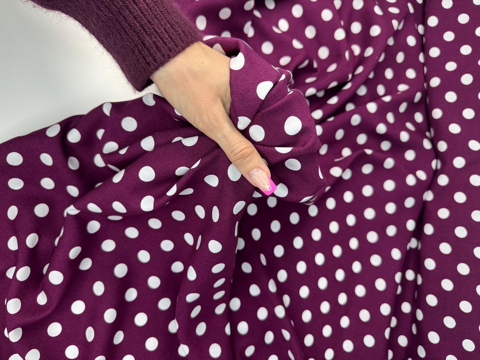 Тонкий штапель из вискозы с принтом горошек на сливе. Легкое летнее полотно высокой воздухопроницаемостью. Не тянется. Закладывается в мелкую гибкую складку. Возможна усадка до 5%.