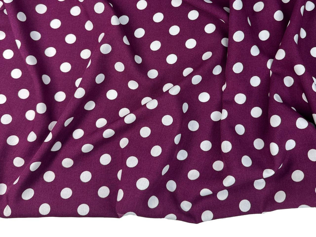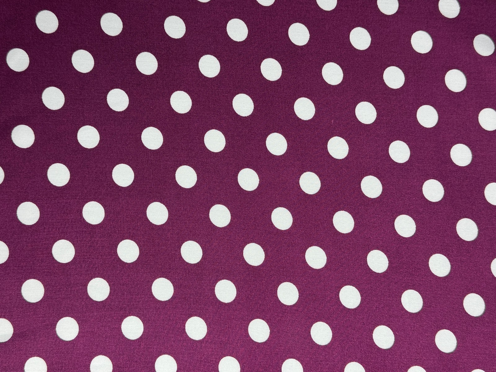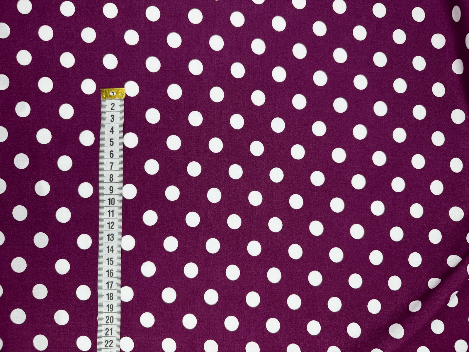 Тонкий штапель из вискозы с принтом горошек на сливе. Легкое летнее полотно высокой воздухопроницаемостью. Не тянется. Закладывается в мелкую гибкую складку. Возможна усадка до 5%.