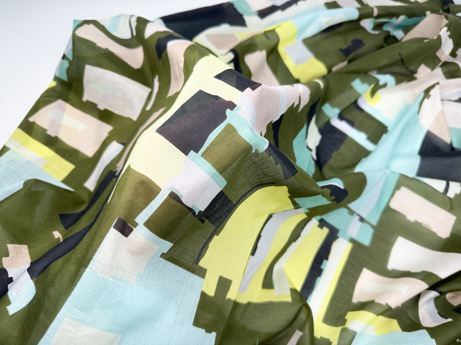 Ткань батист из 100% хлопка в принтом геометрия. Имеет легкий эффект просвечивания. Легко драпируется. Не тянется. Возможна усадка до 10%.