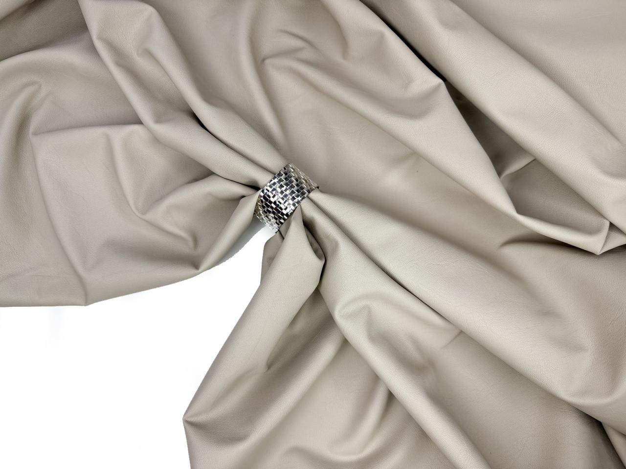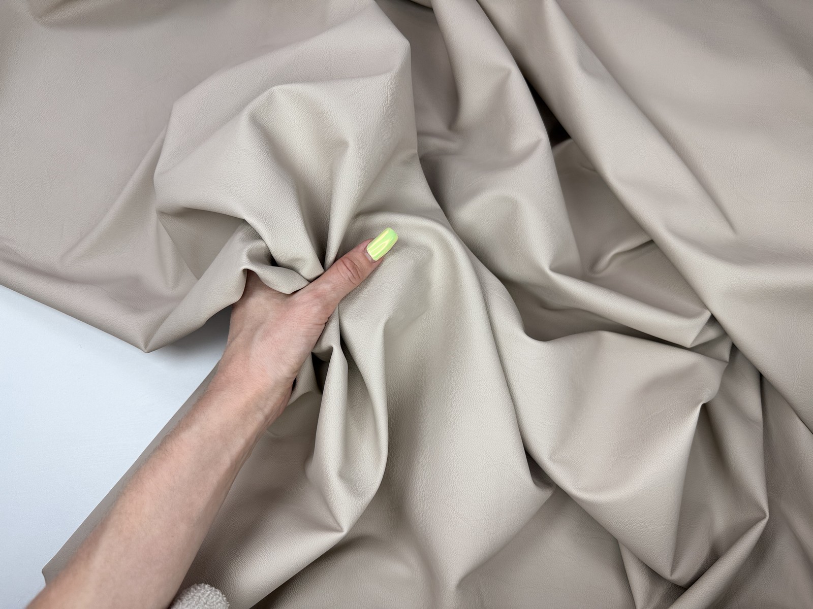 Экокожа цвет светлый беж. Тонкое эластичное полотно. Не боится проколов тонкими иглами, возвращает форму. Имеет шелковистую изнанку, в зависимости от модели, можно отказаться от подкладки. Податливая, легко шьется. Практически не мнется. Держит форму и закладывается в объемные складки. Не дает усадку.