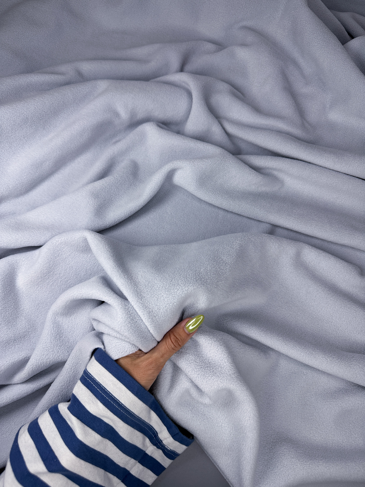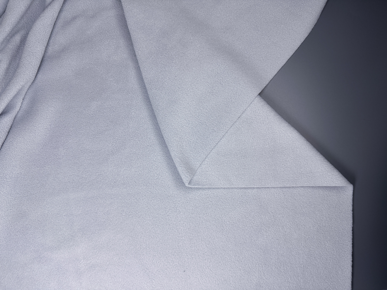 Ткань флис плотность 240 гр цвет светло-серый. Флис представляет собой мягкое синтетическое полотно с высокой эластичностью. Лицевая и изнаночная стороны с мягкой фактурой. Хорошо восстанавливает форму. Можно шить на 2 стороны. Не скатывается, так как обработан антипиллинговым составом. Имеет максимально широкий ассортимент пошива и подходит в качестве второго слоя взрослым и детям.