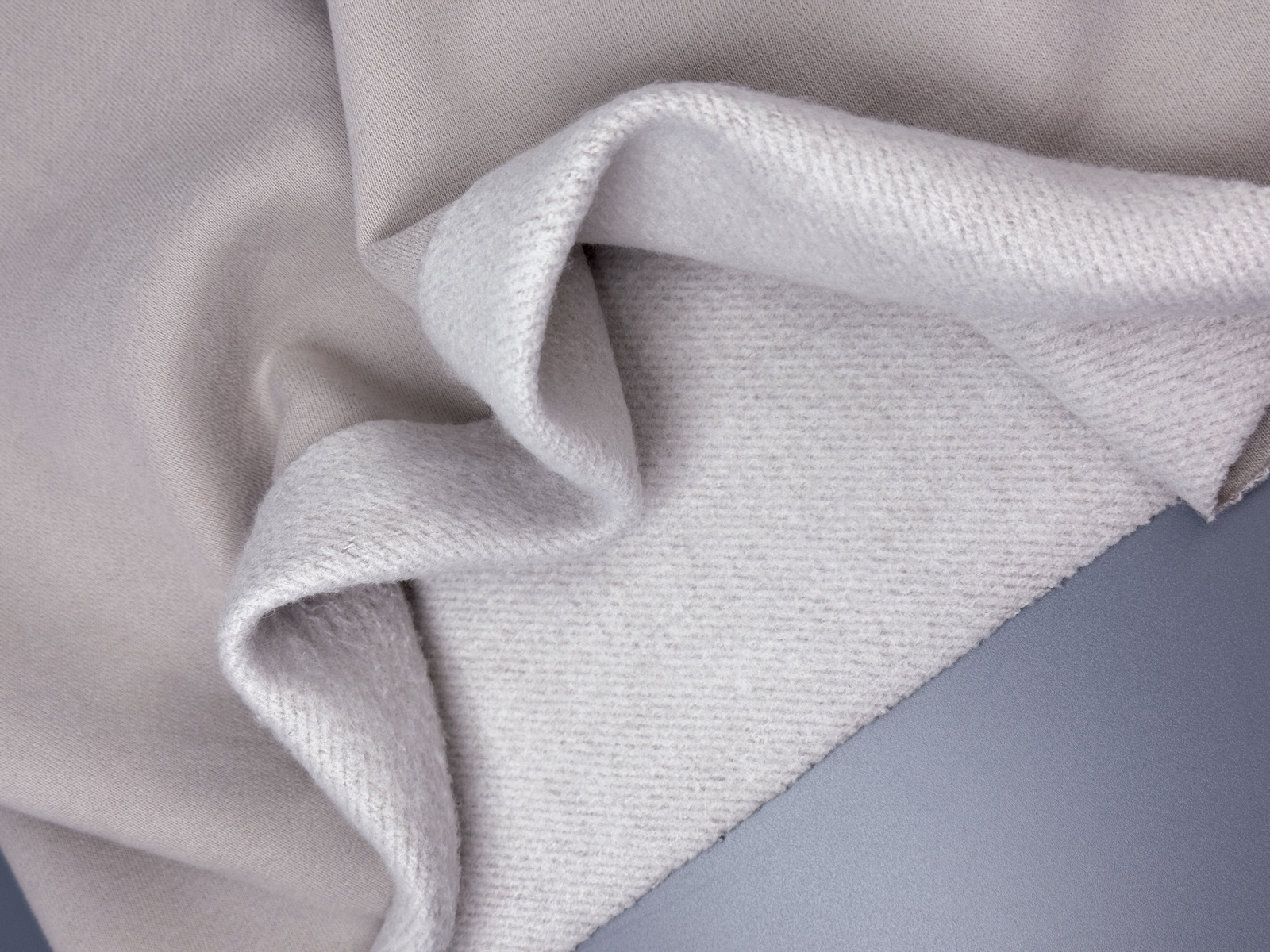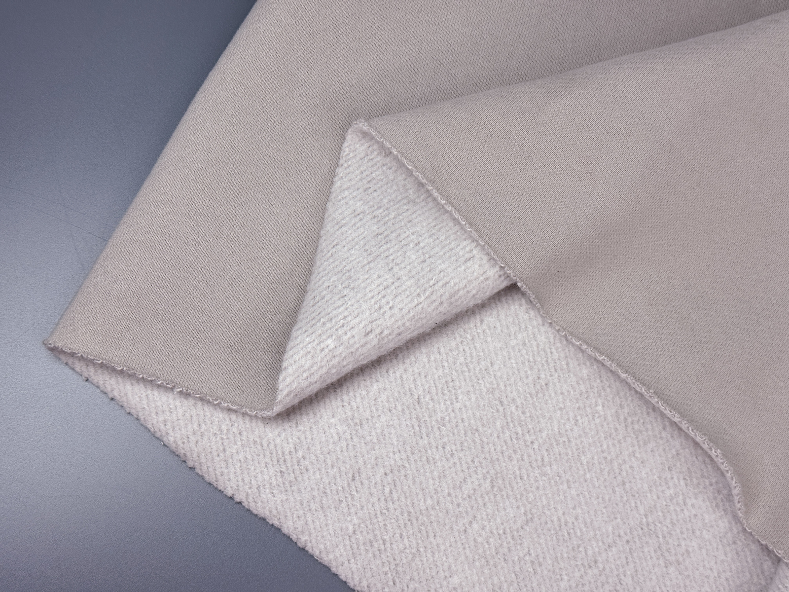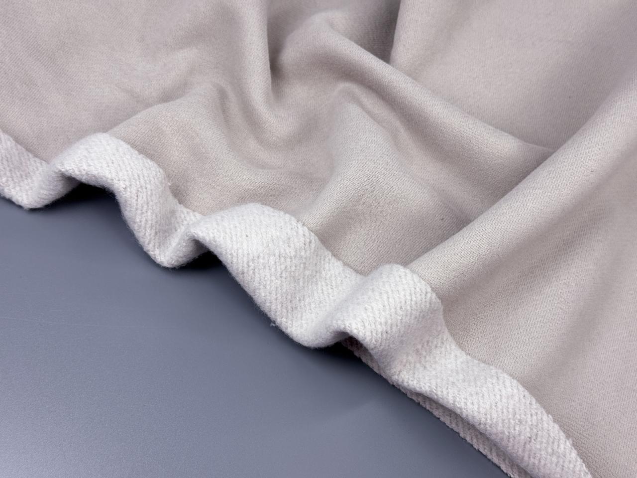 Ткань футер 3-х нитка с велюр эффектом и микроначесом цвет холодный латте плотностью 340 гр. Состав 80% хлопка, 20% полиэстера. Мягкий и теплый материал, который прекрасно держит форму и согреет вас в холодную погоду. Идеален для демисезонного ассортимента. Лицевая сторона с велюр эффектом придает изделиям особый уют. Важно: Не теряет своих свойств после стирок. Микроначес станет менее пушистым, но его теплые качества не станут хуже. Дает усадку до 3%.
