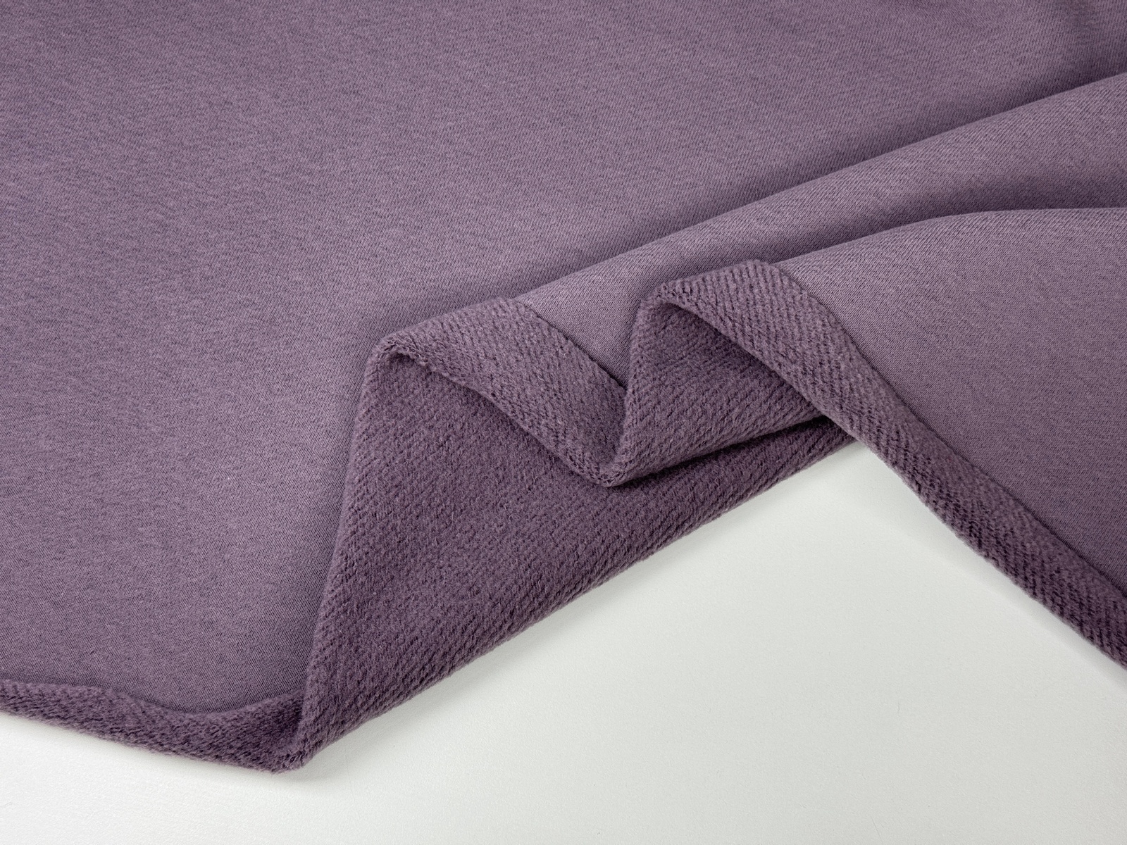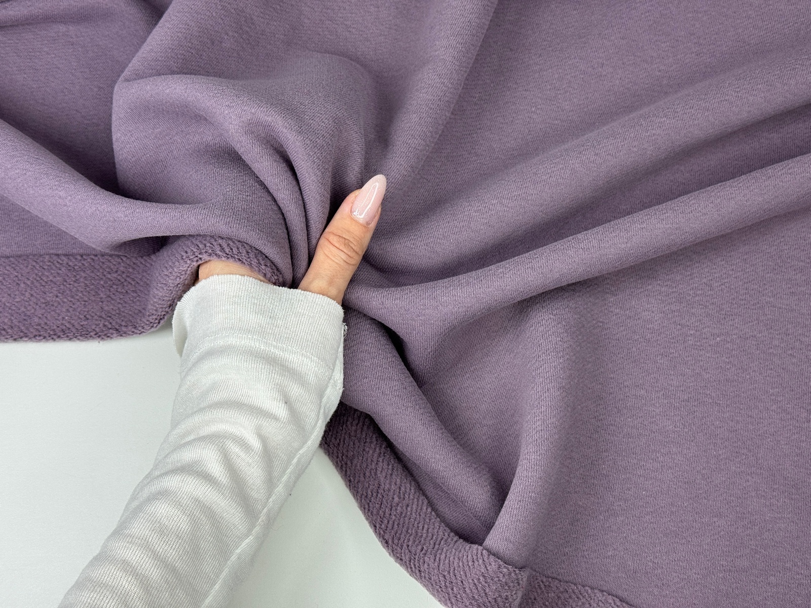 Ткань футер 3-х нитка с велюр эффектом и микроначесом цвет сиреневый дым плотностью 340 гр. Состав 80% хлопка, 20% полиэстера. Мягкий и теплый материал, который прекрасно держит форму и согреет вас в холодную погоду. Идеален для демисезонного ассортимента. Лицевая сторона с велюр эффектом придает изделиям особый уют. Важно: Не теряет своих свойств после стирок. Микроначес станет менее пушистым, но его теплые качества не станут хуже. Дает усадку до 3%.