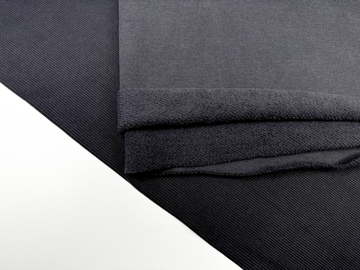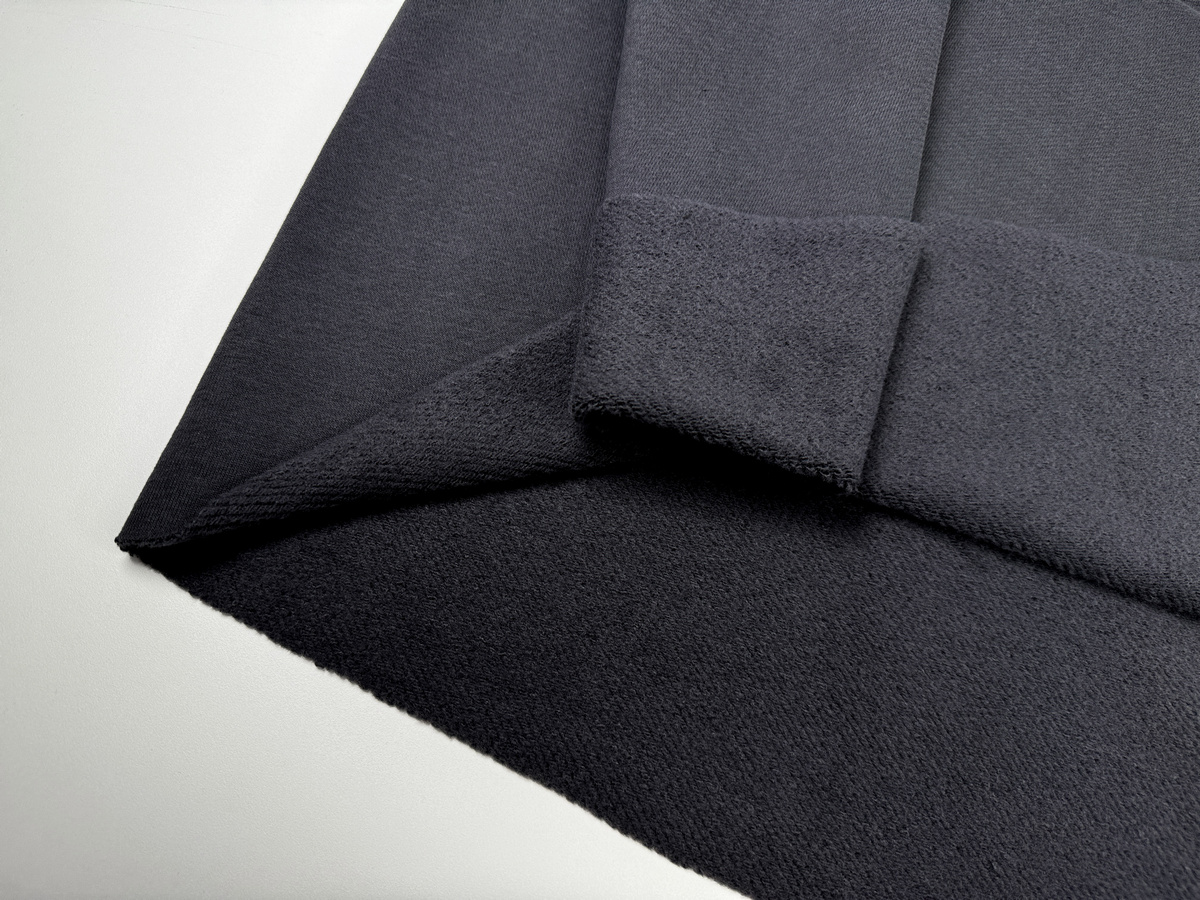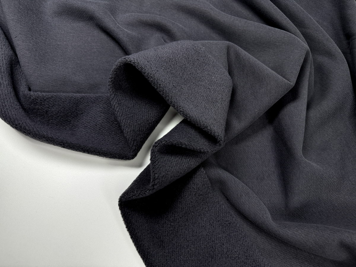 Ткань футер 3-х нитка с велюр эффектом и микроначесом цвет графит плотностью 340 гр. Состав 80% хлопка, 20% полиэстера. Мягкий и теплый материал, который прекрасно держит форму и согреет вас в холодную погоду. Идеален для демисезонного ассортимента. Лицевая сторона с велюр эффектом придает изделиям особый уют. Важно: Не теряет своих свойств после стирок. Микроначес станет менее пушистым, но его теплые качества не станут хуже. Дает усадку до 3%.