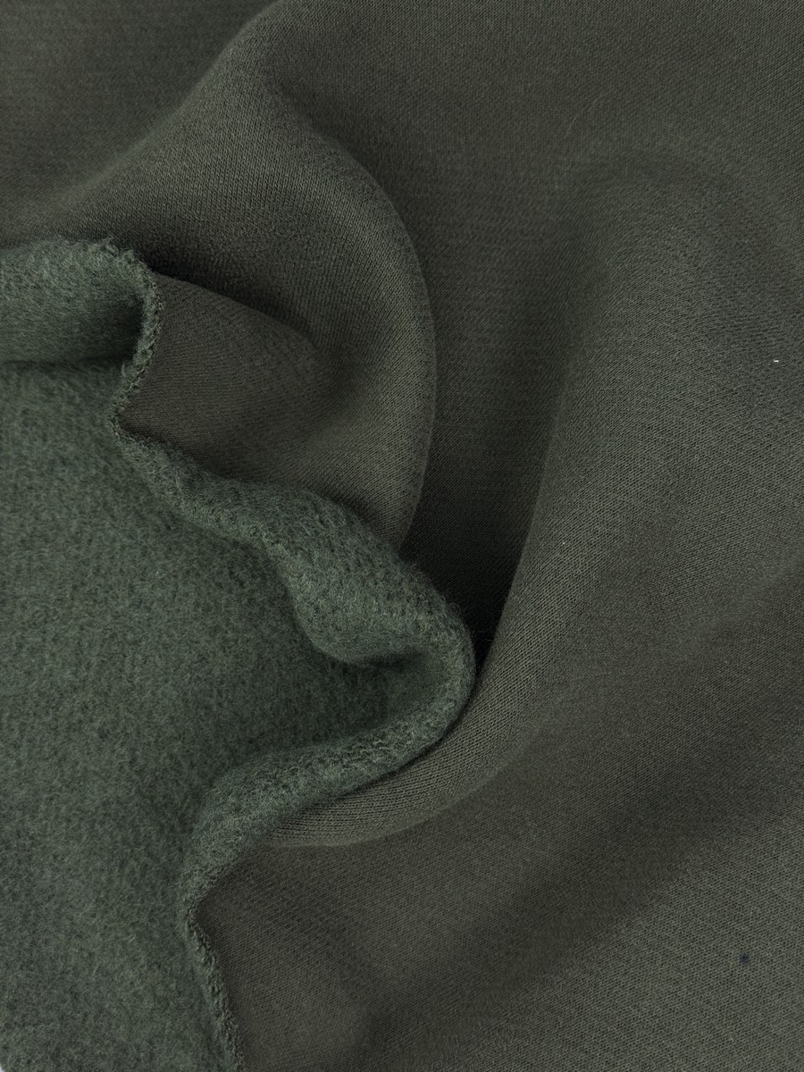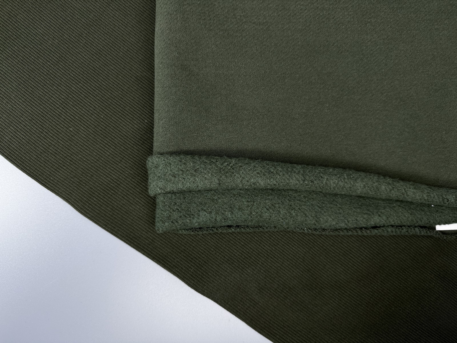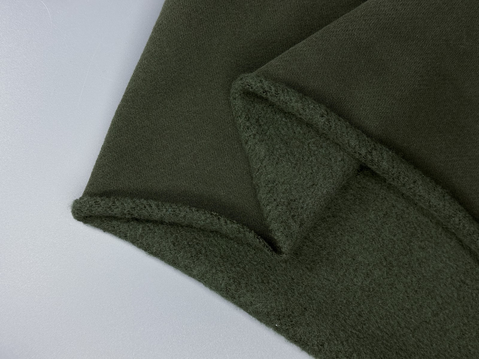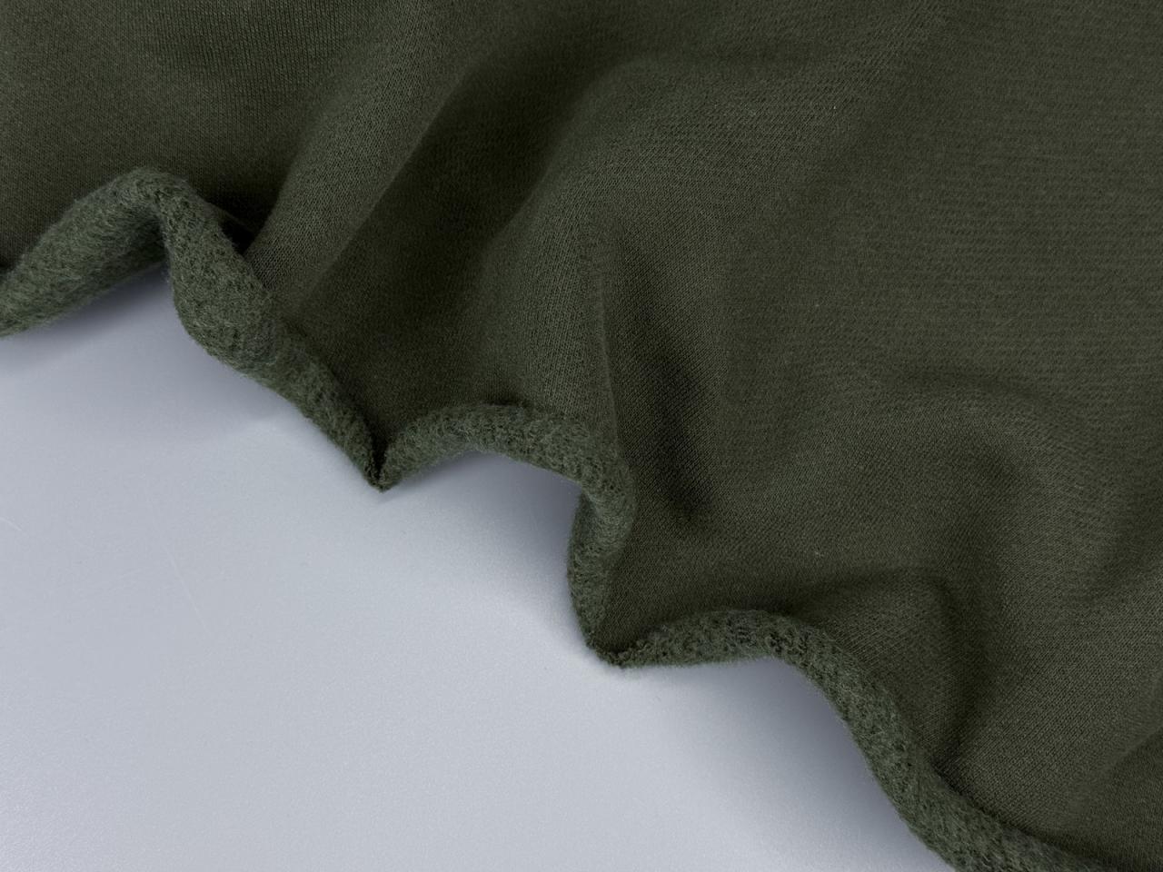 Ткань футер 3-х нитка с велюр эффектом и микроначесом цвет хаки плотностью 340 гр. Состав 80% хлопка, 20% полиэстера. Мягкий и теплый материал, который прекрасно держит форму и согреет вас в холодную погоду. Идеален для демисезонного ассортимента. Лицевая сторона с велюр эффектом придает изделиям особый уют. Важно: Не теряет своих свойств после стирок. Микроначес станет менее пушистым, но его теплые качества не станут хуже. Дает усадку до 3%.