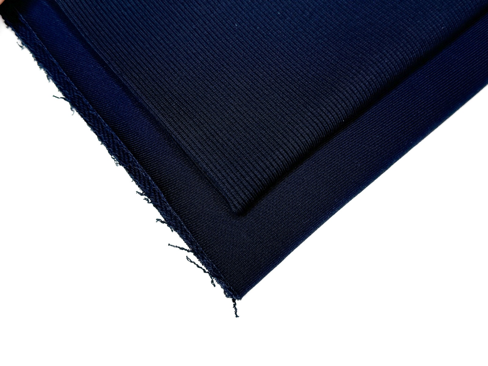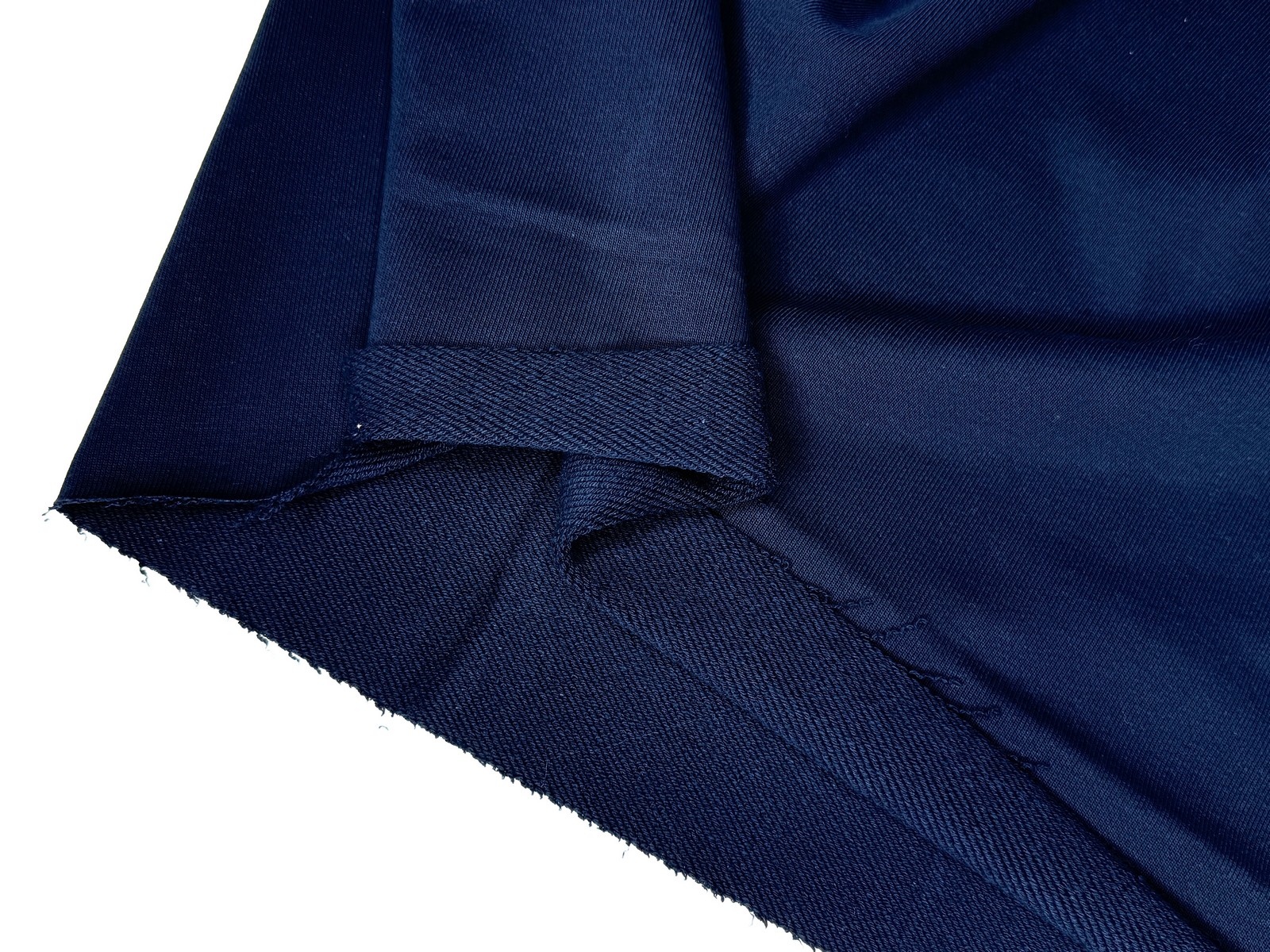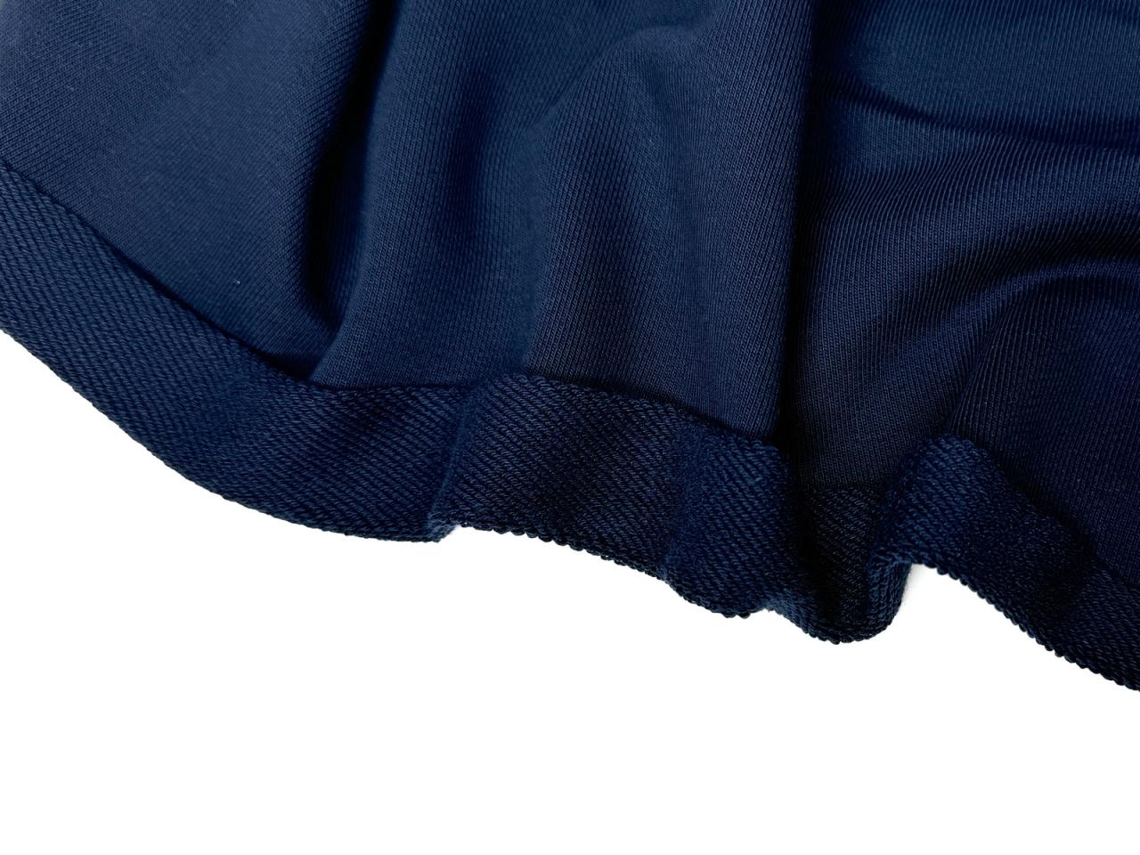 Ткань футер 3-х нитка плотностью 350 гр цвет темно-синий с микродиагональю. Линейка SUPREME. Отличительная особенность данной линейки: гладкая шелковистая лицевая сторона, изнанка с маленькой идеальной плотной диагональной петелькой, хорошо держит форму и цвет. Практичный состав: 90% хлопка, 10% лайкры. Лидер продаж на весенне-летний сезон. Дает усадку до 4%. Кашкорсе в тон.