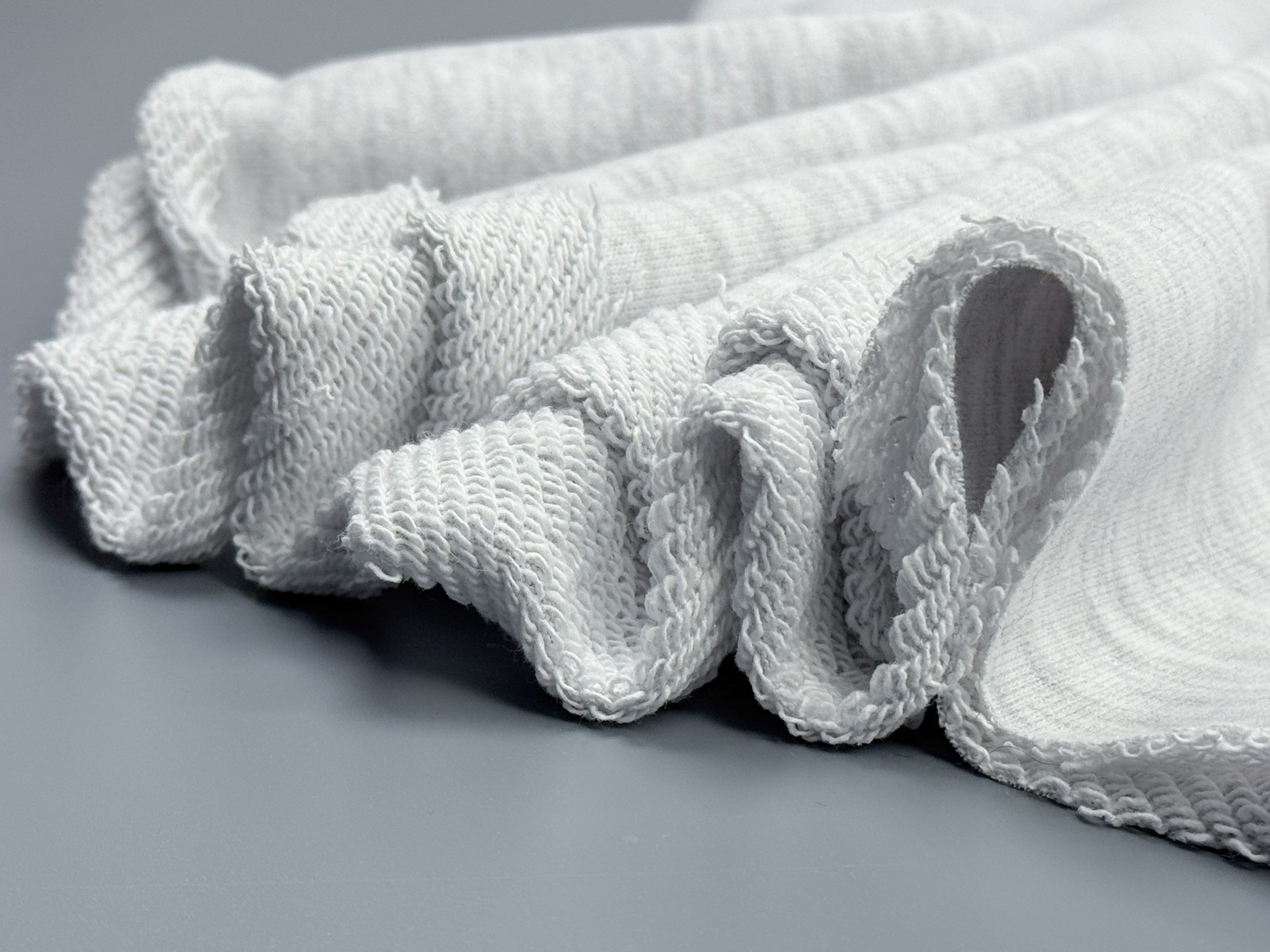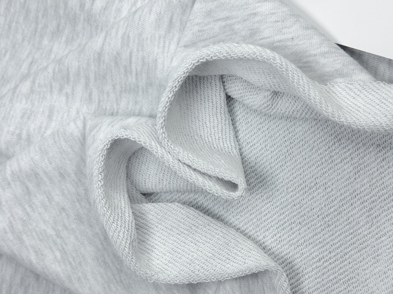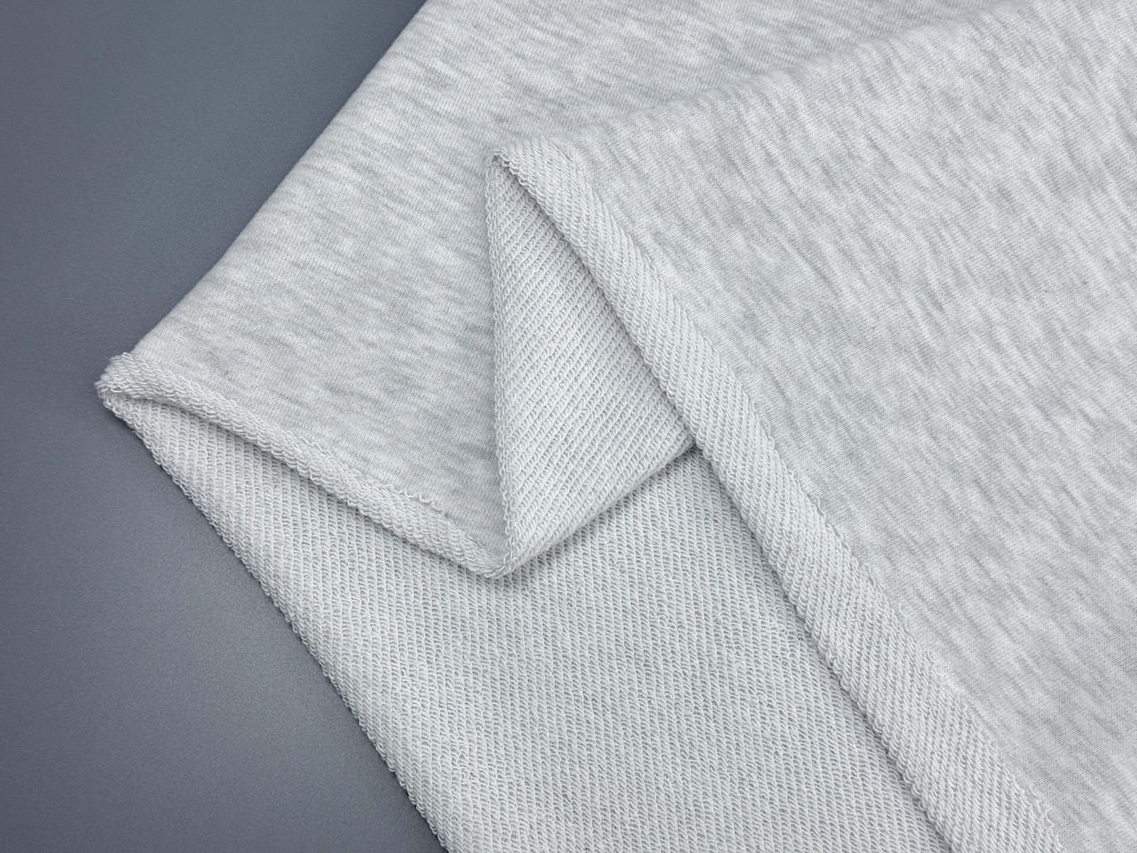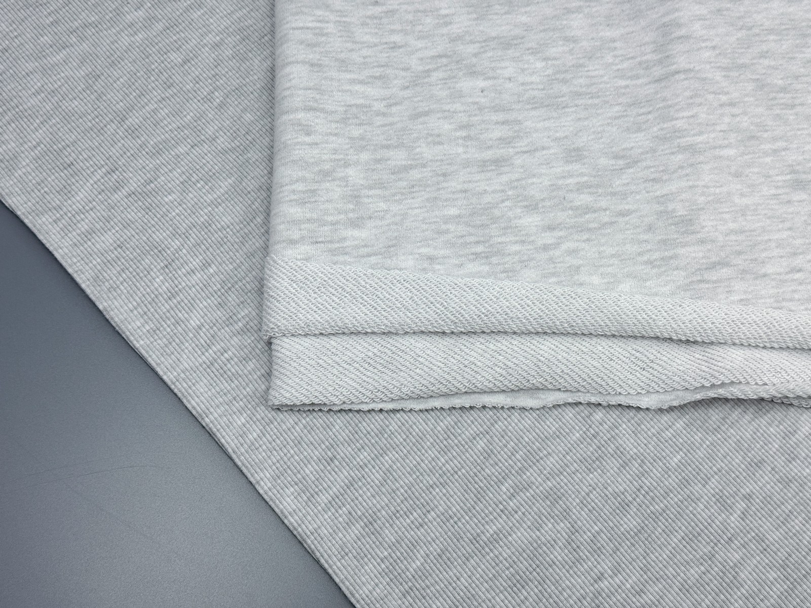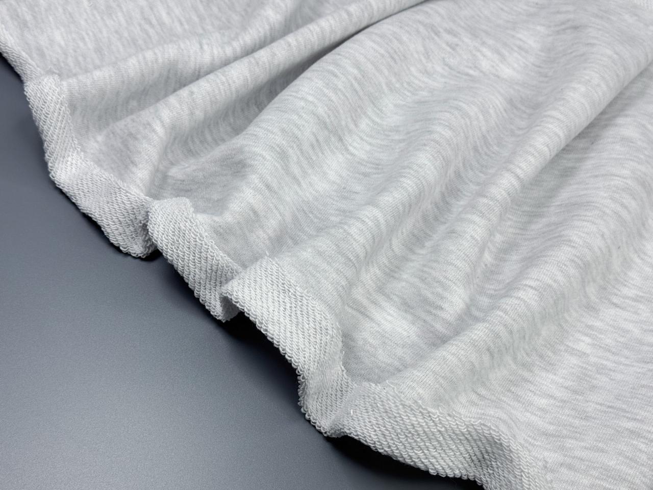 Ткань футер 3-х нитка с велюр эффектом цвет Серый меланж светлый. Плотность 340 гр с составом 80% хлопка и 20% полиэстера шириной 180 см. Мягкая и бархатистая лицевая сторона, изнанка с пышкой диагональной ровной петлей. Идеальный демисезонный материал, который подходит для пошива широкой ассортиментной линейки. Легкий и тонкий материал с хорошими ходовыми качествами, не выцветает и не выстирывается.