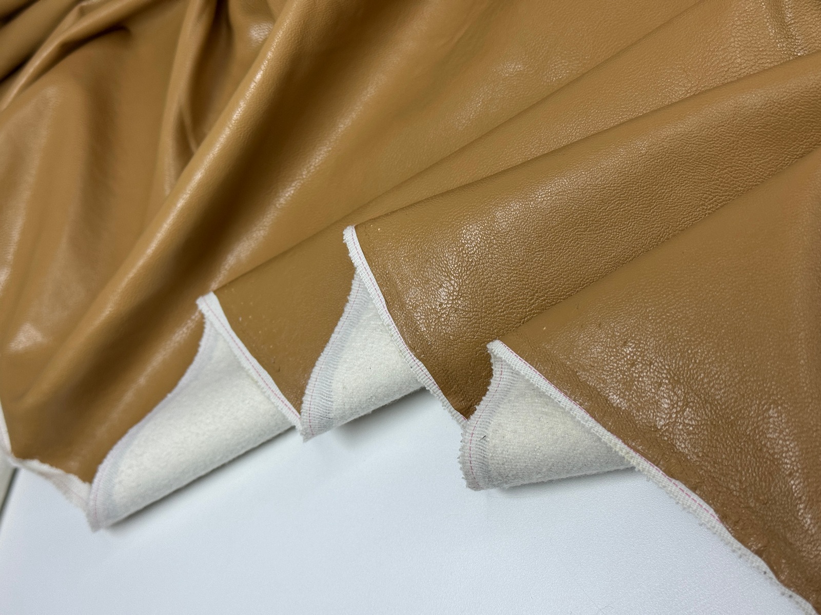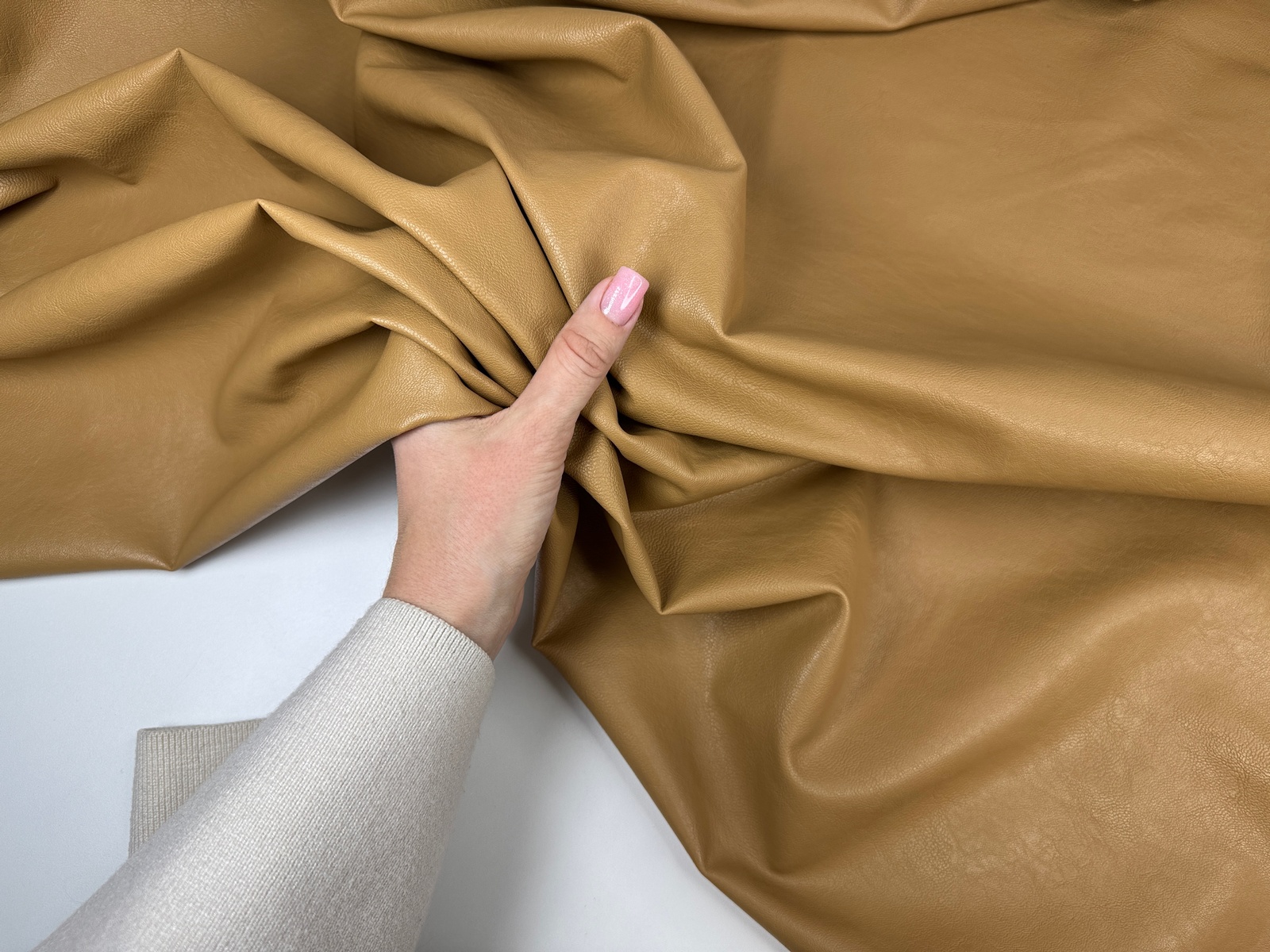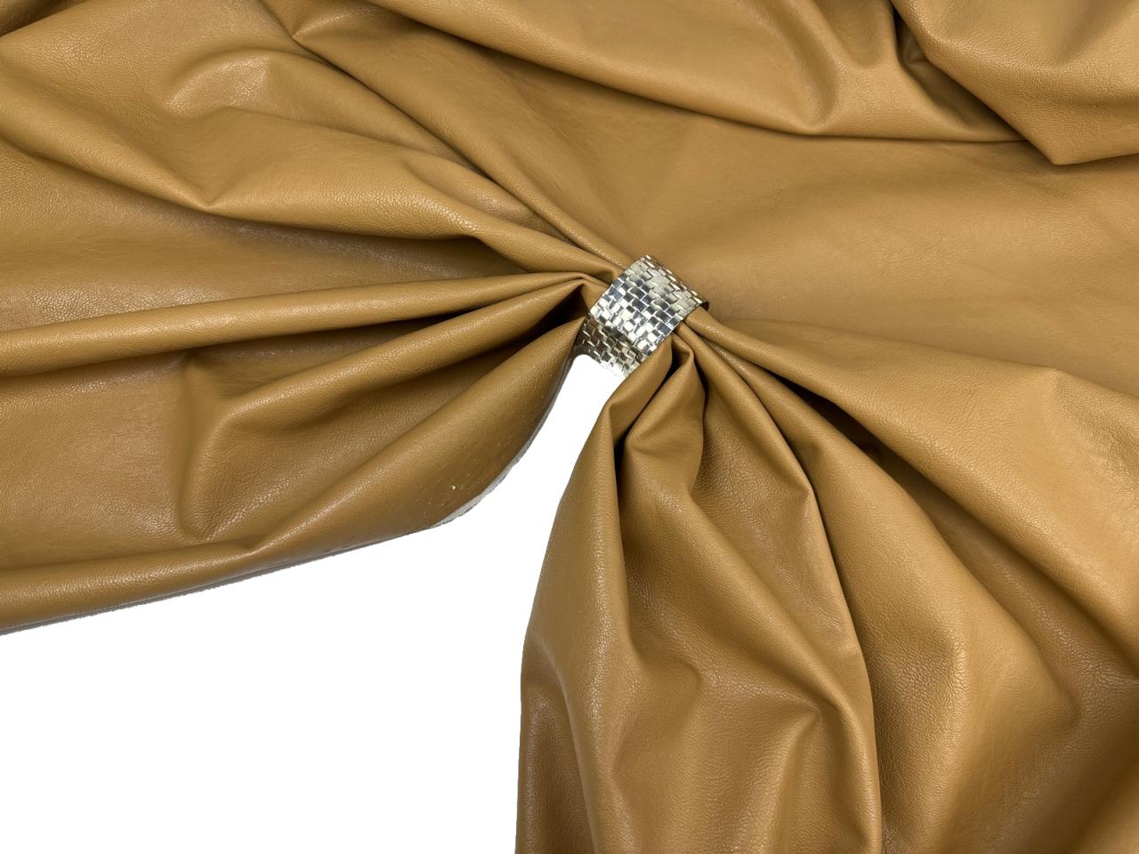 Ткань искусственная кожа цвет ириска. Материал имитирует гладкую кожу. Гладкая изнанка, тканевая основа. Средняя плотность. Практически не тянется, учитывайте это при выборе модели. На видео проводим эксперимент на прокол, пожалуйста, посмотрите.