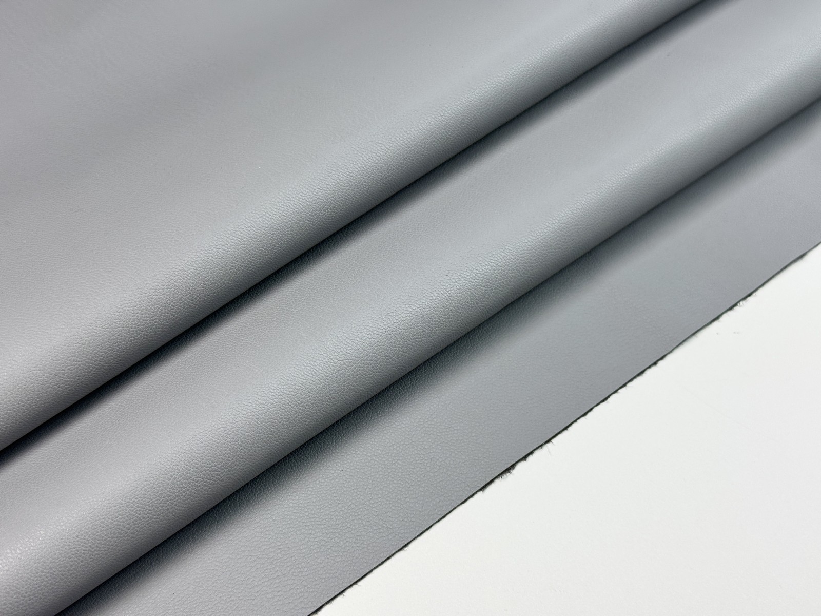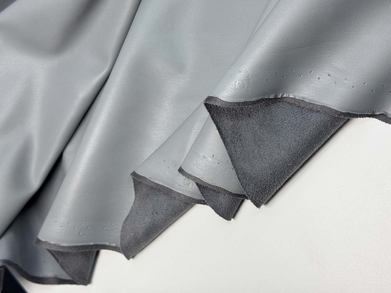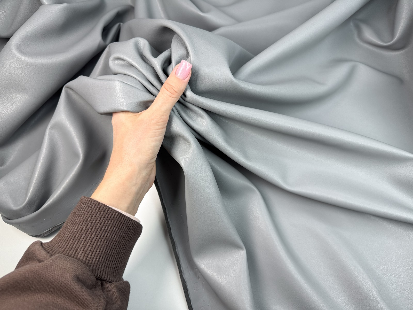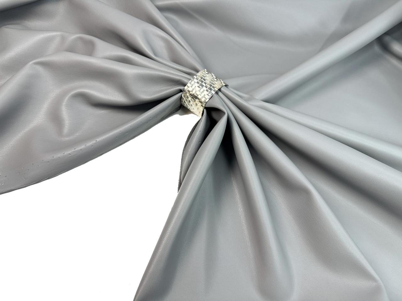 Ткань искусственная кожа на замше цвет серый агат. Гладкая матовая лицевая с характерной фактурой, изнанка имитирует замшу и имеет маленький мягкий ворс. Плотность 430 гр. Тянется, учитывайте это при выборе модели. На видео проводим эксперимент на прокол, пожалуйста, посмотрите.