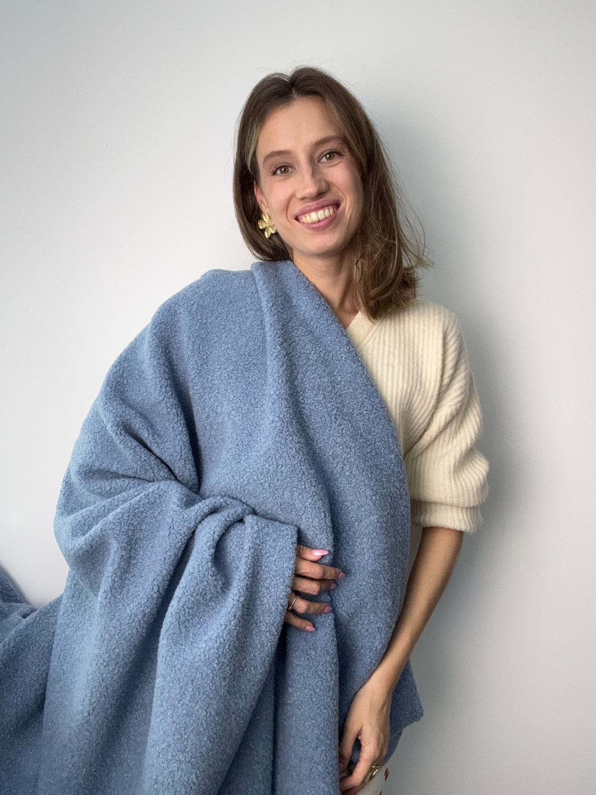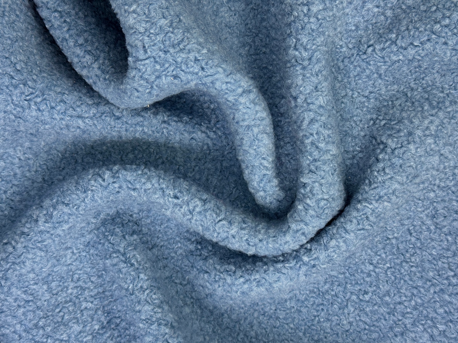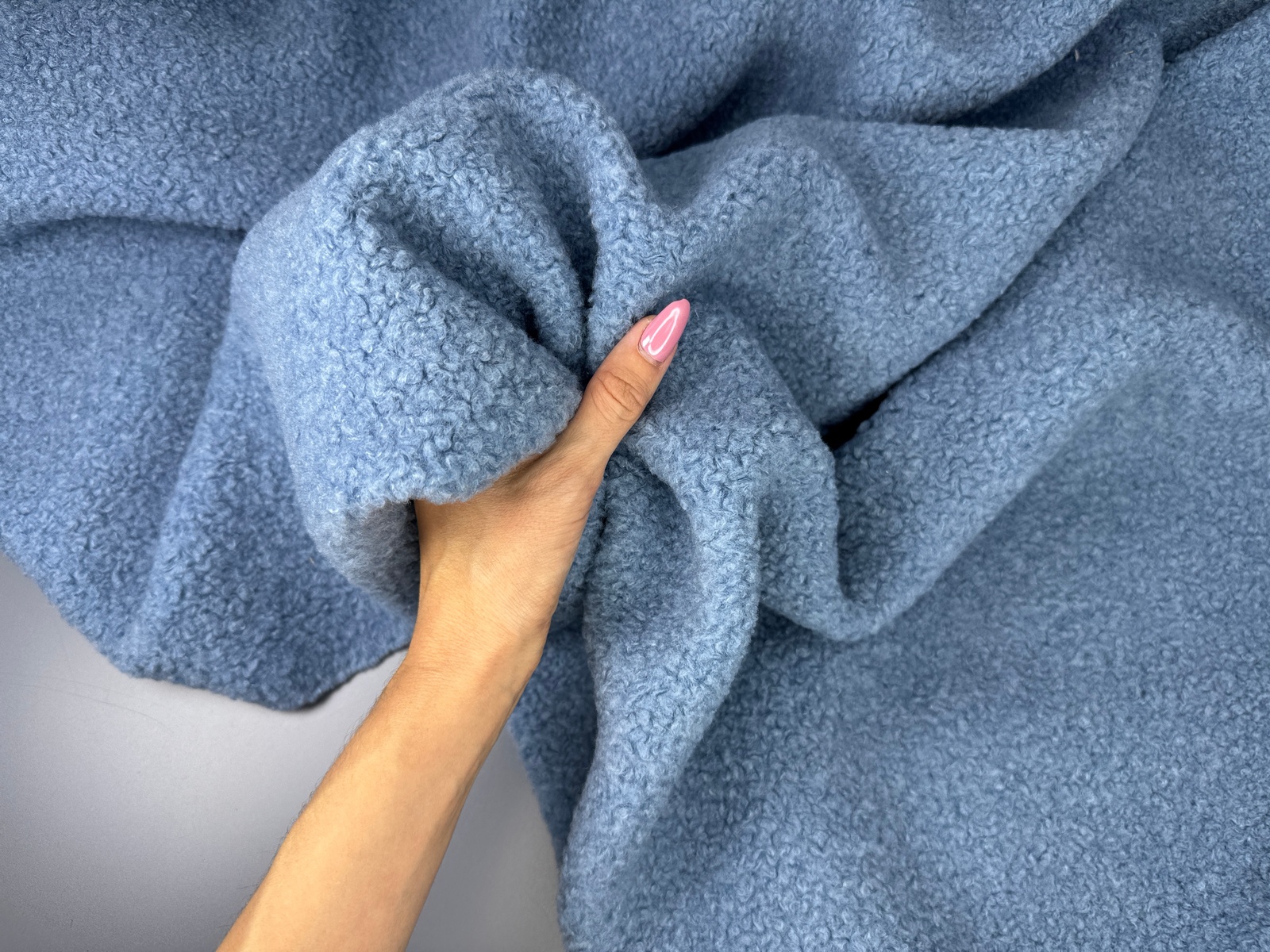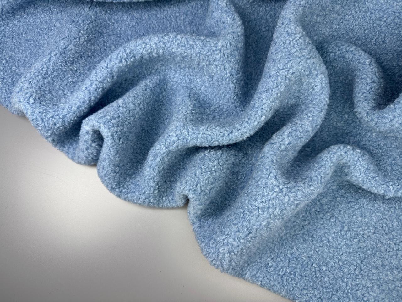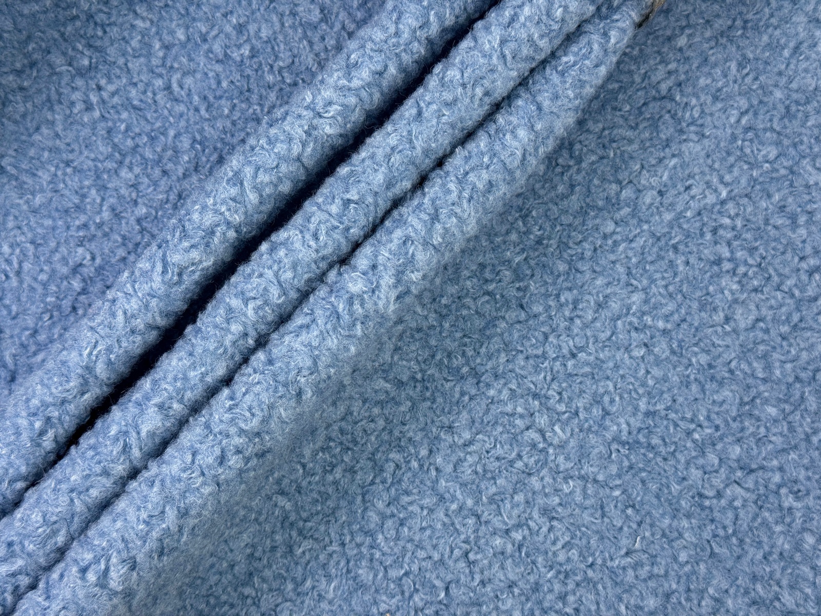 Искусственный мех барашек голубой. Синтетическое полотно с эффектным плотным кудрявым ворсом (длина около 0,5 см) на лицевой стороне и слегка ворсовой изнанкой. Красиво переливается на свету. Обладает малой эластичностью. Хорошо держит и восстанавливает форму. Не сминается. При пошиве рекомендуем сажать на подкладку.