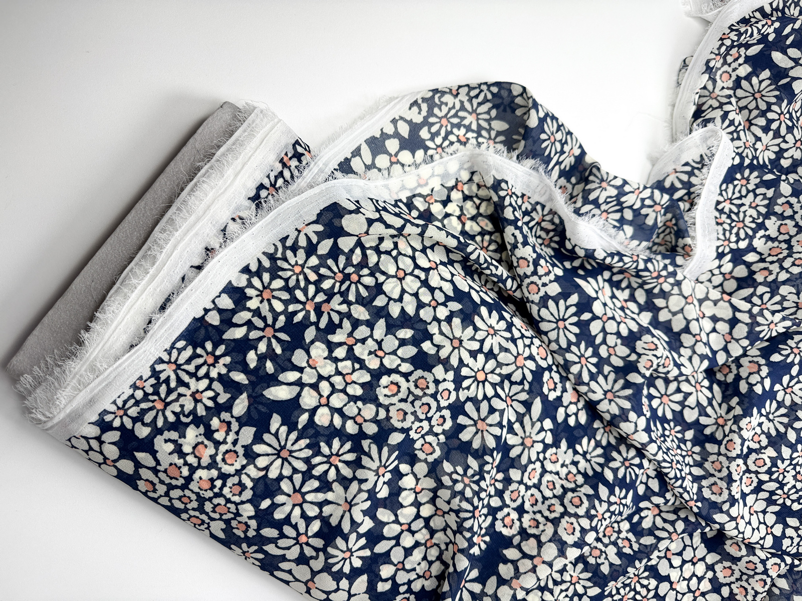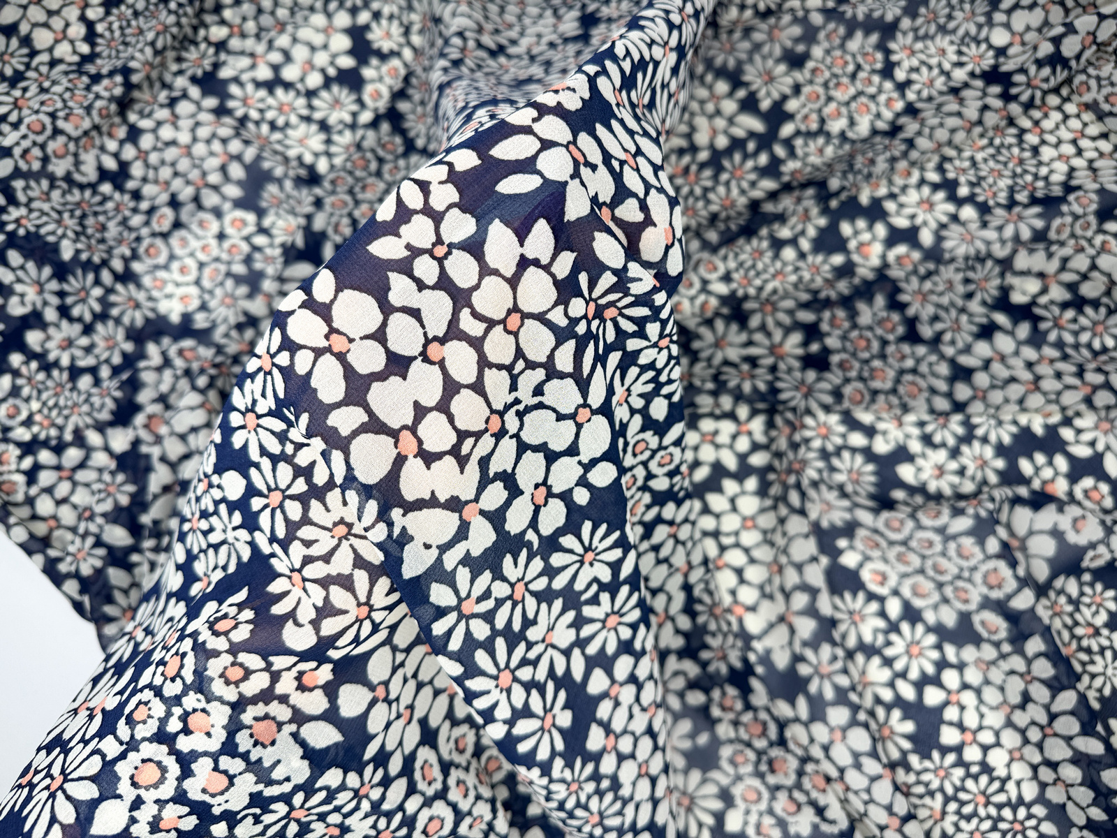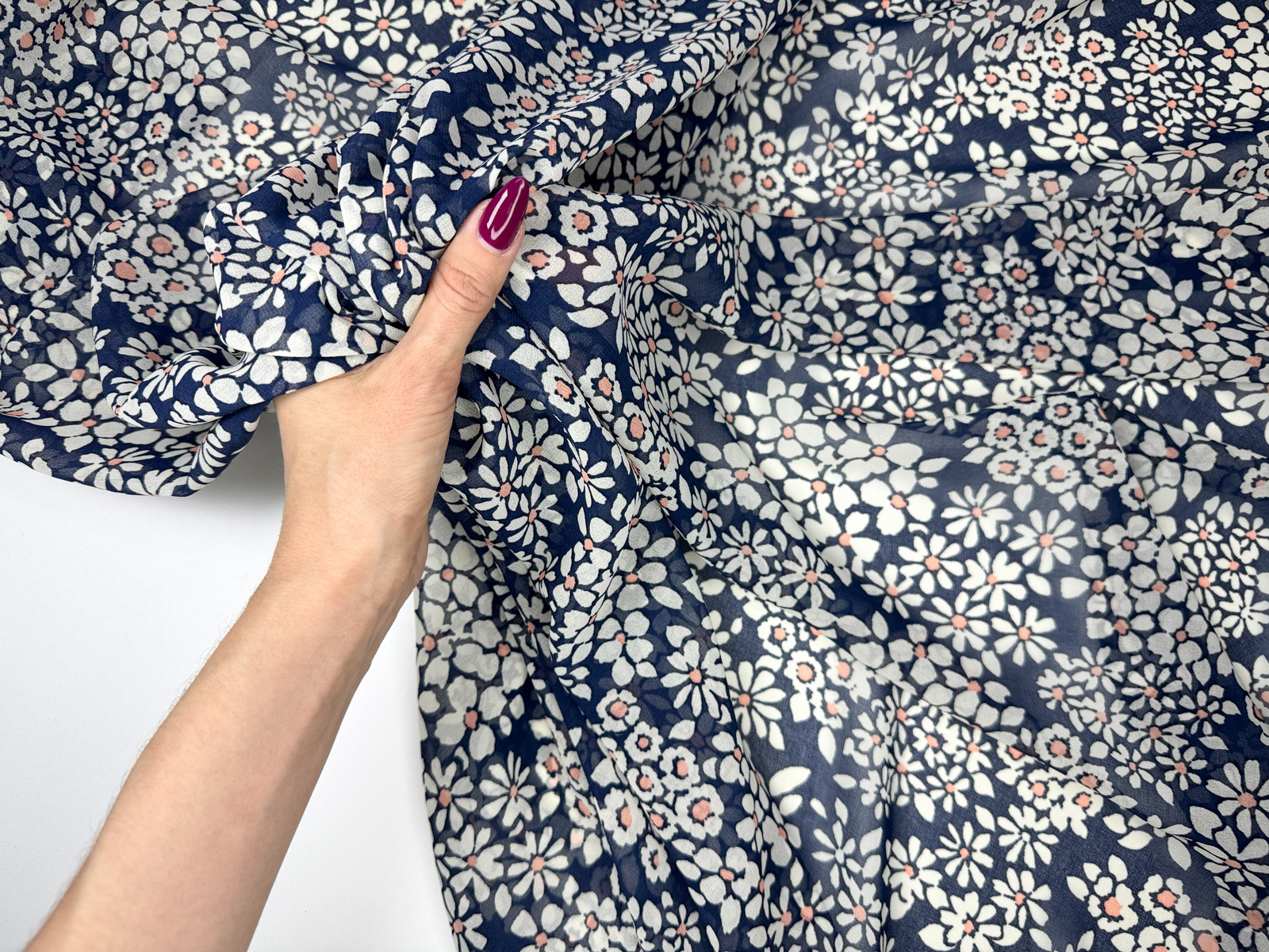 Ткань креп шифон с принтом ромашки. Тонкое, вискозное полотно с фактурой, приятной к коже. Не тянется. Струящееся полотно, закладывается в мелкую складку. Форму не держит. Не дает усадку. Светит, учитывайте это при подборе модели. Производство: Италия.