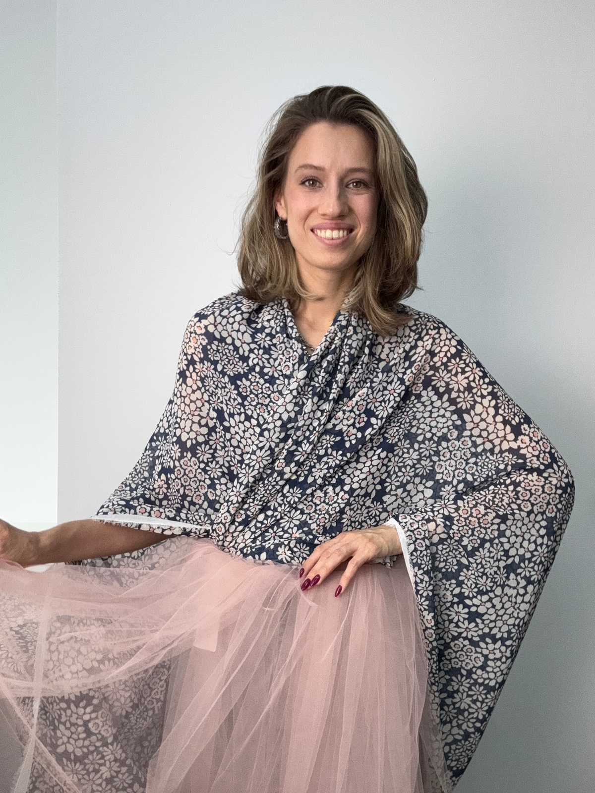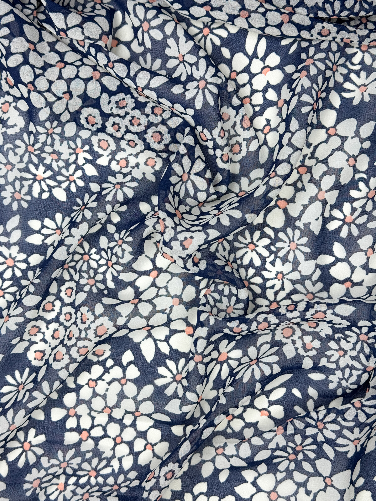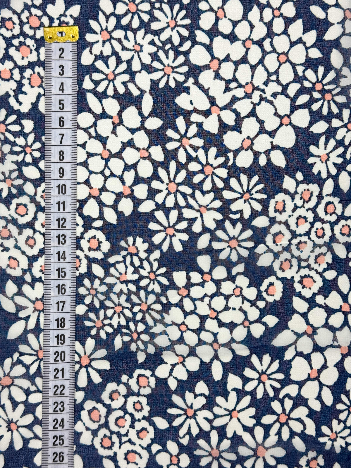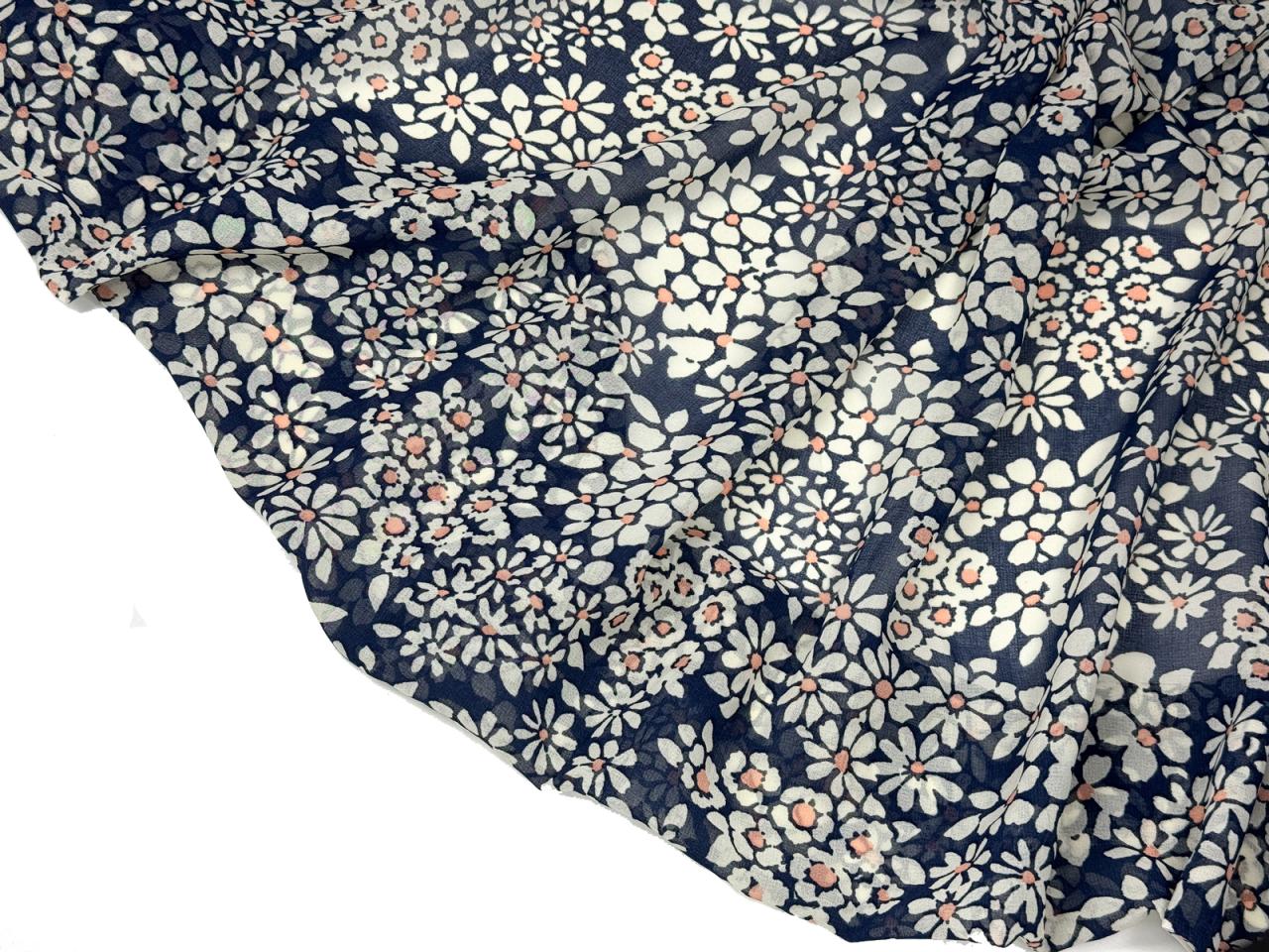 Ткань креп шифон с принтом ромашки. Тонкое, вискозное полотно с фактурой, приятной к коже. Не тянется. Струящееся полотно, закладывается в мелкую складку. Форму не держит. Не дает усадку. Светит, учитывайте это при подборе модели. Производство: Италия.
