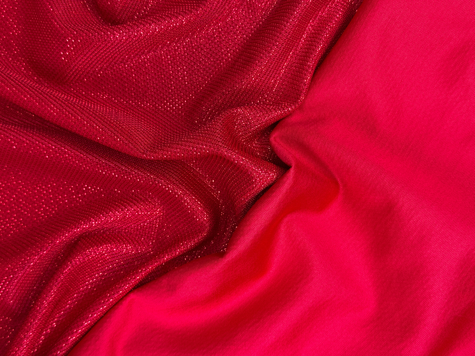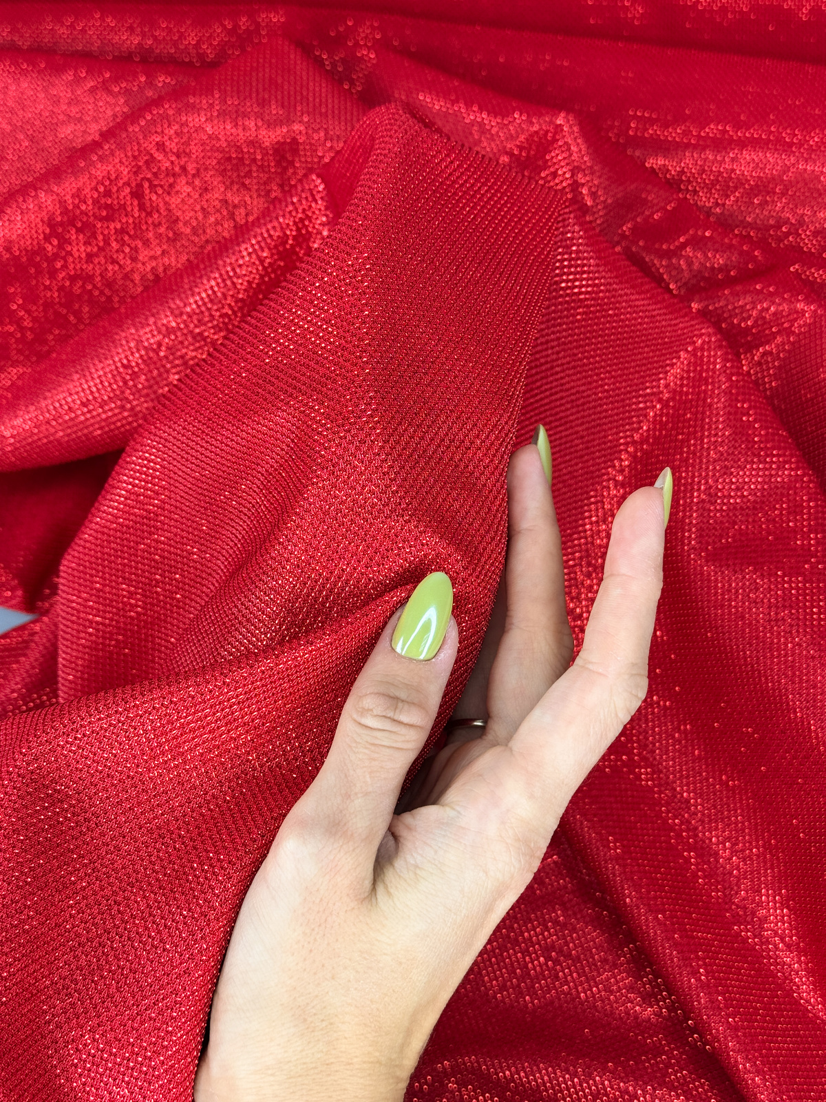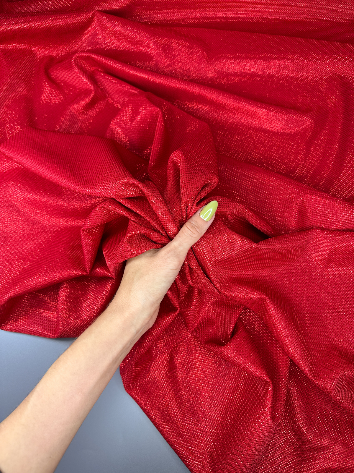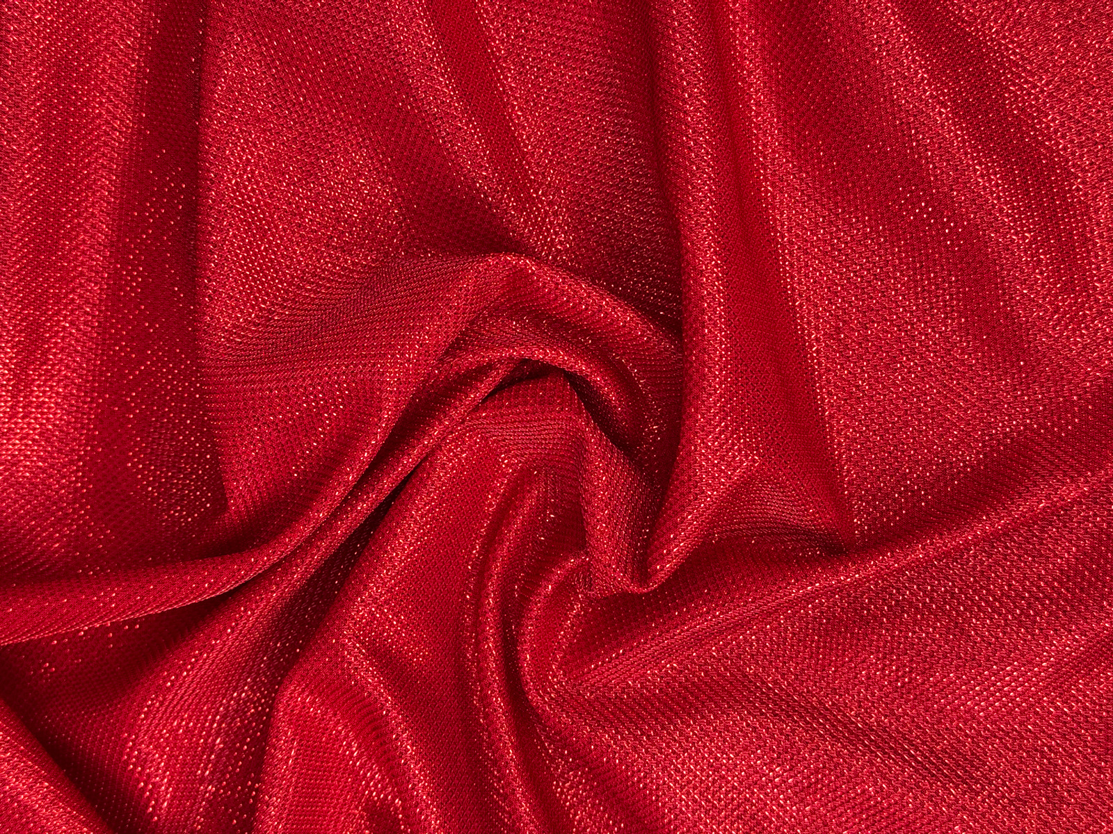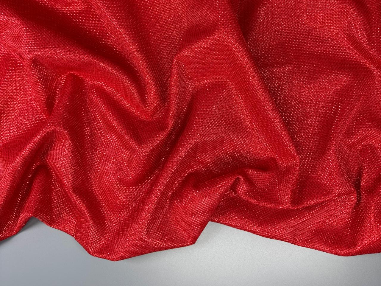 Ткань трикотаж люрекс соты цвет красный. Мягкое эластичное полотно, закладывается в мелкие складки. Лицевая сторона имеет блестящую ромбовидную фактуру, изнанка гладкая. Не держит форму. Не светит. Усадка до 5%.