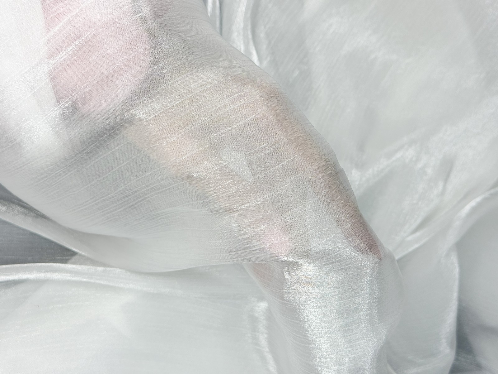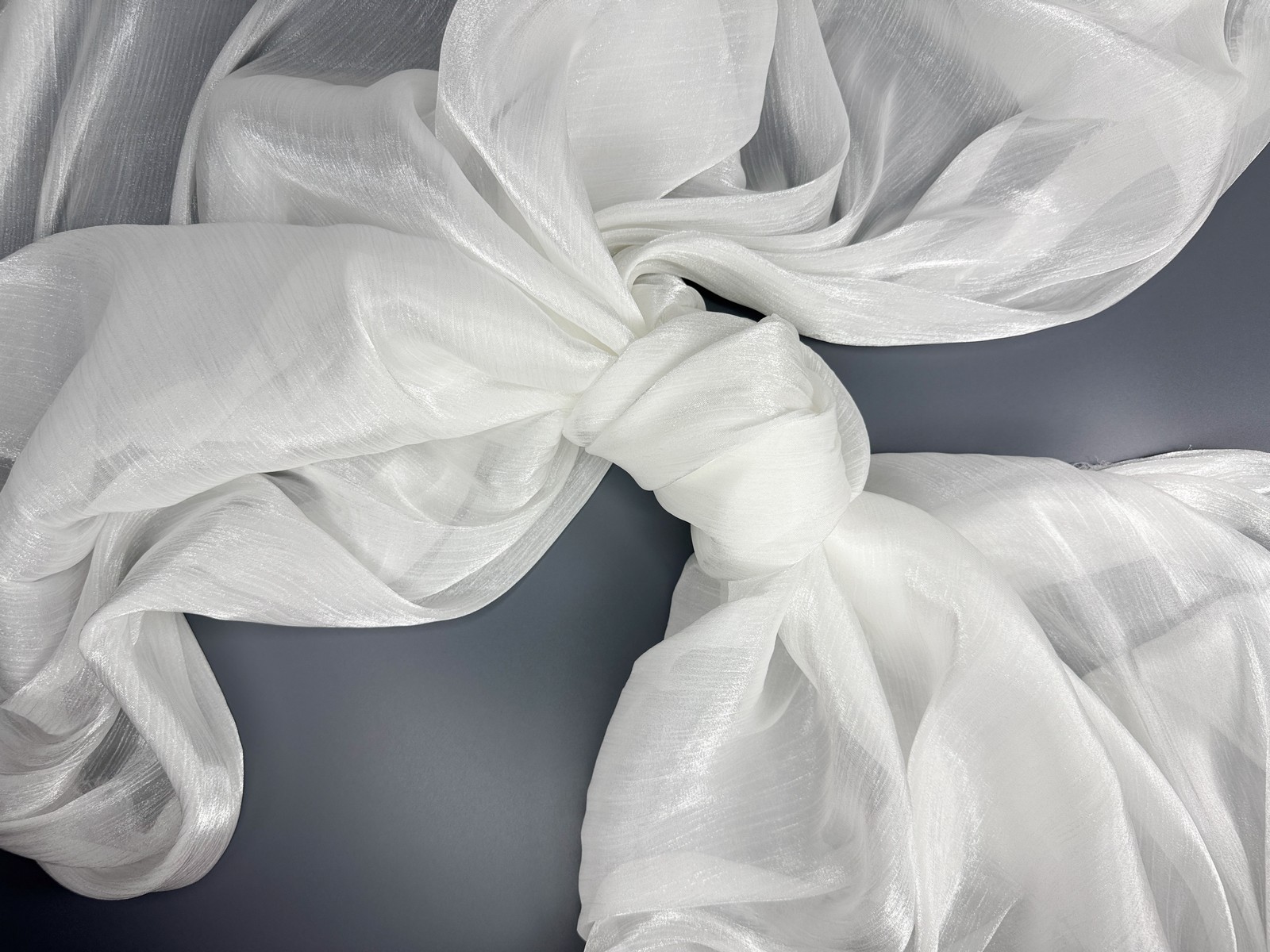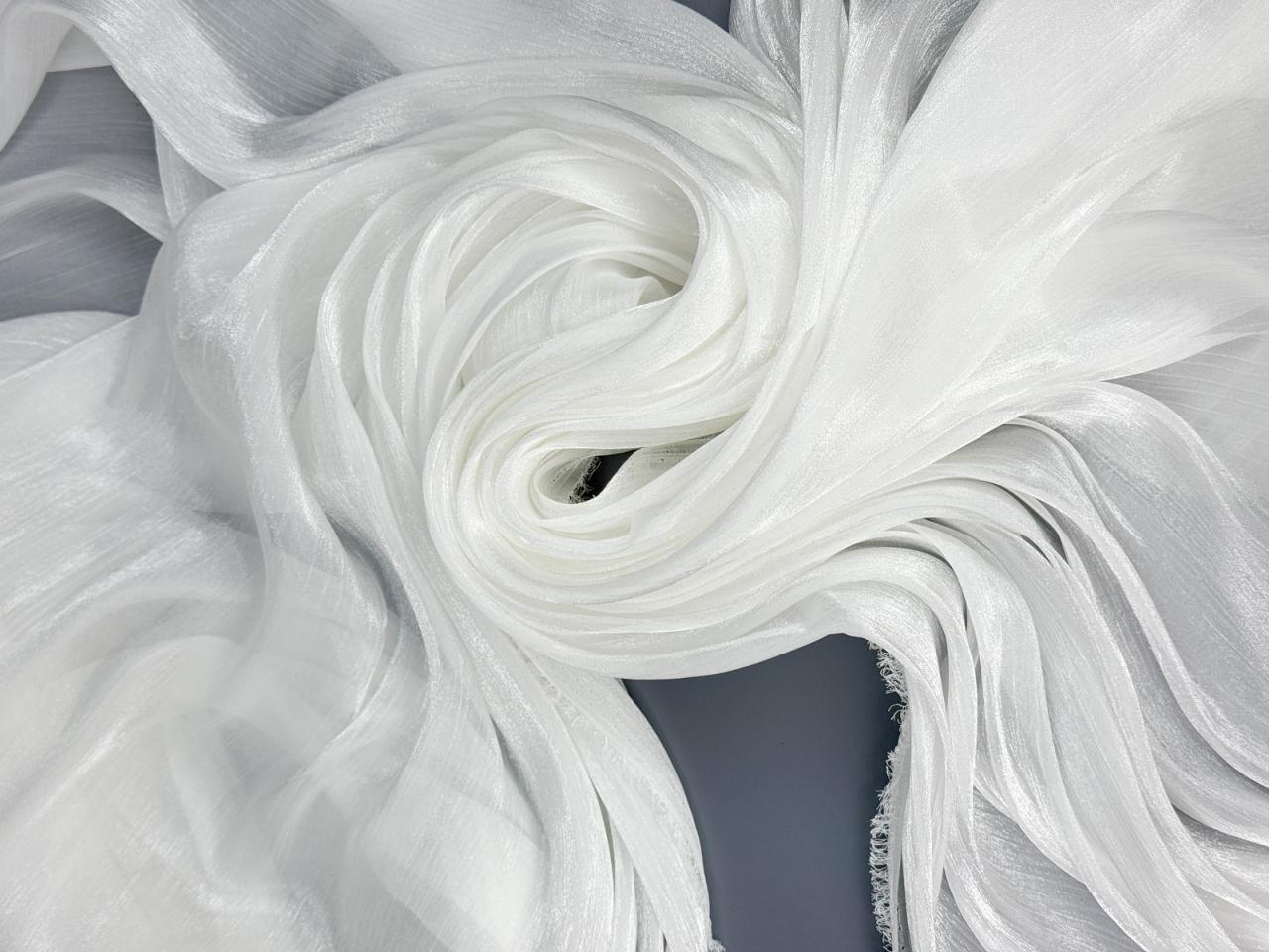 Ткань органза цвет белый с металлизированным блеском. Легкий струящийся материал. Приятная к телу. Драпируется в подвижные складки, ниспадает под собственным весом. Малая упругость, практически не тянется. Легкий жатый эффект. Практически не мнется. Ткань прозрачная, учитывайте это при выборе модели. Возможна усадка до 5%.