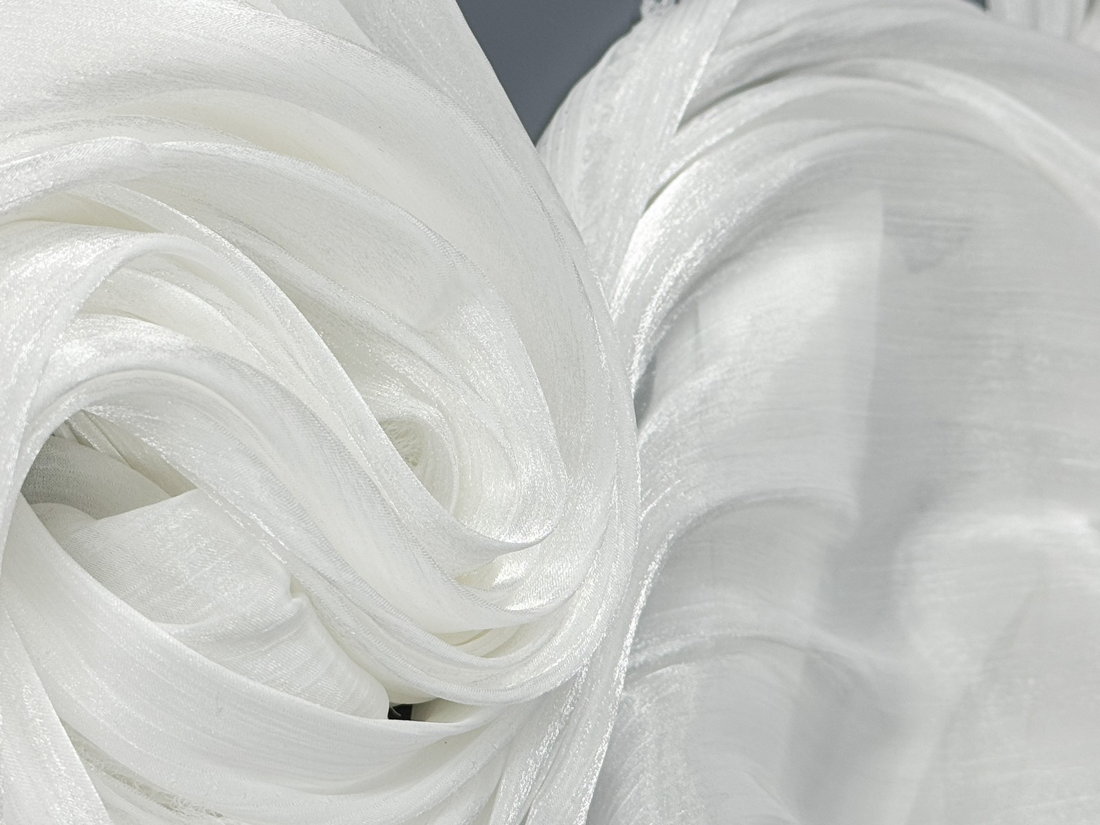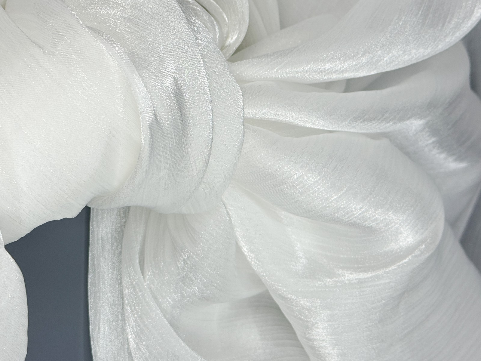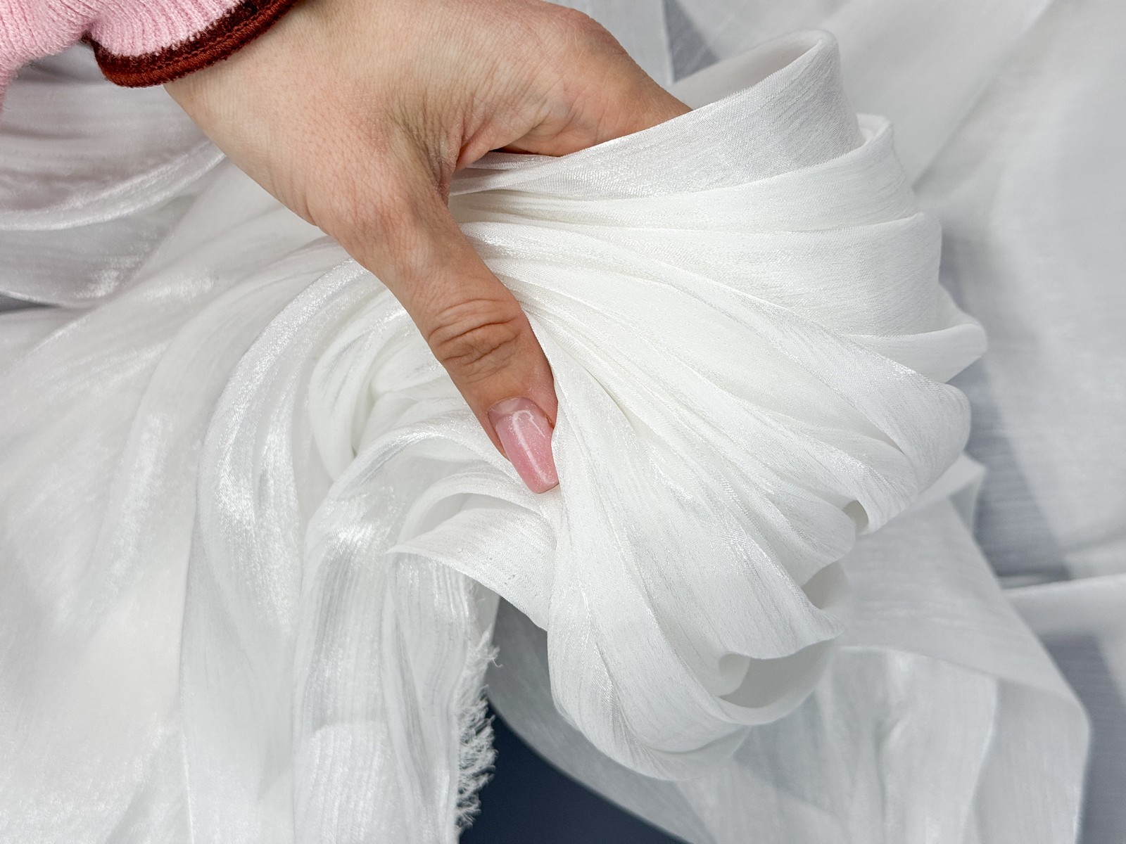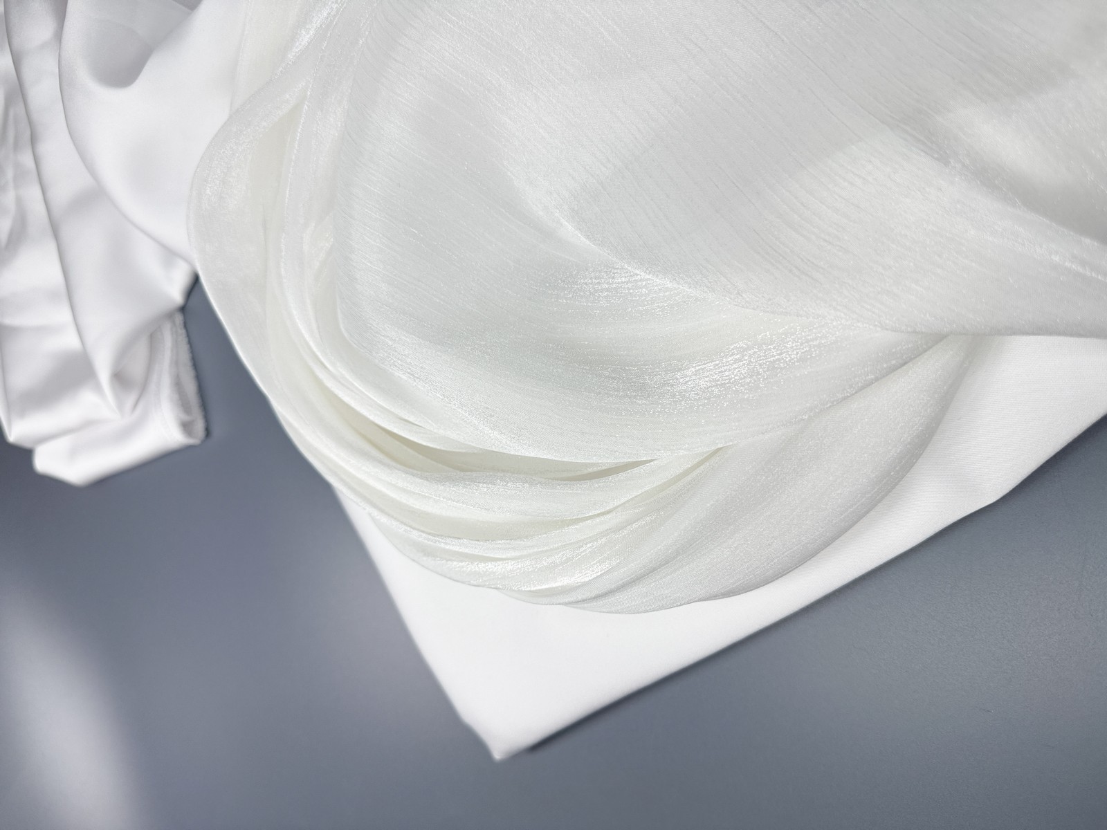 Ткань органза цвет белый с металлизированным блеском. Легкий струящийся материал. Приятная к телу. Драпируется в подвижные складки, ниспадает под собственным весом. Малая упругость, практически не тянется. Легкий жатый эффект. Практически не мнется. Ткань прозрачная, учитывайте это при выборе модели. Возможна усадка до 5%.