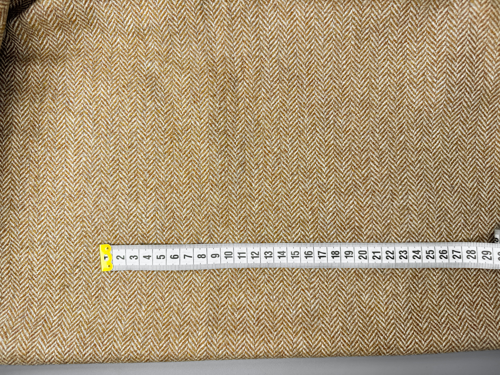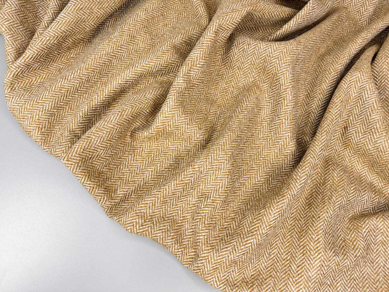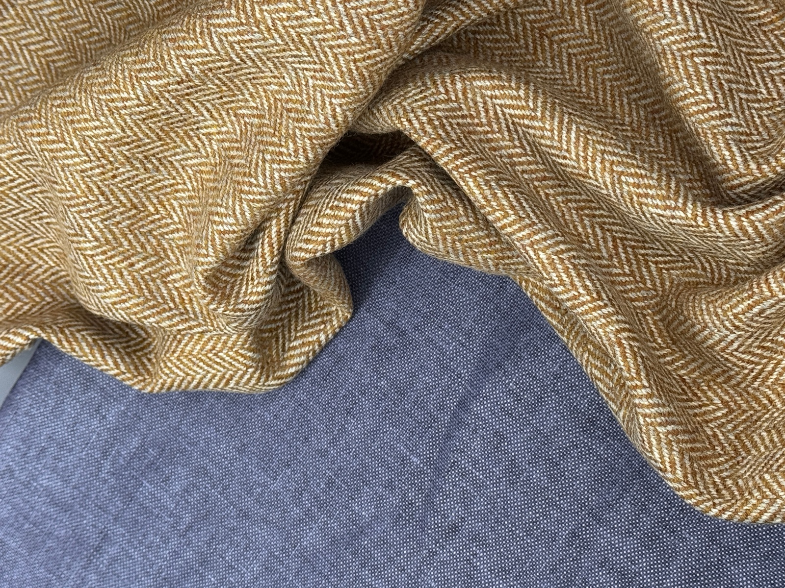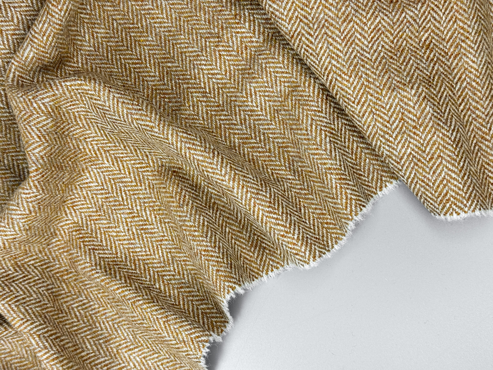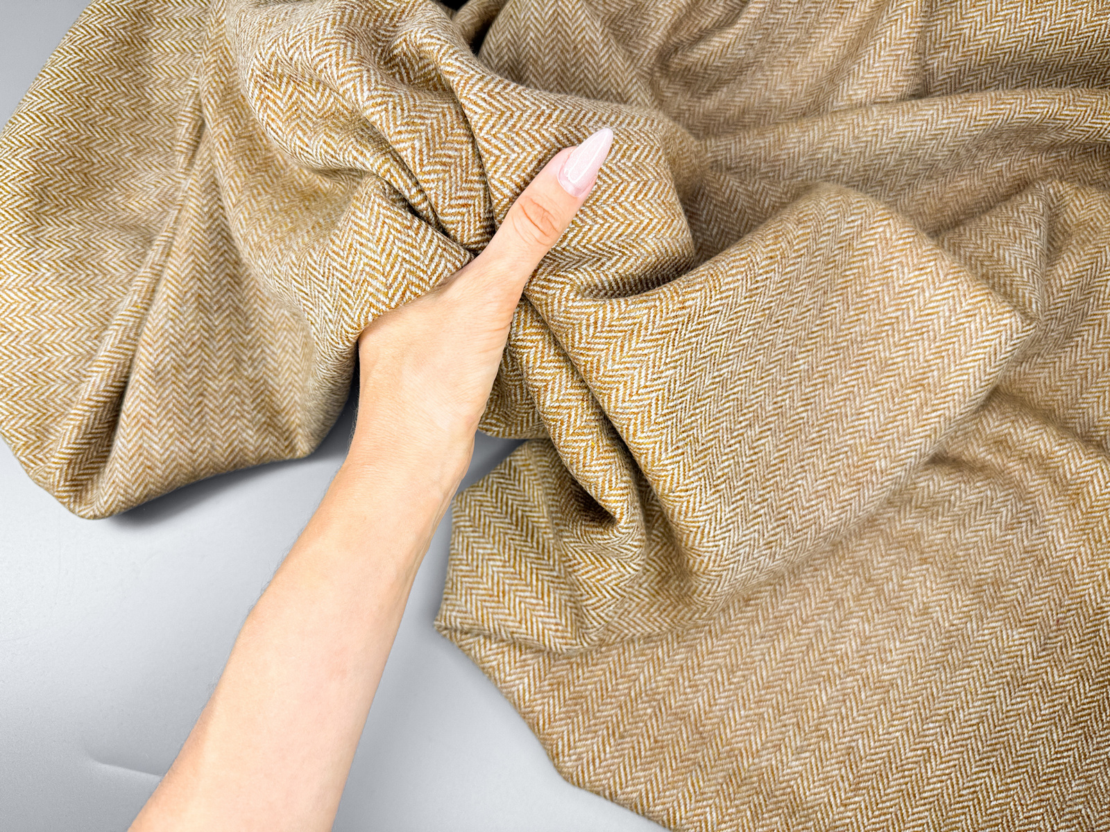 Костюмно-пальтовая ткань цвет елочка Горчица из 100% шерсти. Плотность 390 гр и ширина 140 см. Лицевая сторона мягкая гладкая, изнанка шероховатая и требует подкладки. Закладывается в мягкие пластичные складки. Малая эластичность. Производство Италия.