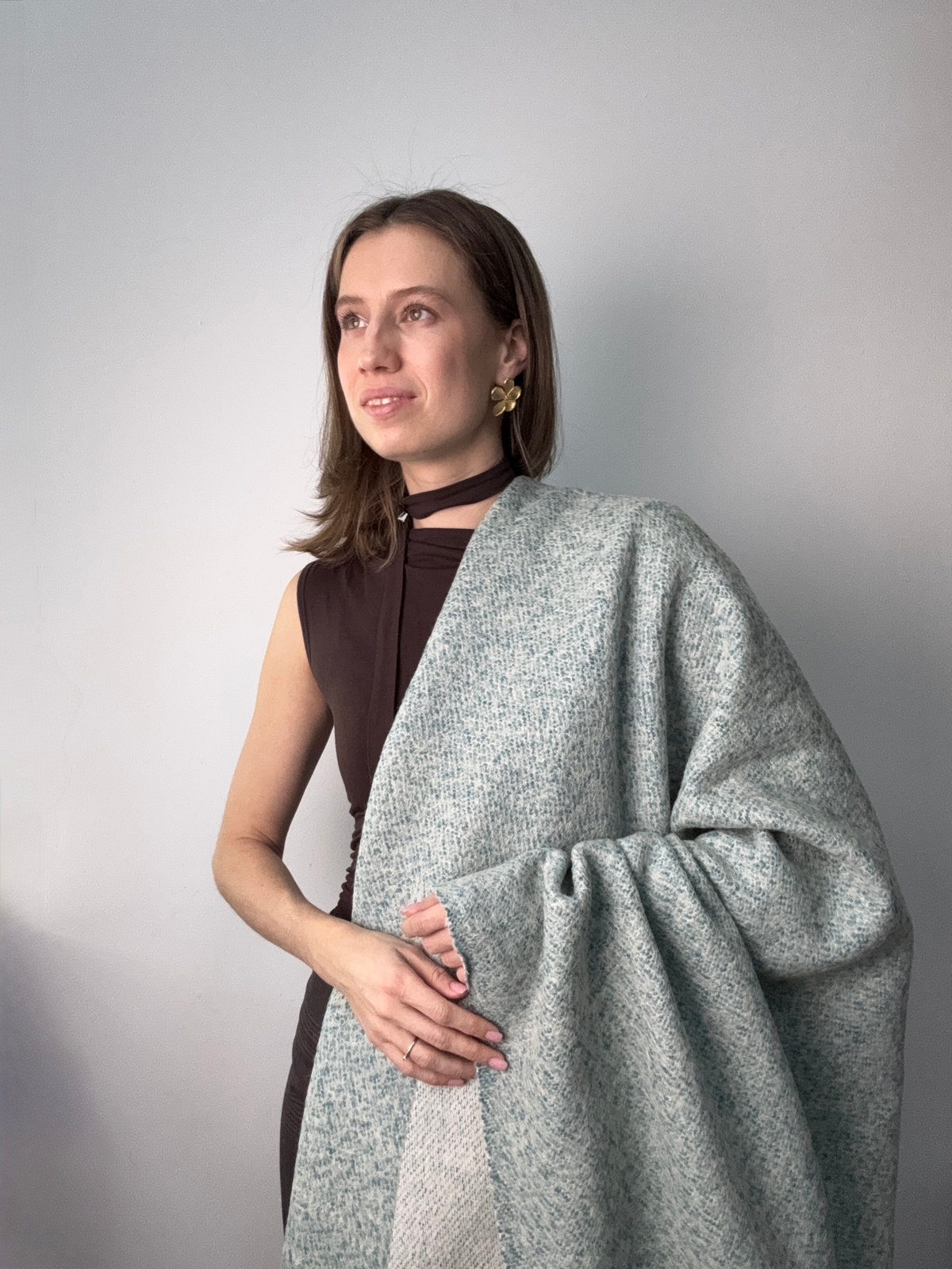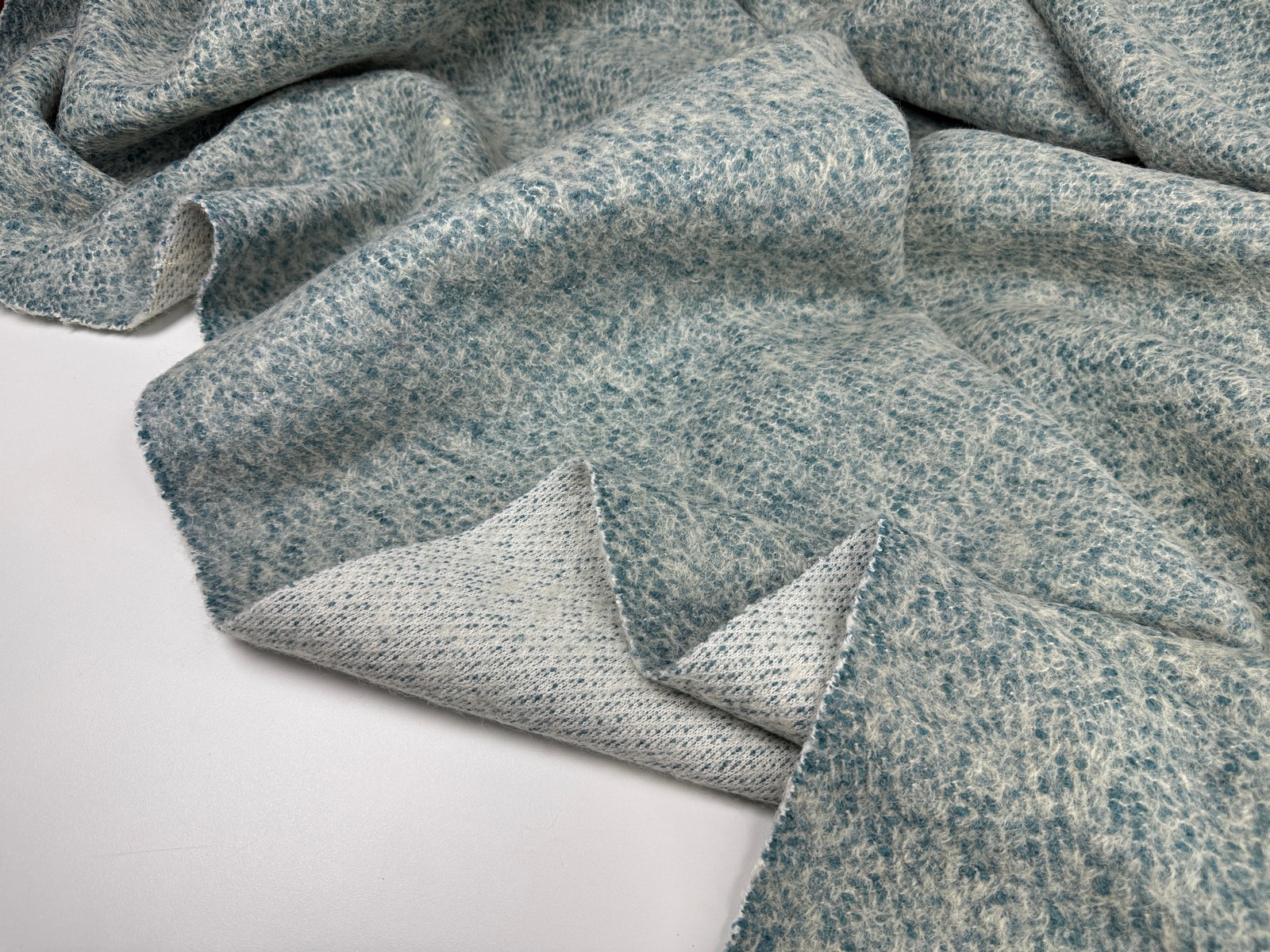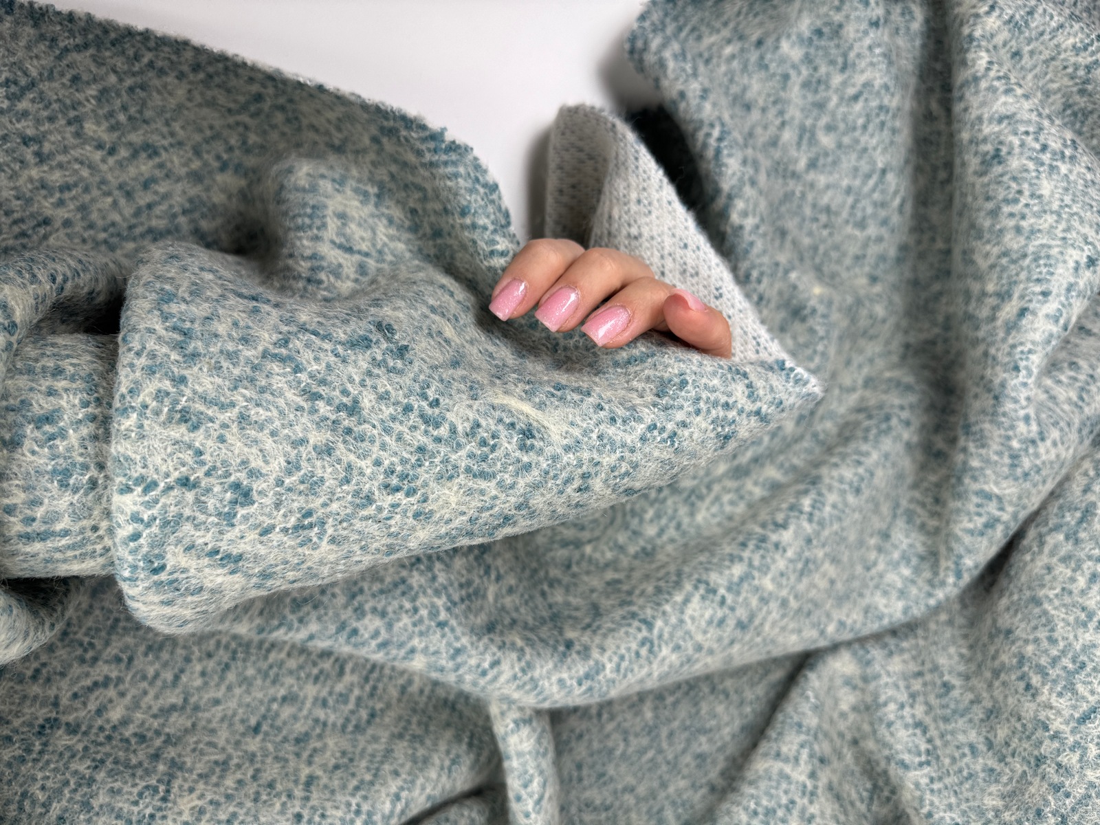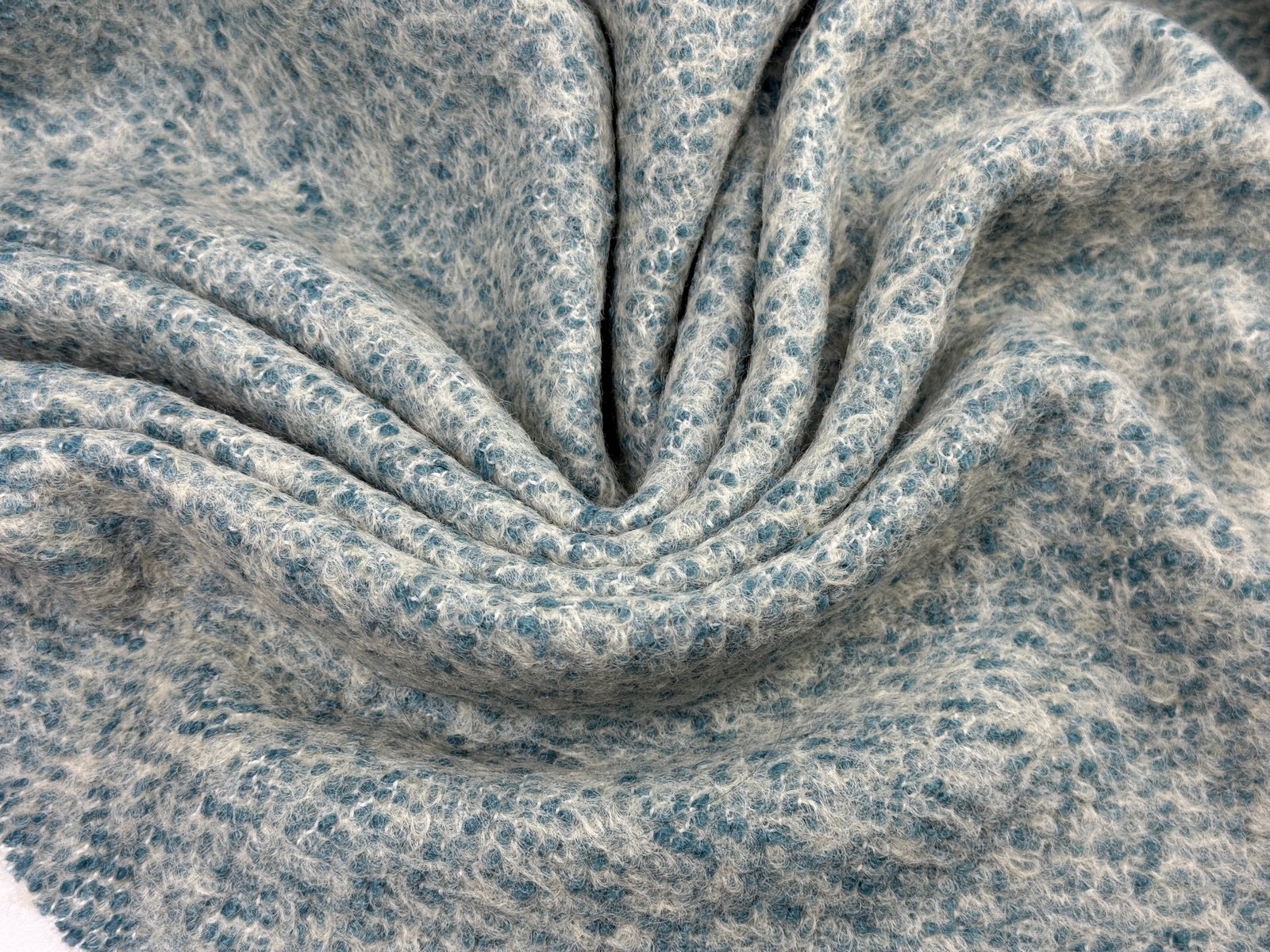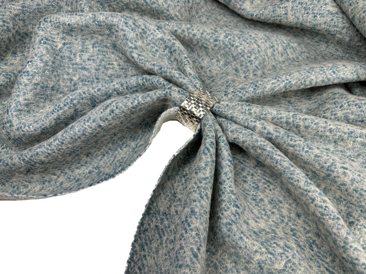 Ткань пальтовая шерсть цвет морская пена. Высокая плотность 450 гр и ширина 140 см. Смесовый состав на основе шерсти и полиэстера. Лицевая сторона мягкая в воздушкой абстрактной фактурой, изнанка шероховатая с маленьким ворсом. Закладывается в мягкие пластичные крупные складки. Не тянется. Малая сминаемость. Быстро восстанавливает форму. Производство Италия.