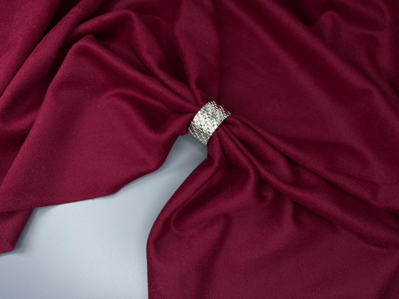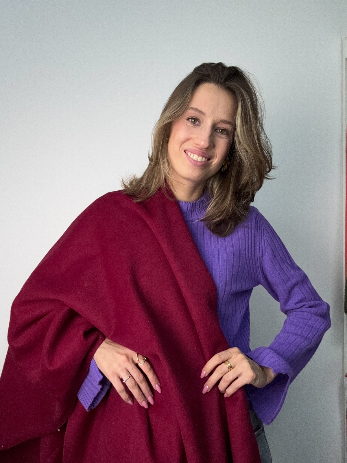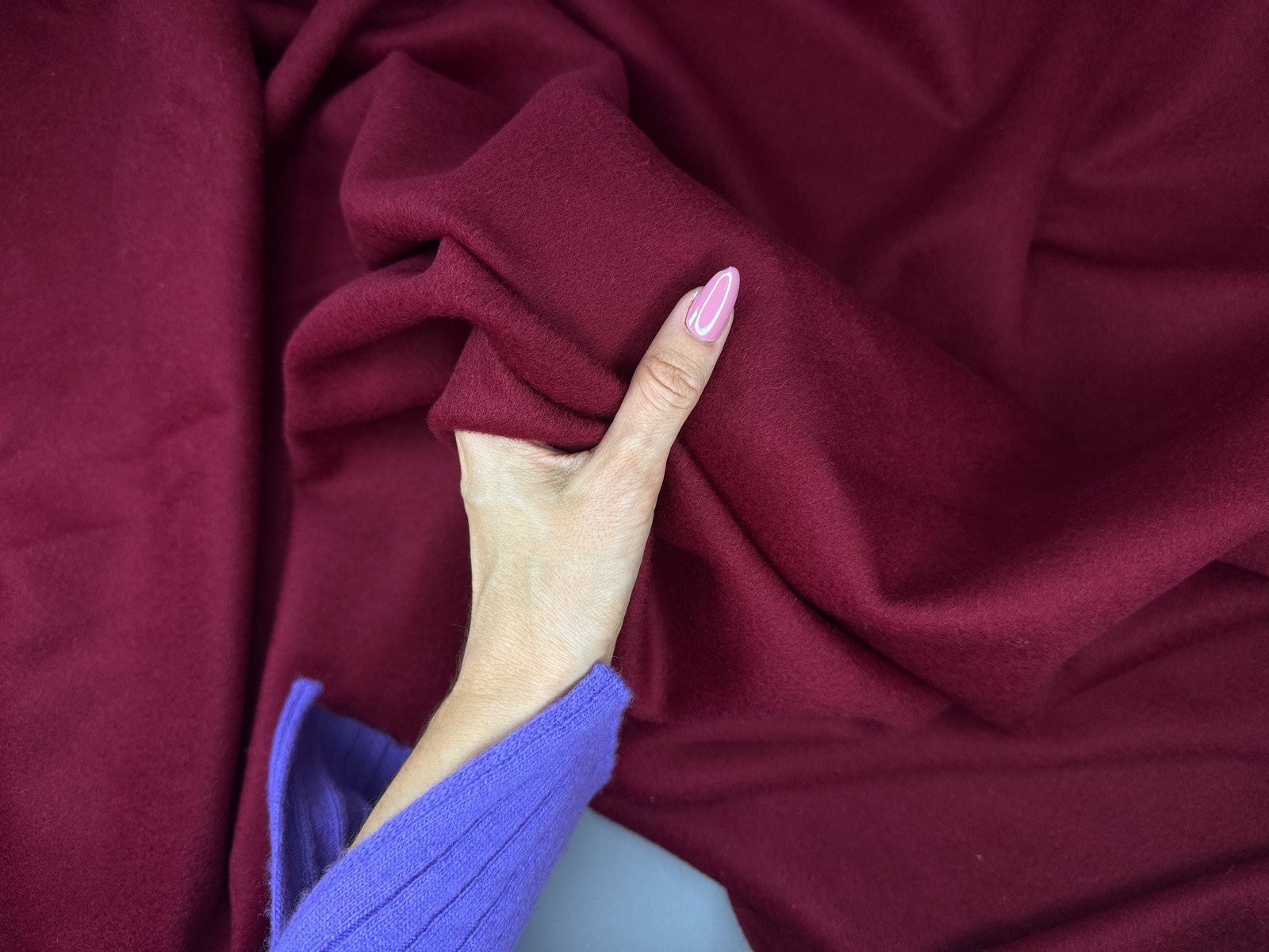 Пальтовая ткань цвет Винный из 100% шерсти. Плотность 450 гр и ширина 140 см. Лицевая сторона с минимальным ворсом, изнанка шероховатая и требует подкладки. Закладывается в мягкие пластичные складки. Малая эластичность. Производство Италия.
