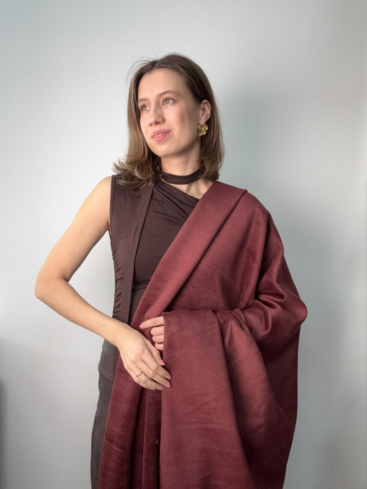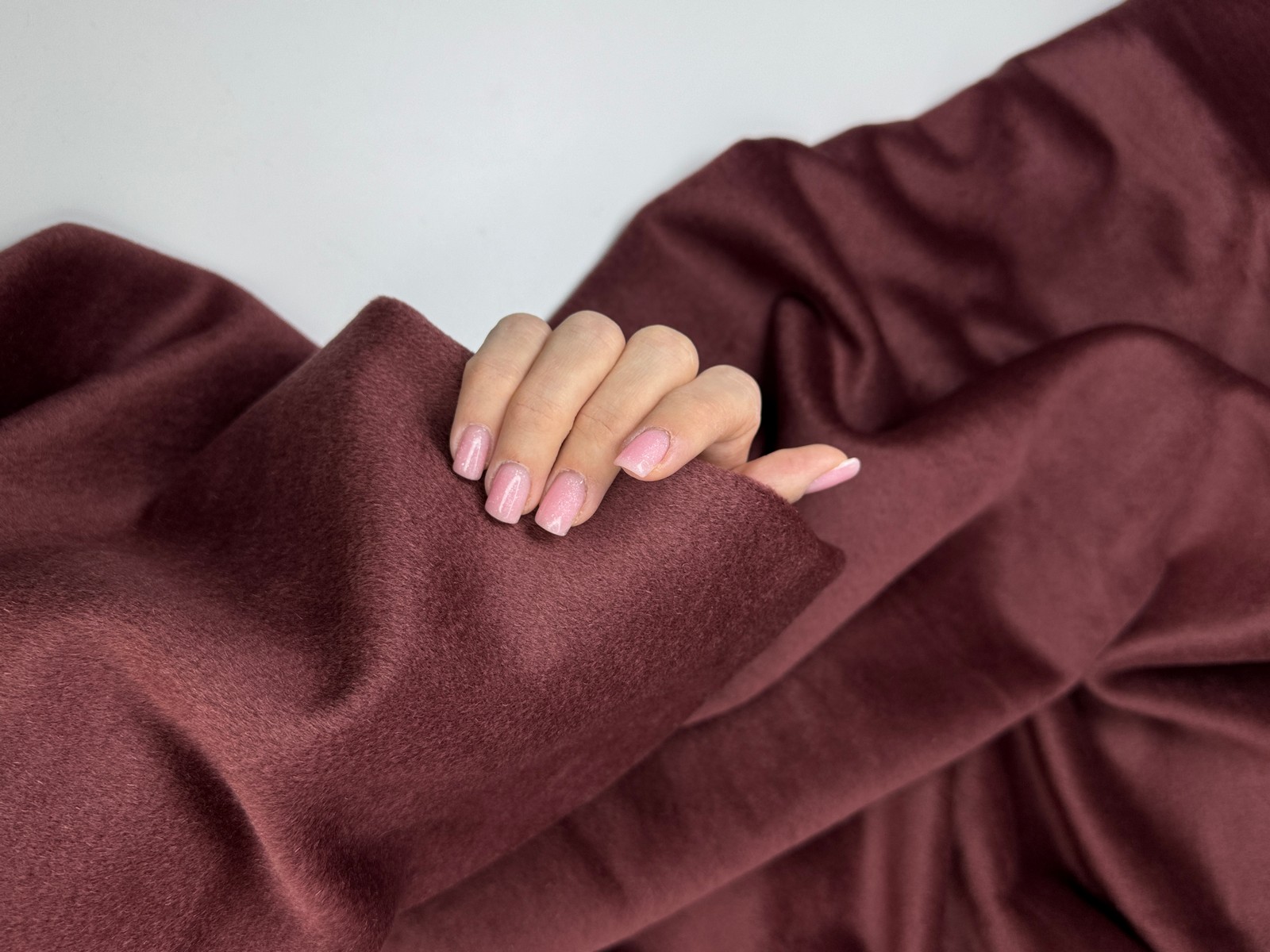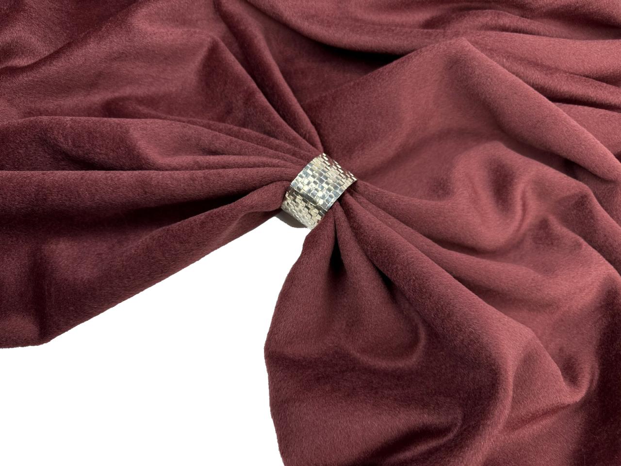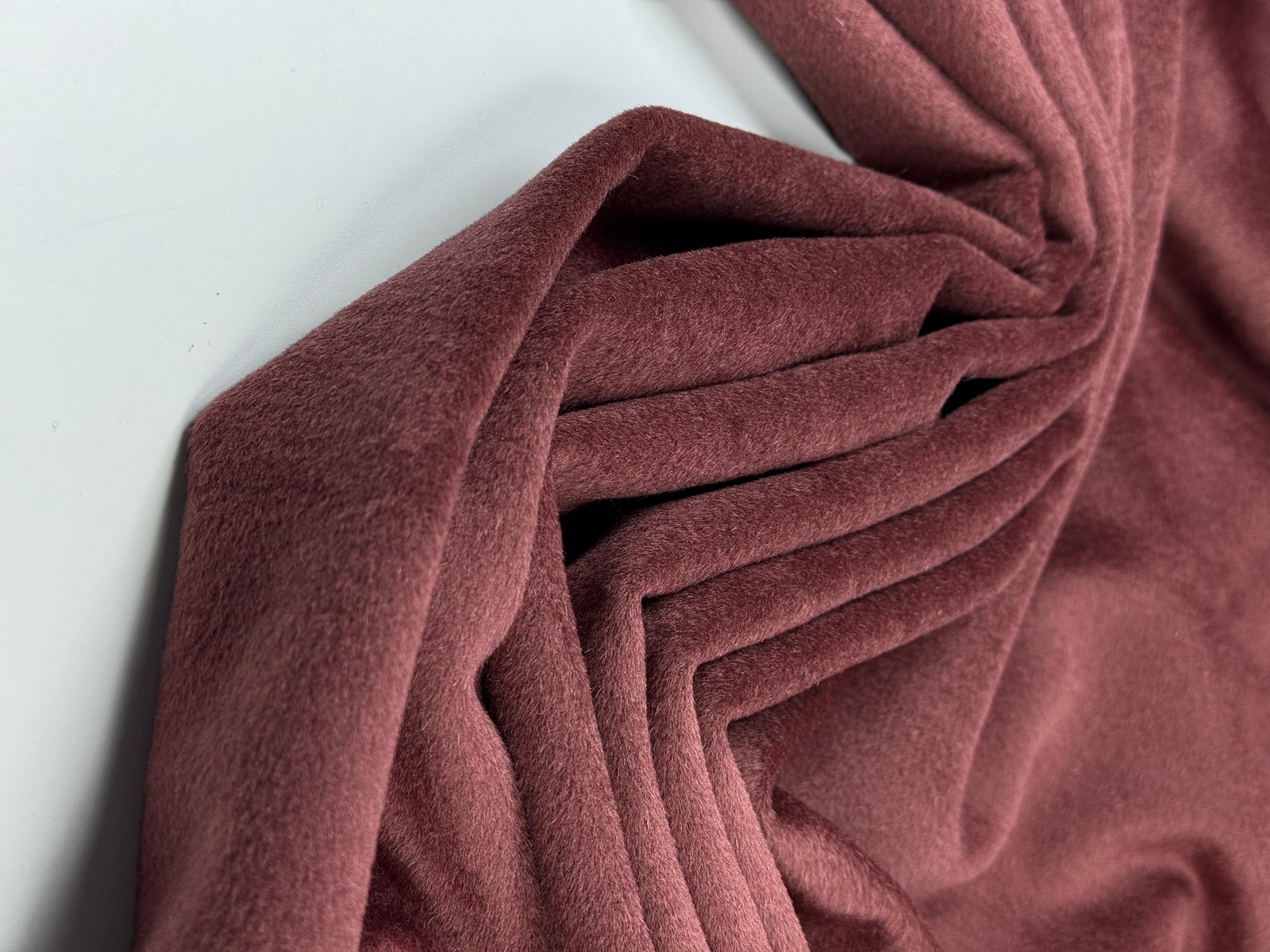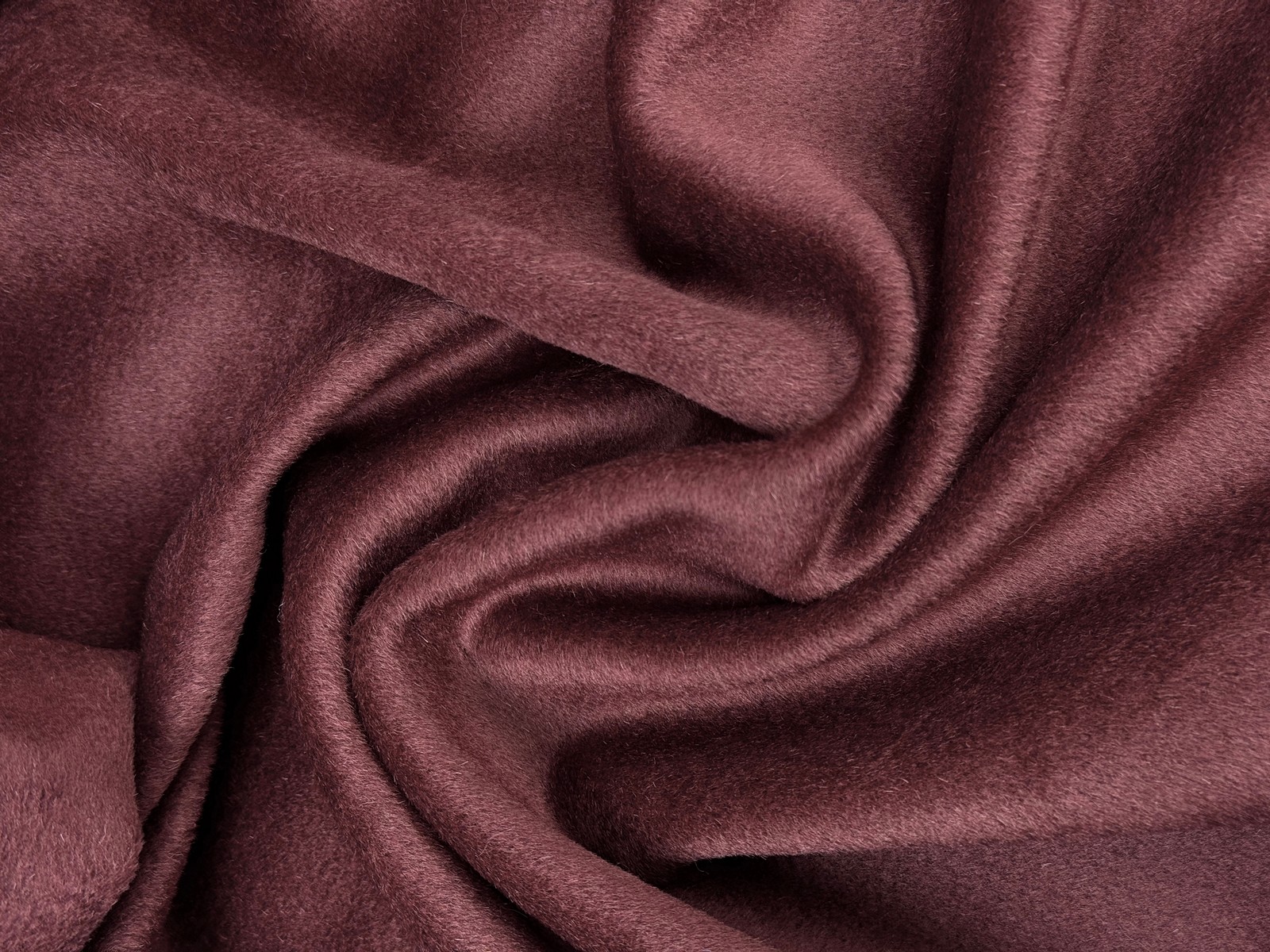 Ткань пальтовая шерсть цвет вишня в шоколаде. Высокая плотность 450 гр и ширина 140 см. Смесовый состав на основе шерсти и полиэстера. Лицевая сторона мягкая в маленьким ворсом, изнанка шероховатая и требует подкладки. Закладывается в мягкие пластичные крупные складки. Не тянется. Малая сминаемость. Быстро восстанавливает форму. Производство Италия.