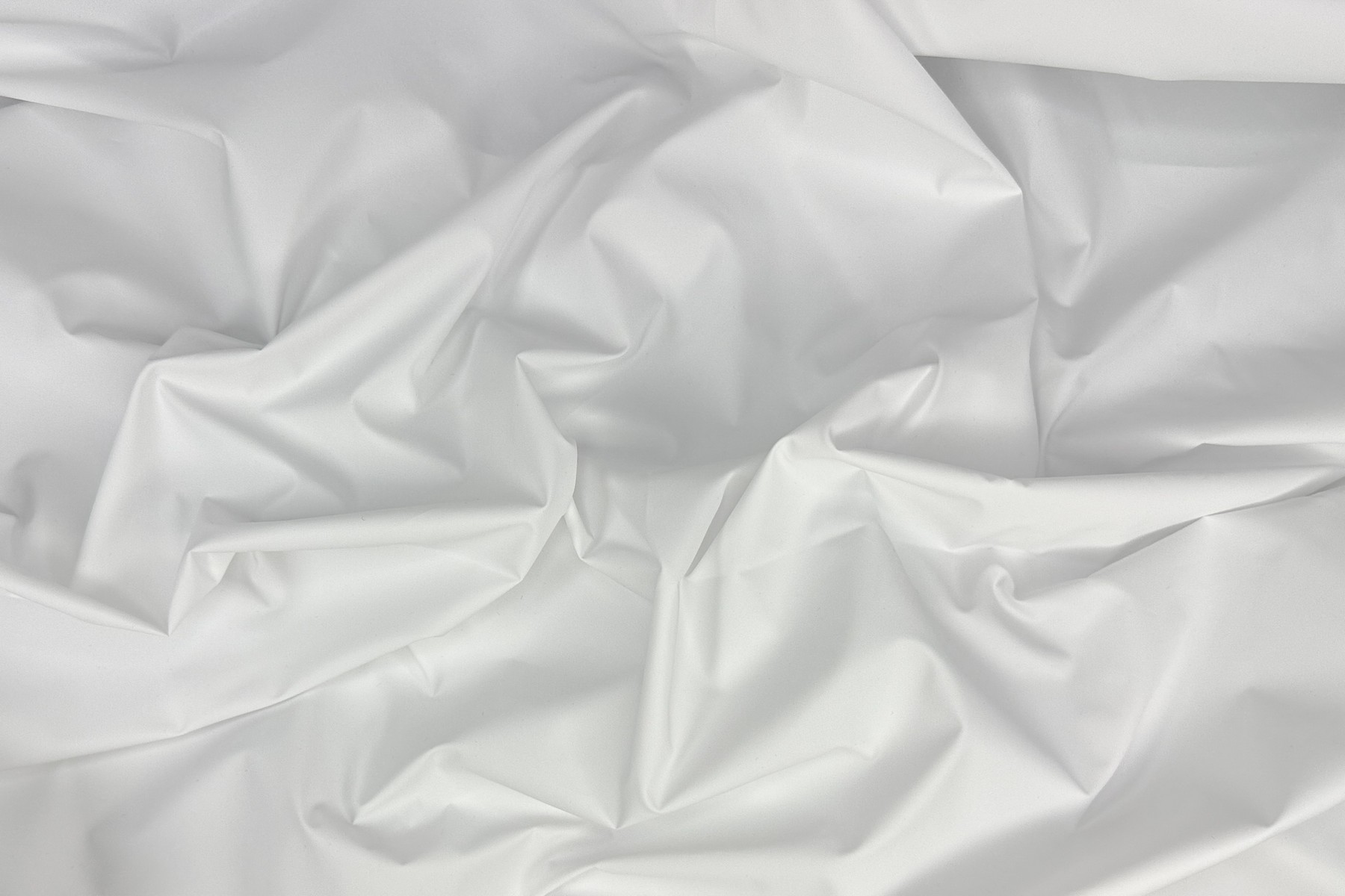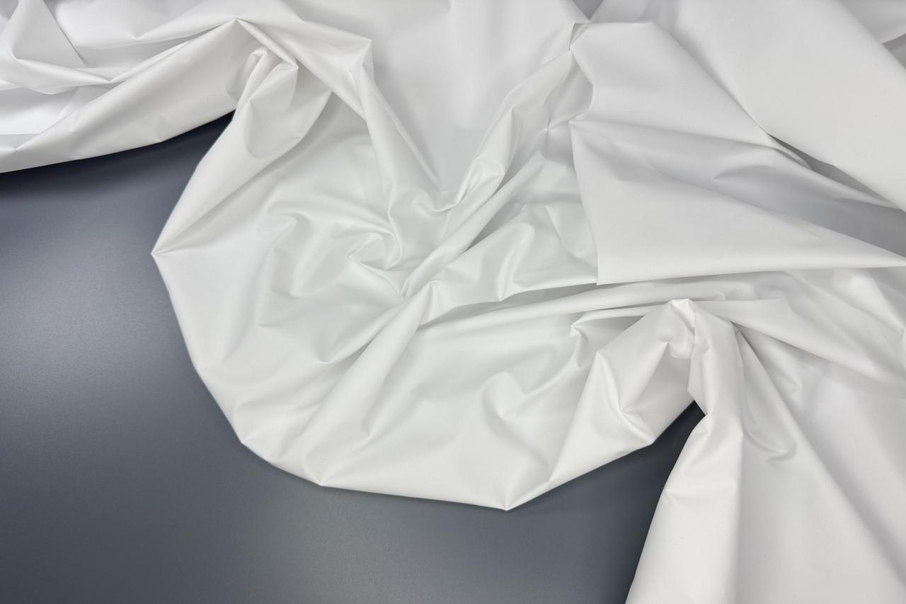Ткань плащевая цвет белый. Синтетическое полотно с водоотталкивающей пропиткой. Не тянется. Средняя сминаемость. Лицевая сторона с матовым блеском. Можно использовать, как самостоятельный материал, так и простегивать вместе с утеплителем для получения более теплого варианта. Закладывается в средние статичные складки.