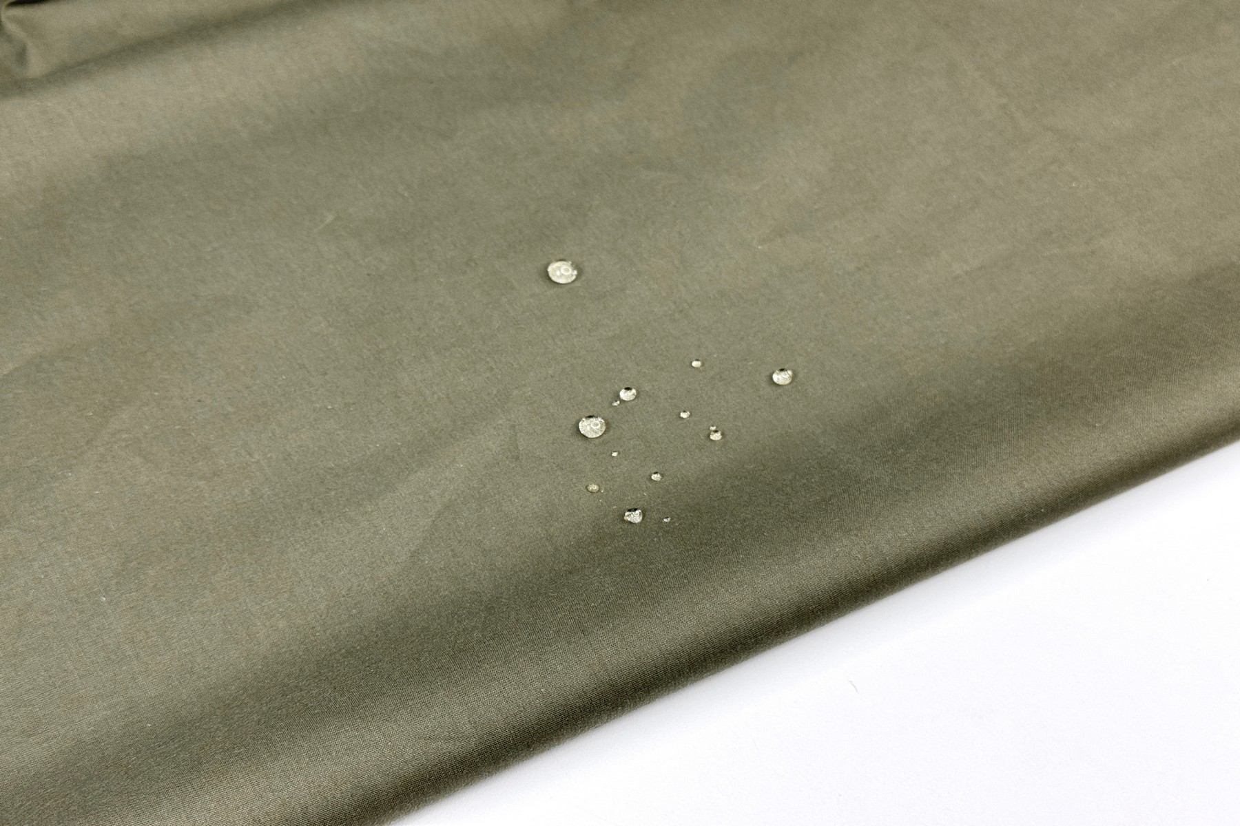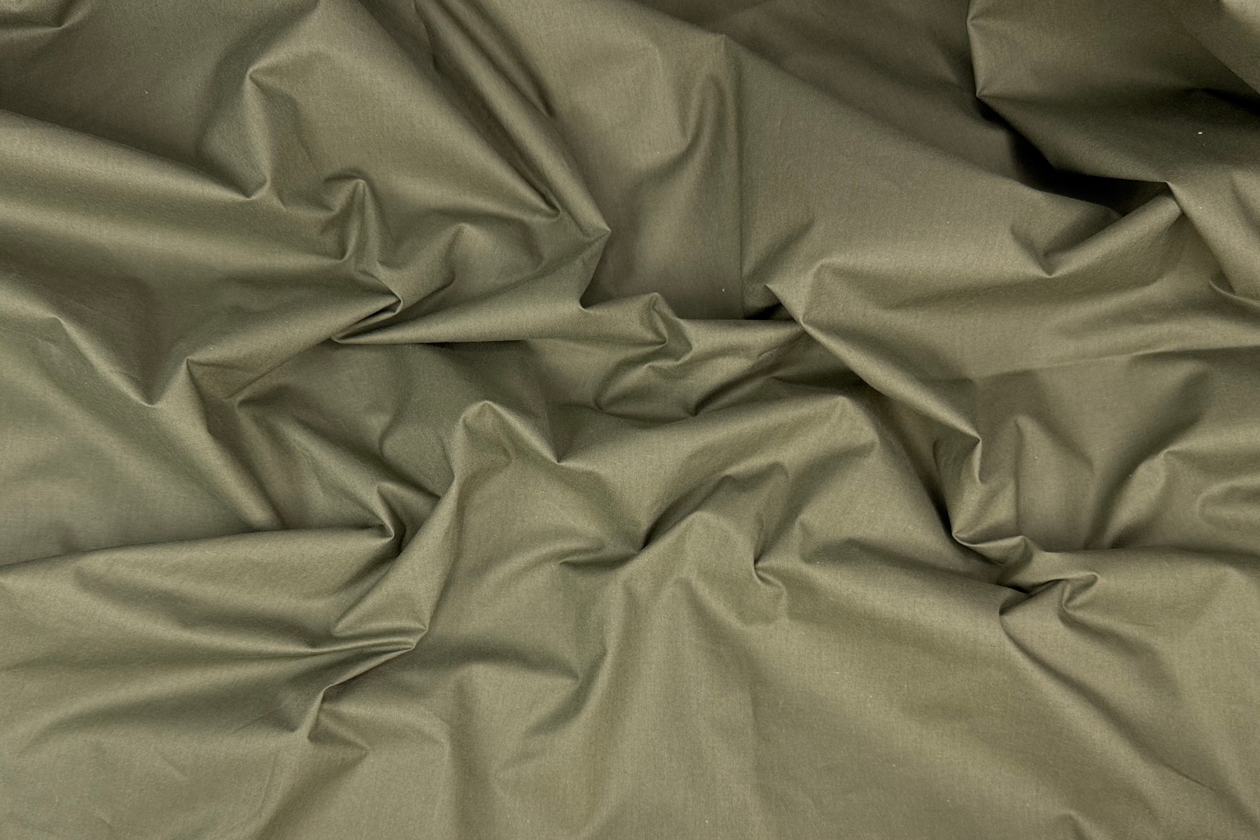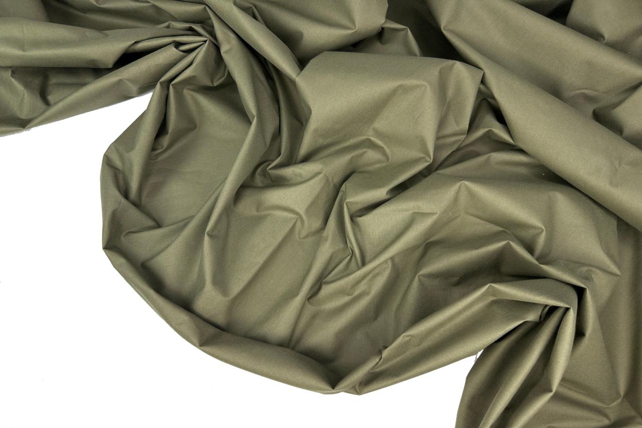 Ткань плащевая цвет хаки. Синтетическое полотно с водоотталкивающей пропиткой. Малая растяжимость. Средняя сминаемость. Лицевая сторона матовая. Можно использовать, как самостоятельный материал, так и простегивать вместе с утеплителем для получения более теплого варианта. Закладывается в средние статичные складки.