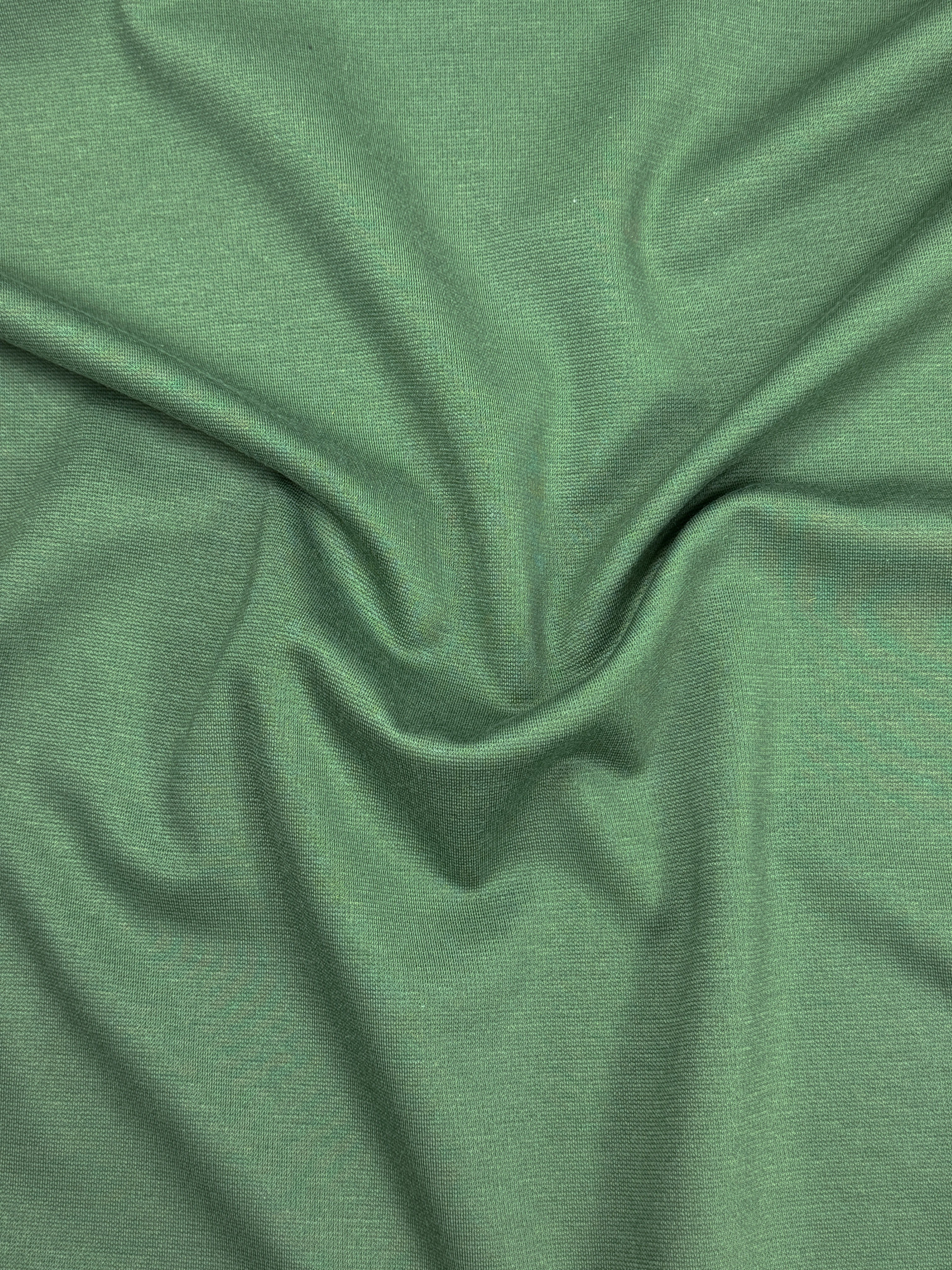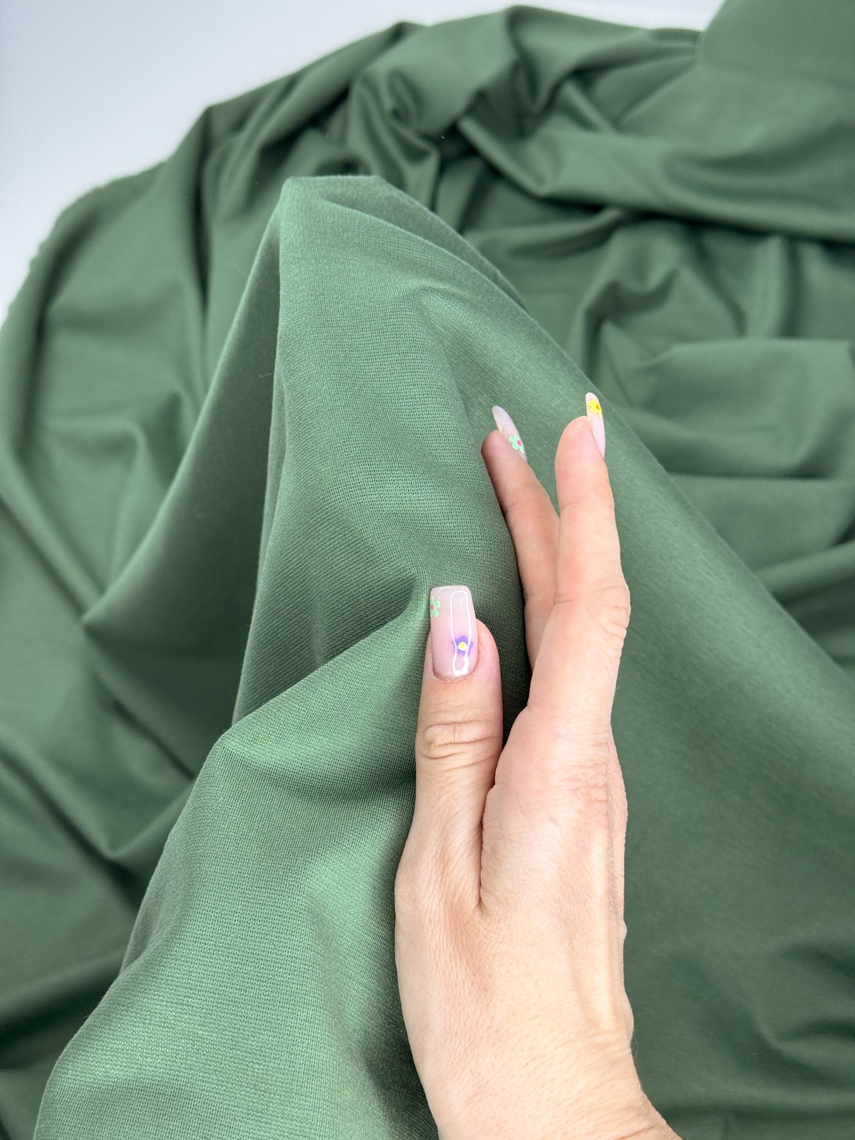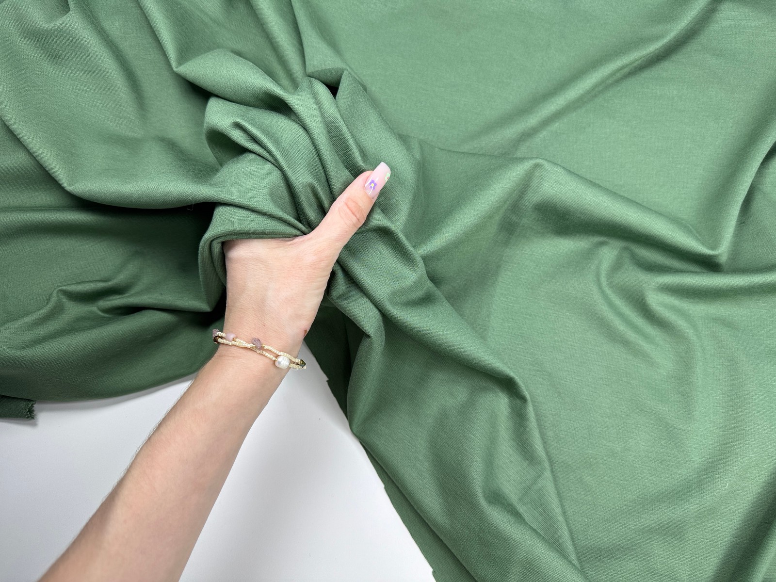 Трикотаж на основе вискозы джерси цвет хаки. Легкое полотно приятное к телу. Высокая эластичность. Закладывается в мягкие подвижные складки. Имеет матовую лицевую сторону. Ширина 150 см. плотность 190 гр.
