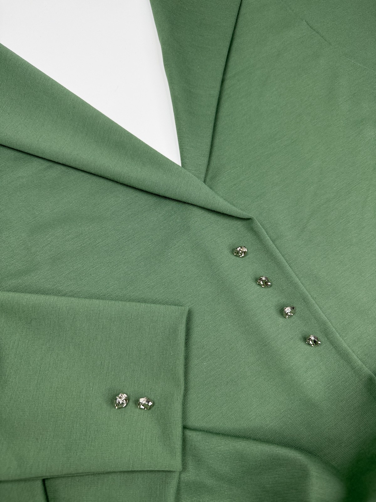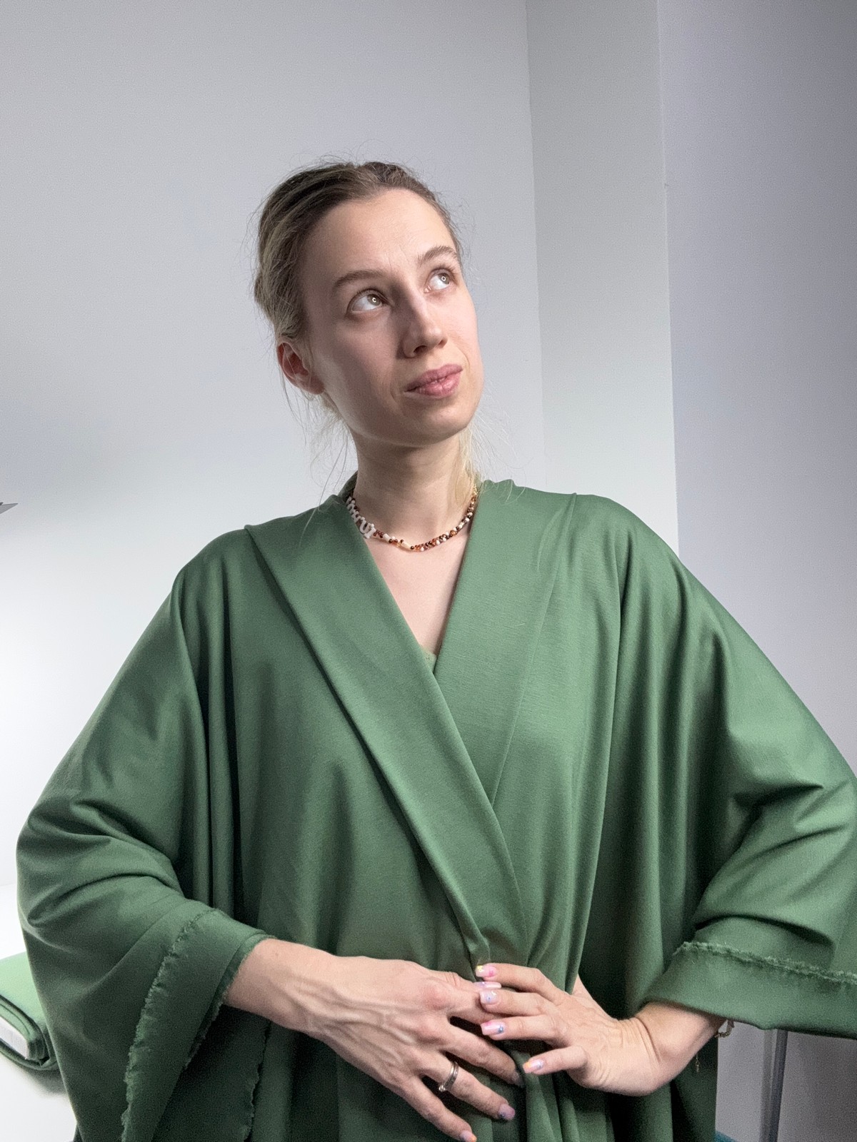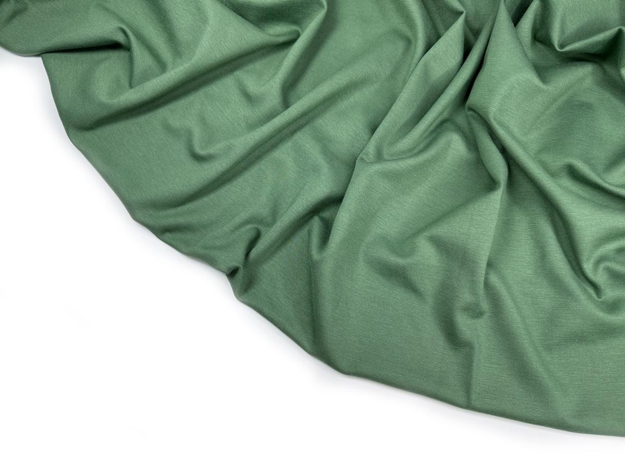 Трикотаж на основе вискозы джерси цвет хаки. Легкое полотно приятное к телу. Высокая эластичность. Закладывается в мягкие подвижные складки. Имеет матовую лицевую сторону. Ширина 150 см. плотность 190 гр.