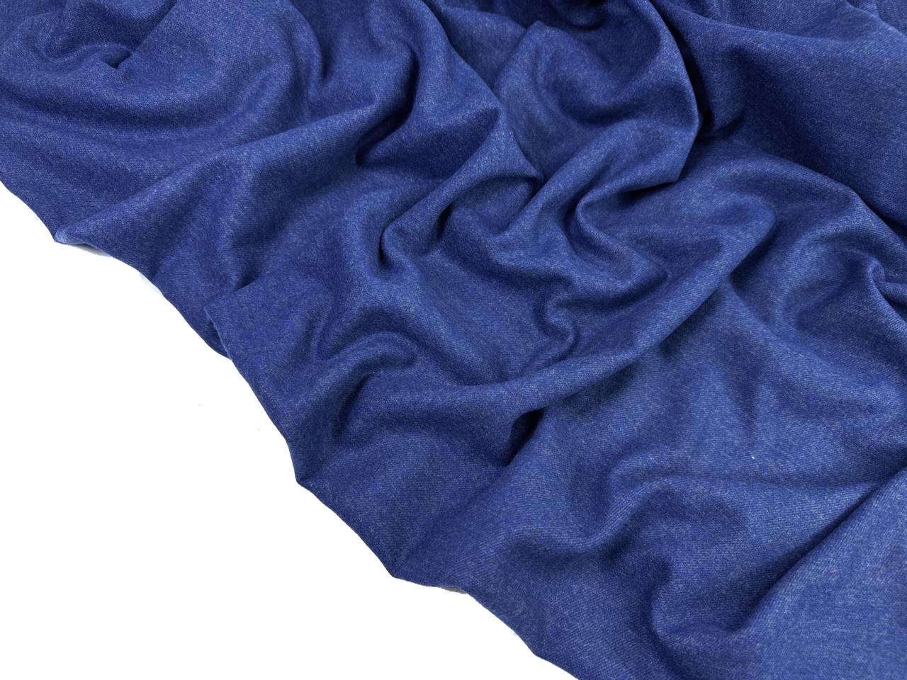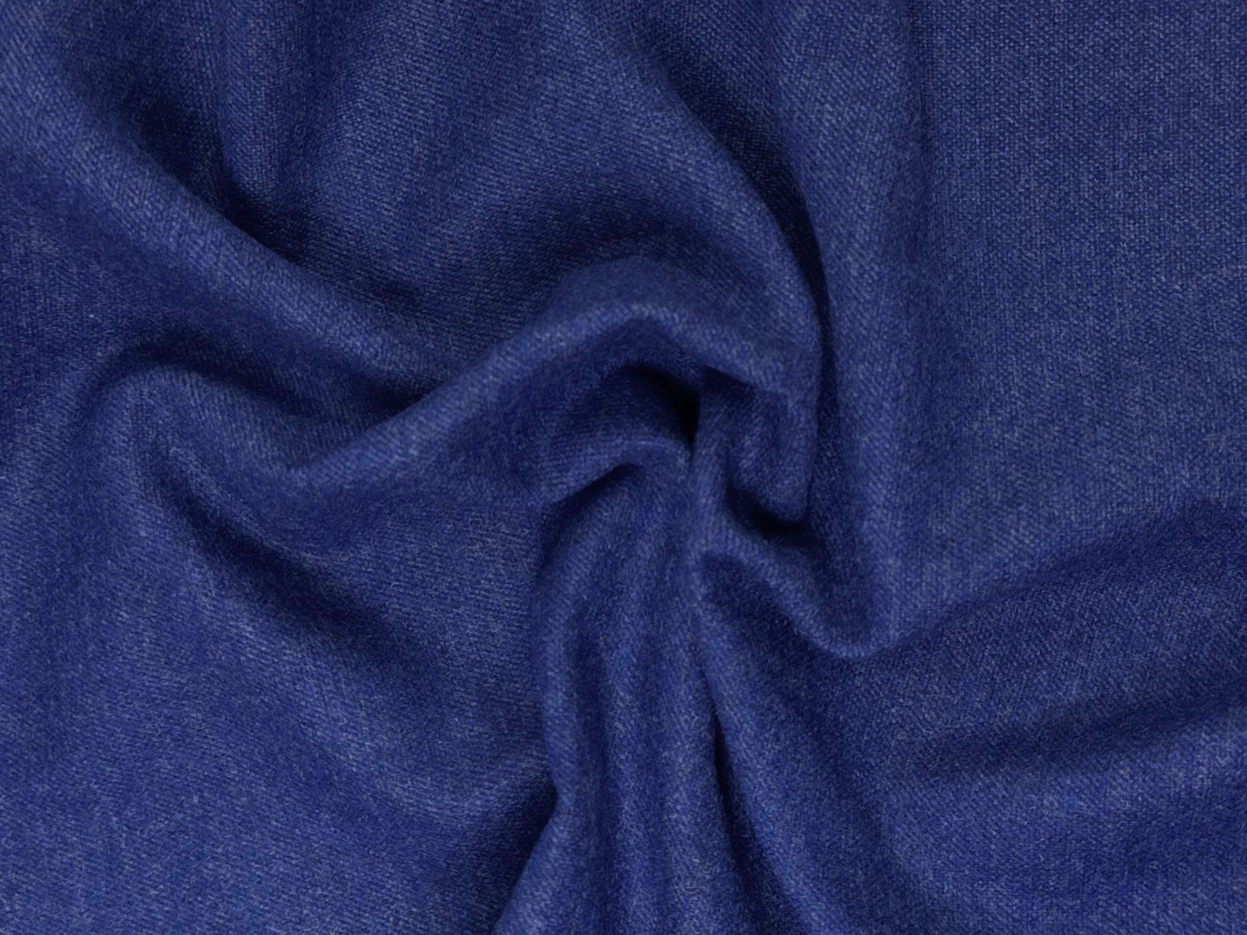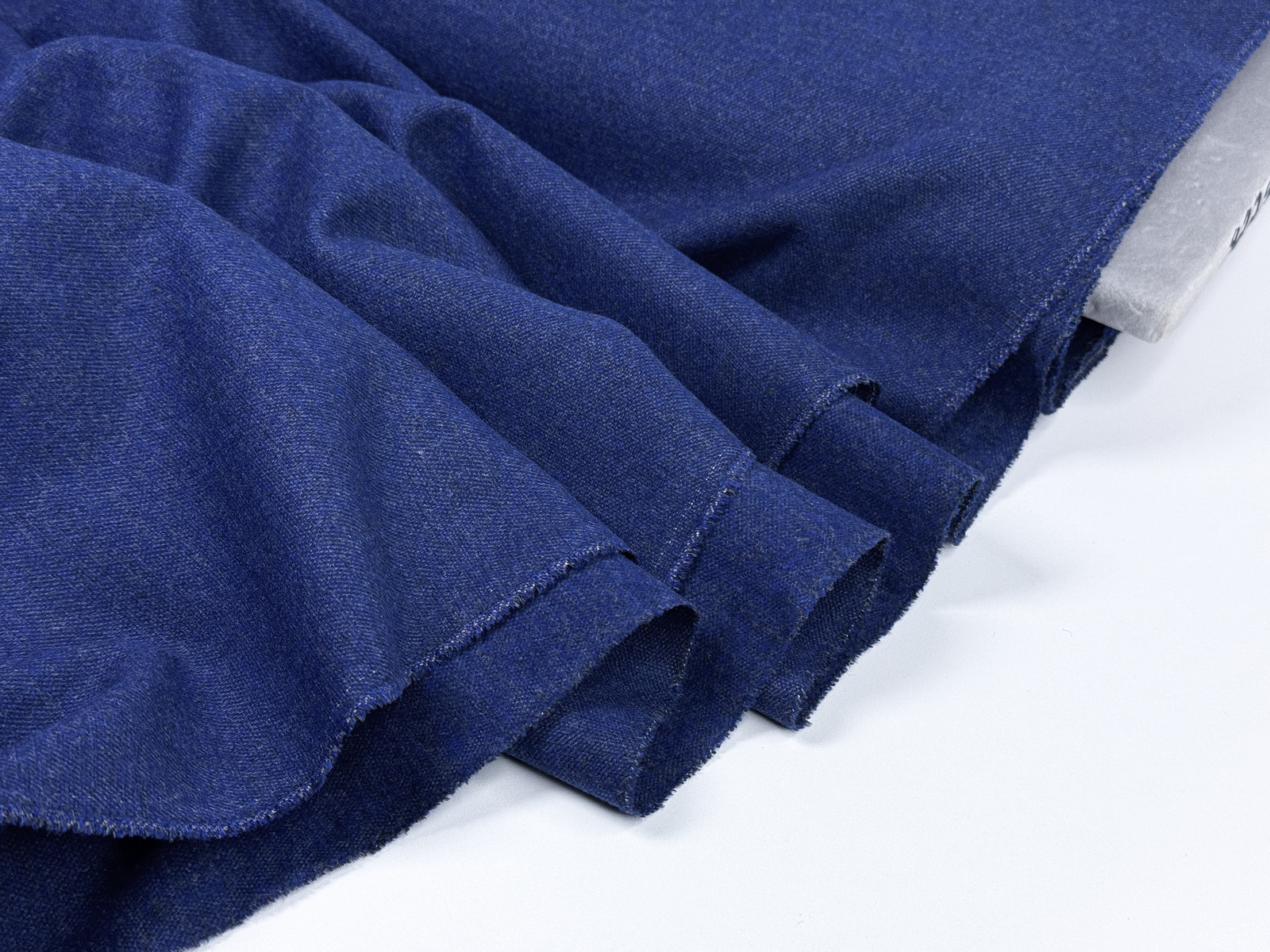 Ткань костюмная цвет синий меланж. Лицевая сторона немного пушиста, изнанка гладкая. Выраженное диагональное плетение. Закладывается в мягкие складки. Обладает малой сминаемостью. Не тянется, учитывайте это при выборе модели.