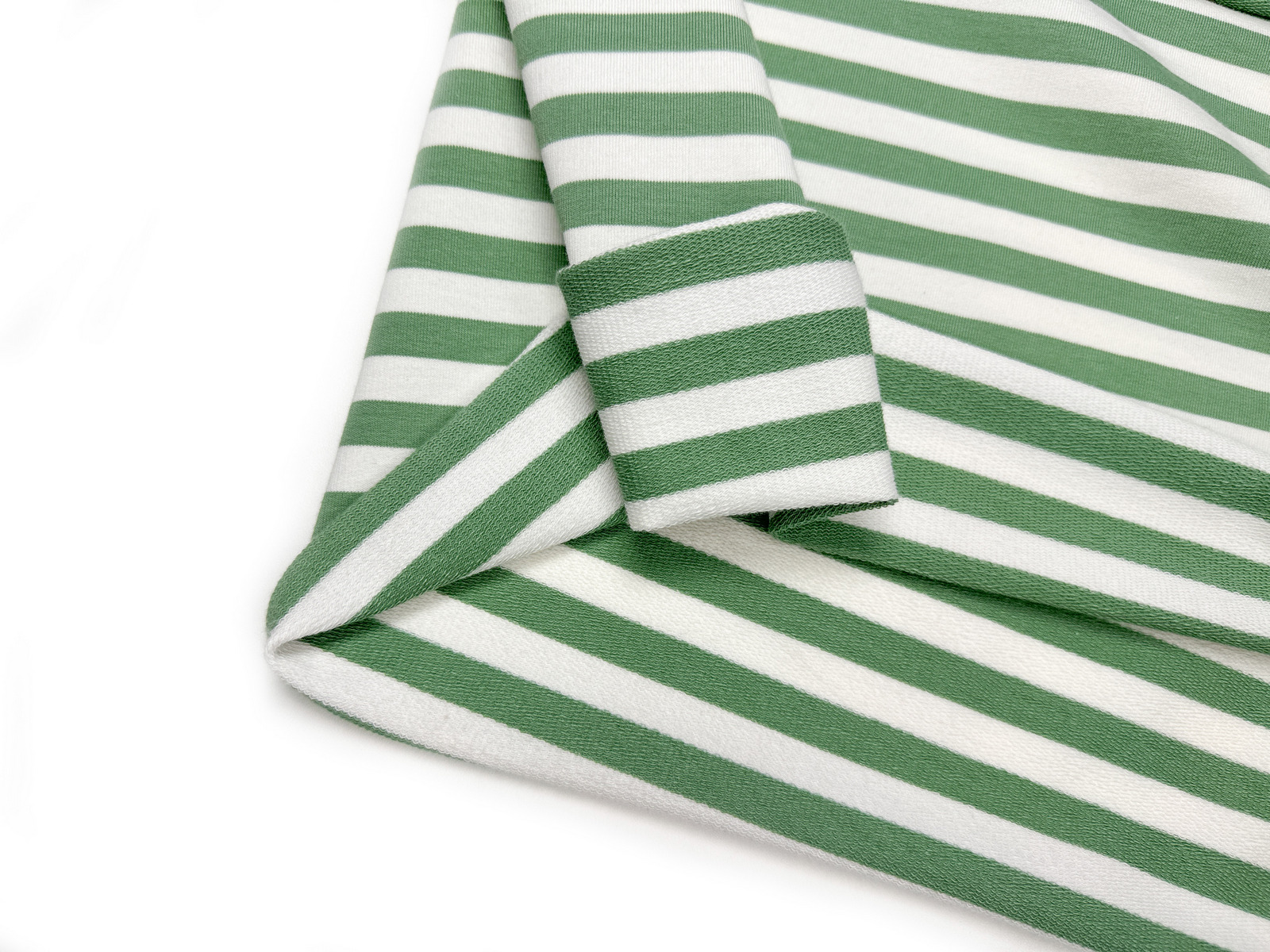 Ткань футер 2-х нитка Тельняшка цвет лавровый, узкая полоска плотностью 250 гр с шириной полотна 180 см. Мягкая и гладкая лицевая сторона, изнанка с аккуратной петелькой. Состав 95% хлопка и 5% лайкры и качество Компакт Пенье обеспечивает материалу хорошую эластичность и устойчивость к потери формы после стирок. Ширина цветной полоски 1 см, молочной 1 см.