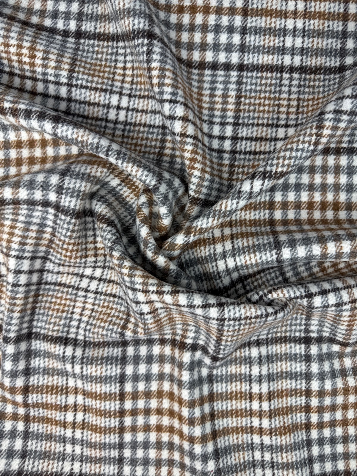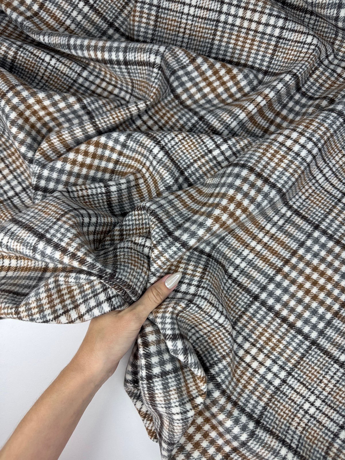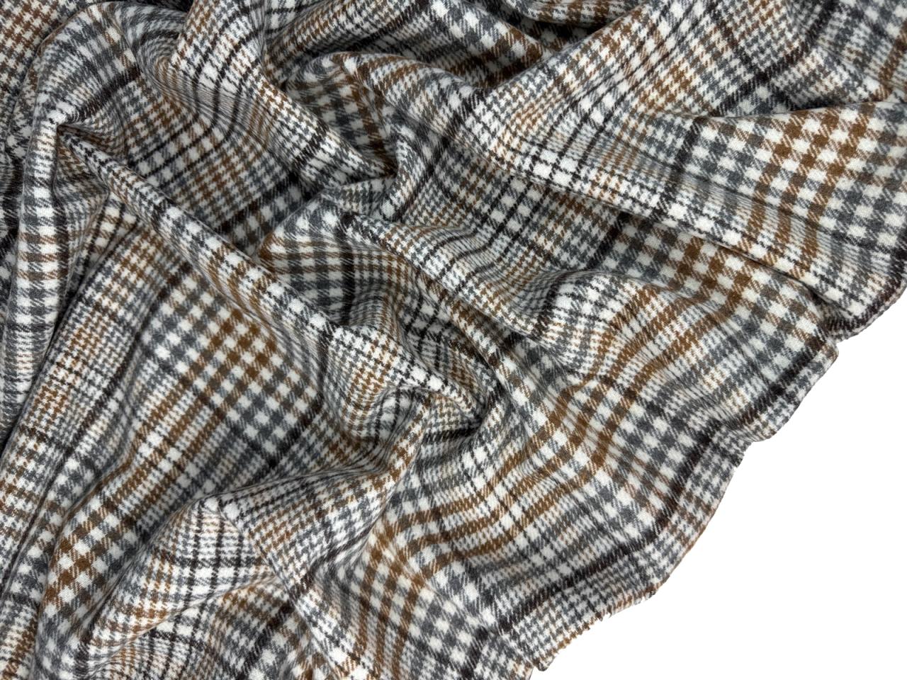 Ткань клетка шотландская цвет беж. Синтетическое плотное с плотностью 420 гр и шириной 150 см. Лицевая с небольшим ворсом, изнанка гладкая. Не тянется, учитывайте это при выборе модели. Закладывается в мягкие небольшие складки. Хорошо держит форму. Не мнется. Минимальная усадка 3%.