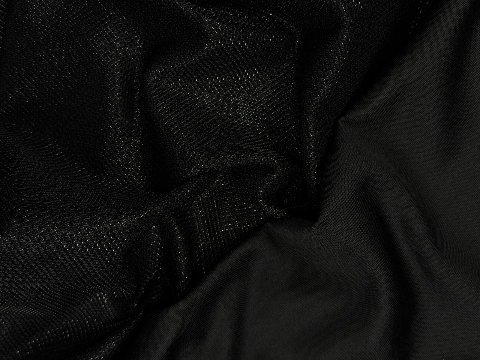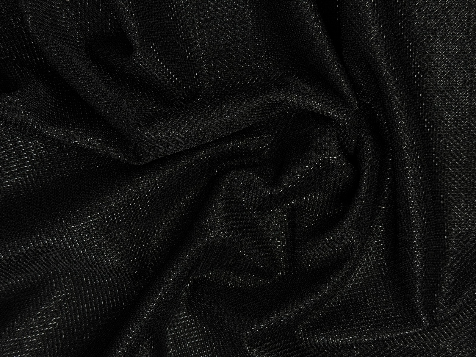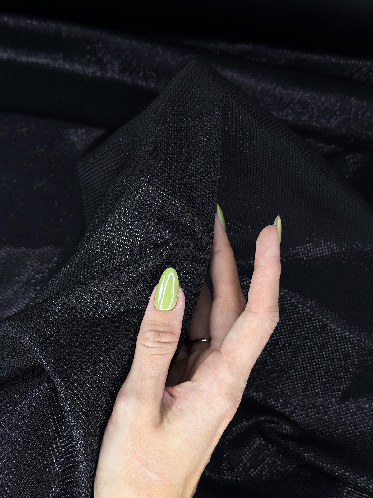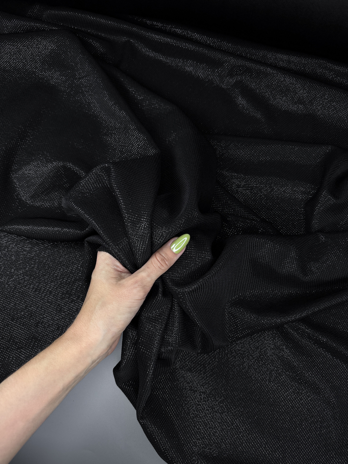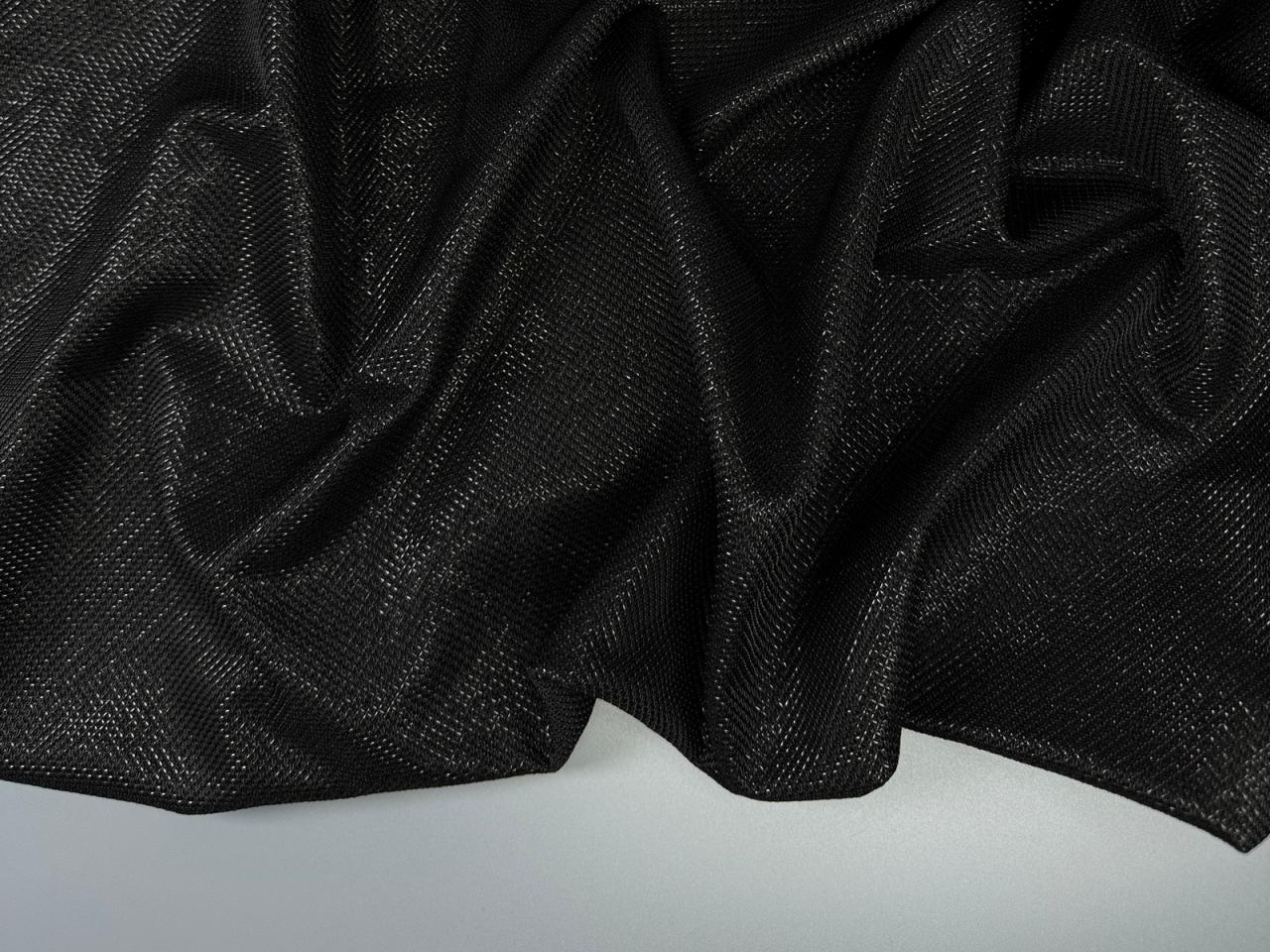 Ткань трикотаж люрекс соты цвет черный. Мягкое эластичное полотно, закладывается в мелкие складки. Лицевая сторона имеет блестящую ромбовидную фактуру, изнанка гладкая. Не держит форму. Не светит. Усадка до 5%.