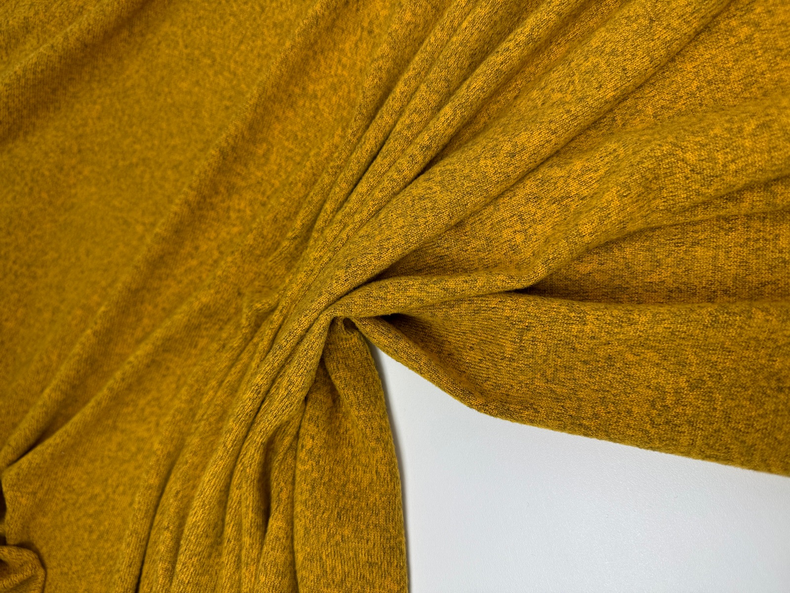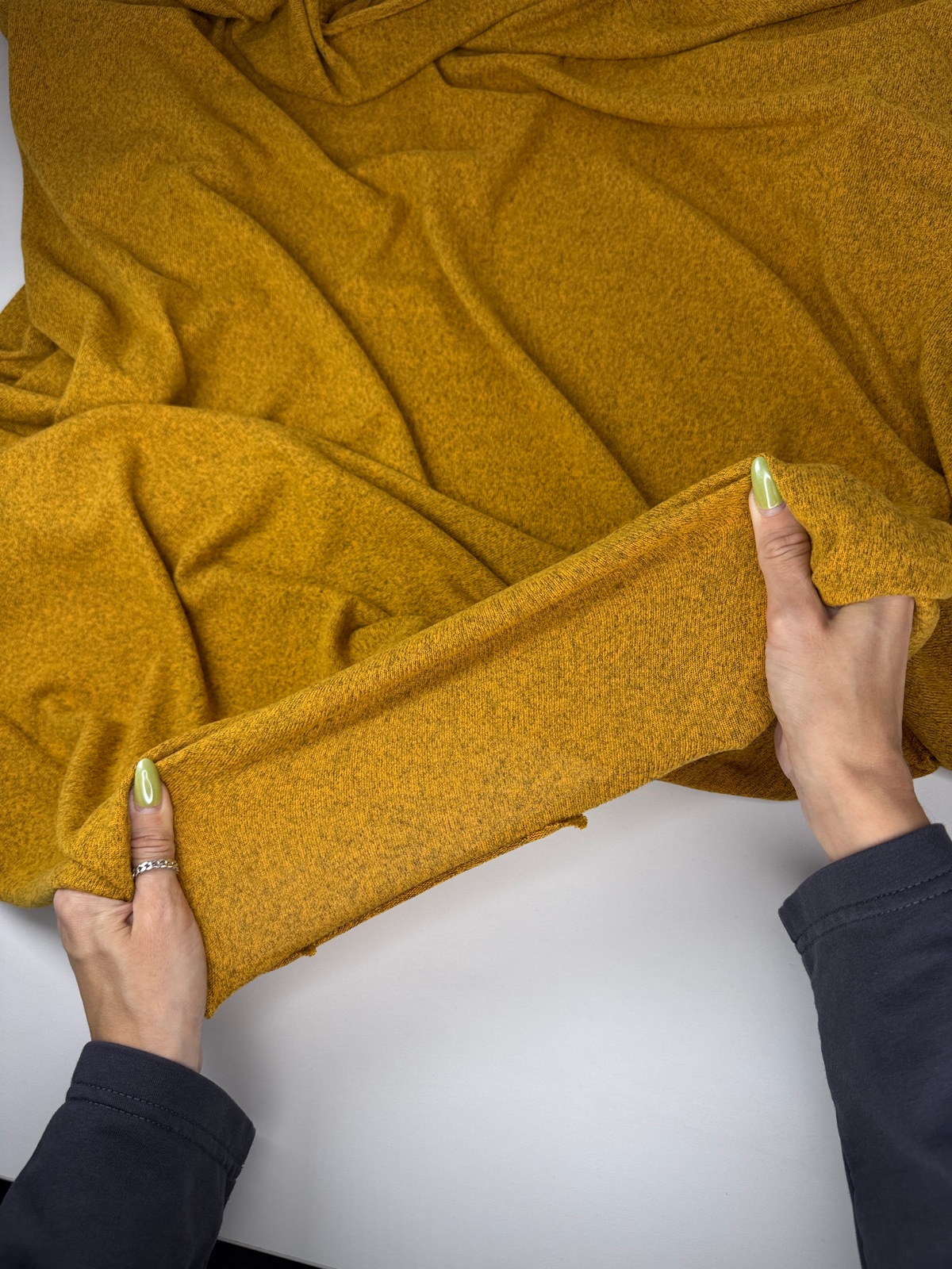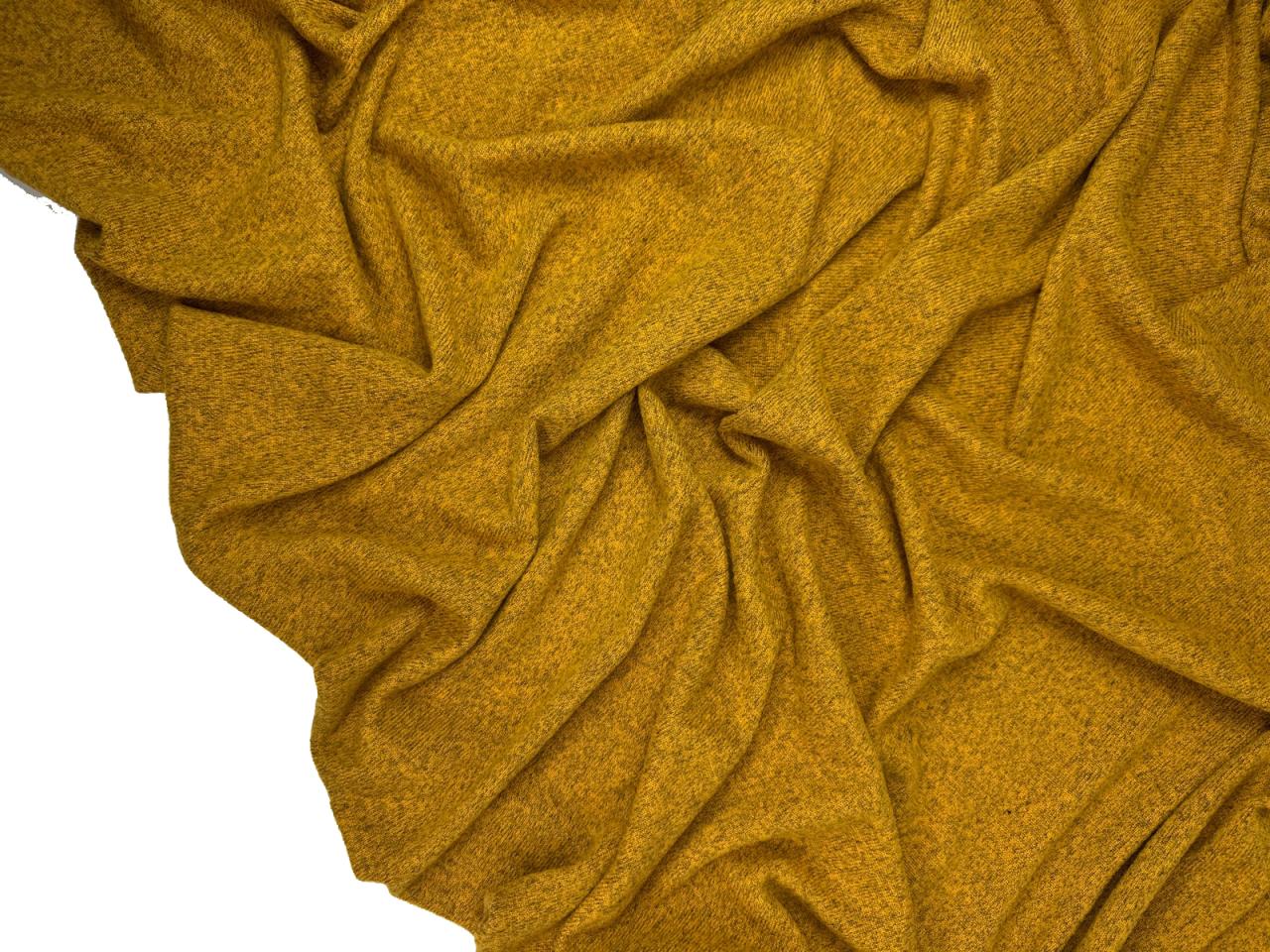 Вязаный трикотаж сандра цвет медовый с меланжевым эффектом. Мягкое трикотажное полотно малой плотности (220 гр) с высокой эластичностью. Ниспадает, струится, закладывается в тонкие складки. Не дает усадку. Край не сыпется, но требует обработки. Хорошо тянется и возвращается в исходную форму.