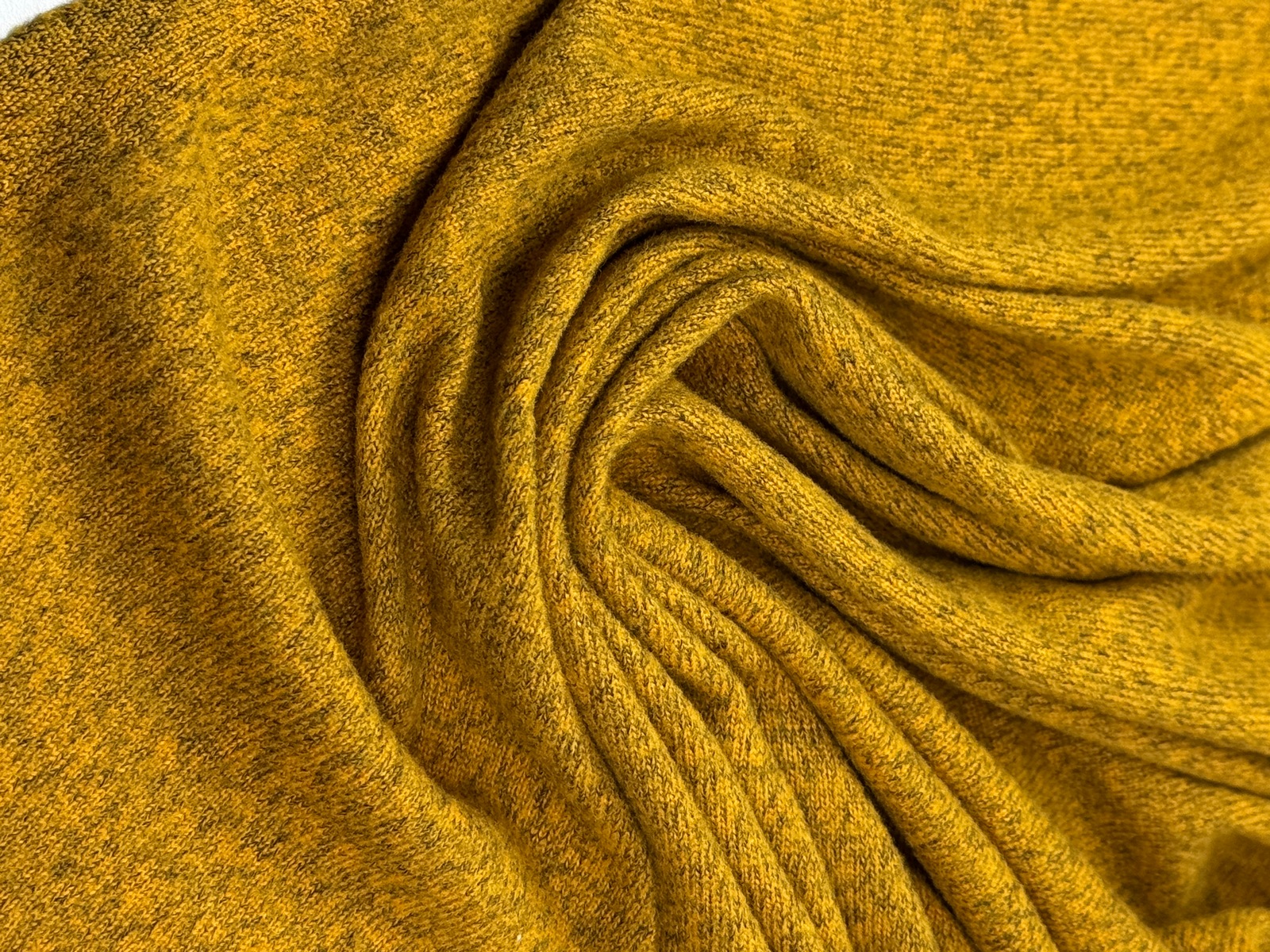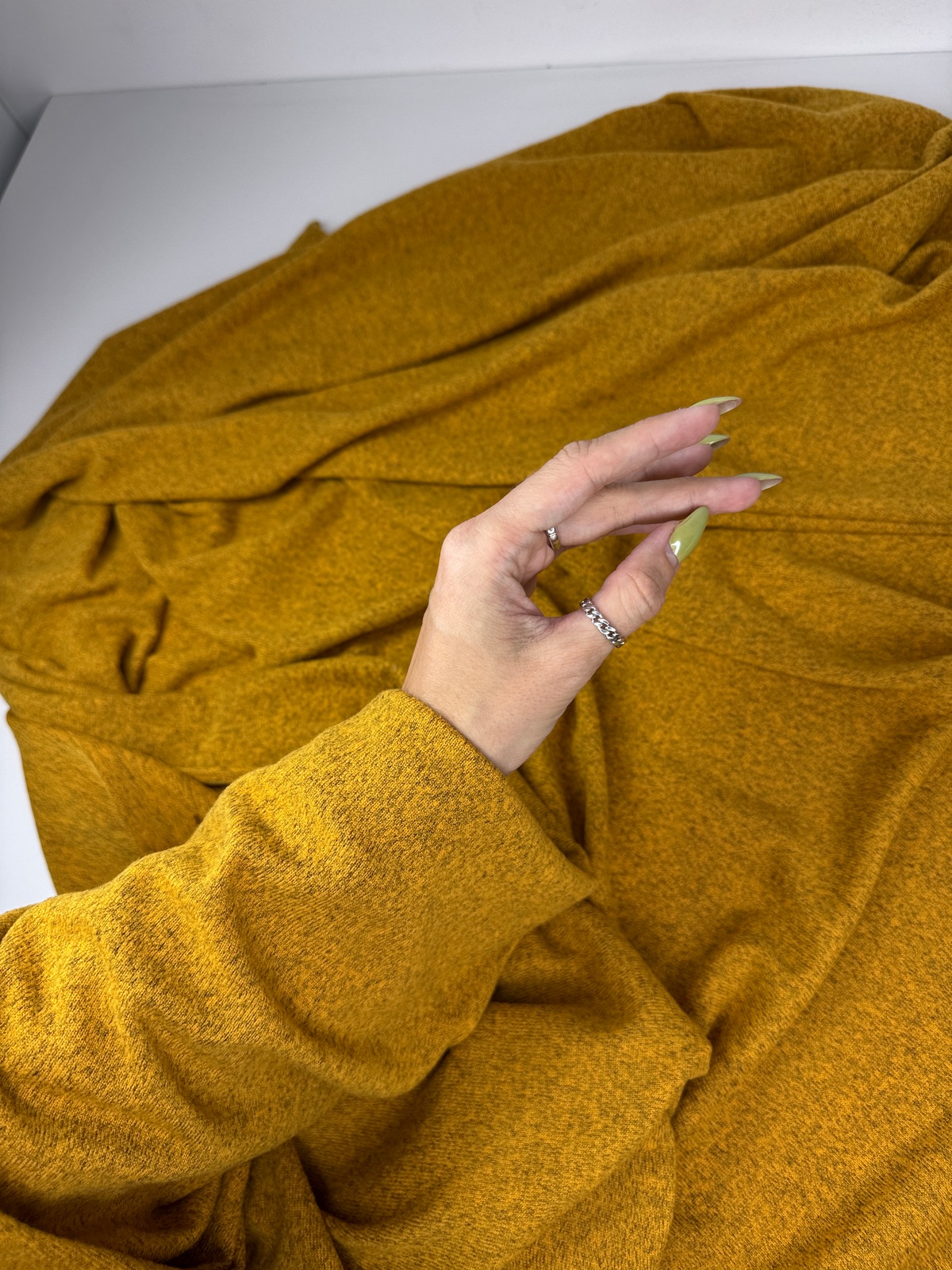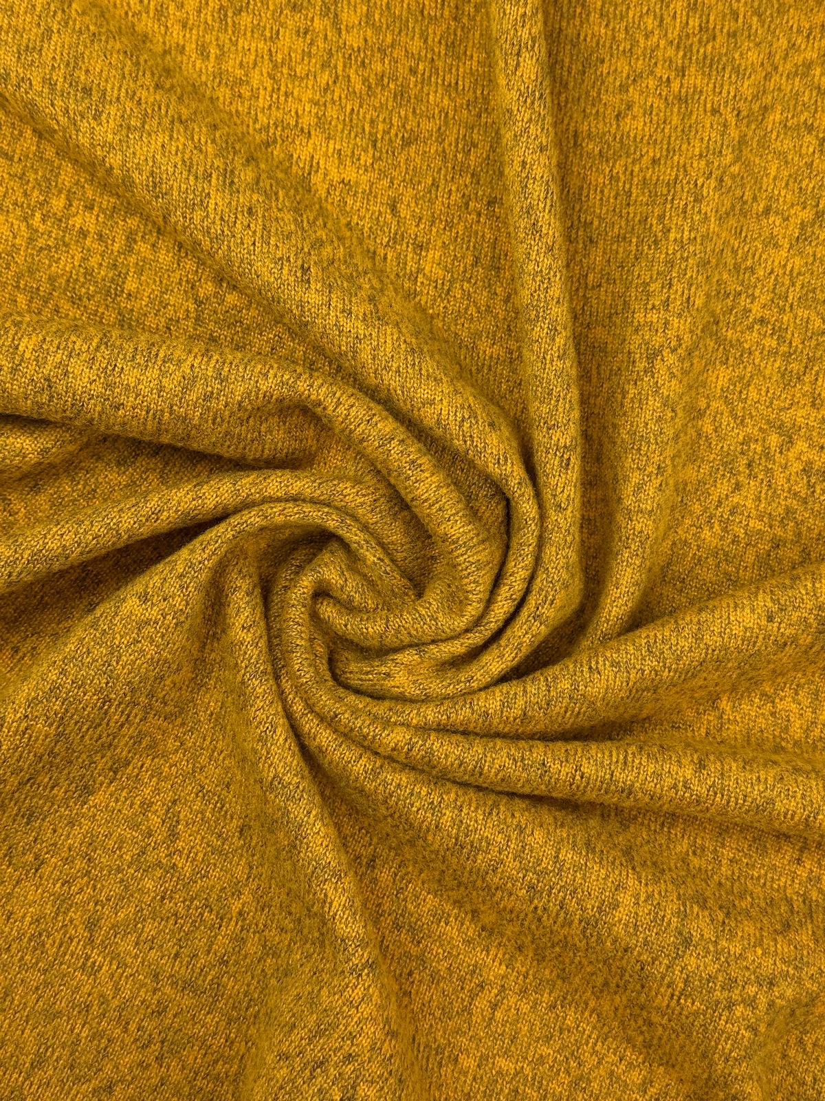 Вязаный трикотаж сандра цвет медовый с меланжевым эффектом. Мягкое трикотажное полотно малой плотности (220 гр) с высокой эластичностью. Ниспадает, струится, закладывается в тонкие складки. Не дает усадку. Край не сыпется, но требует обработки. Хорошо тянется и возвращается в исходную форму.
