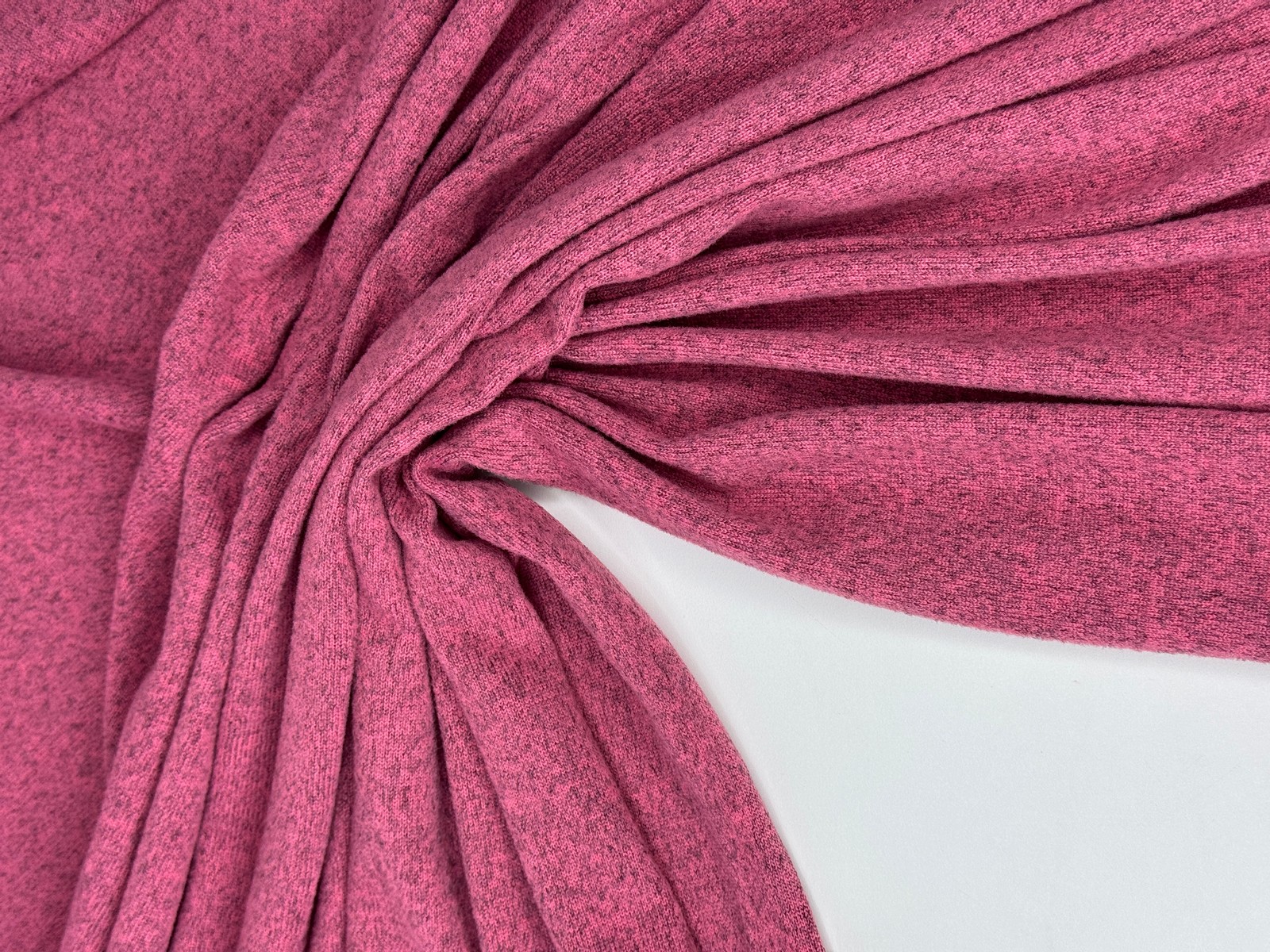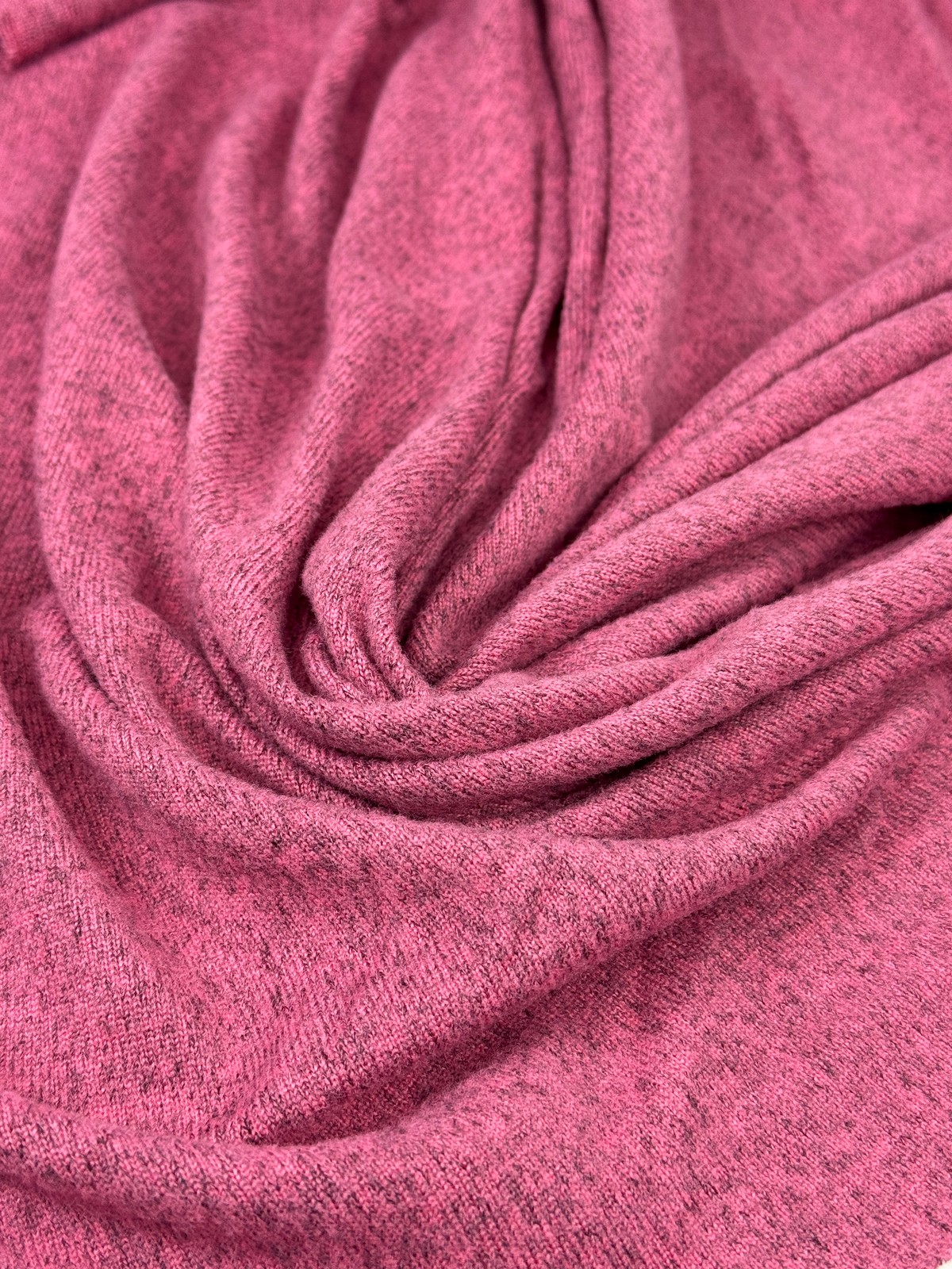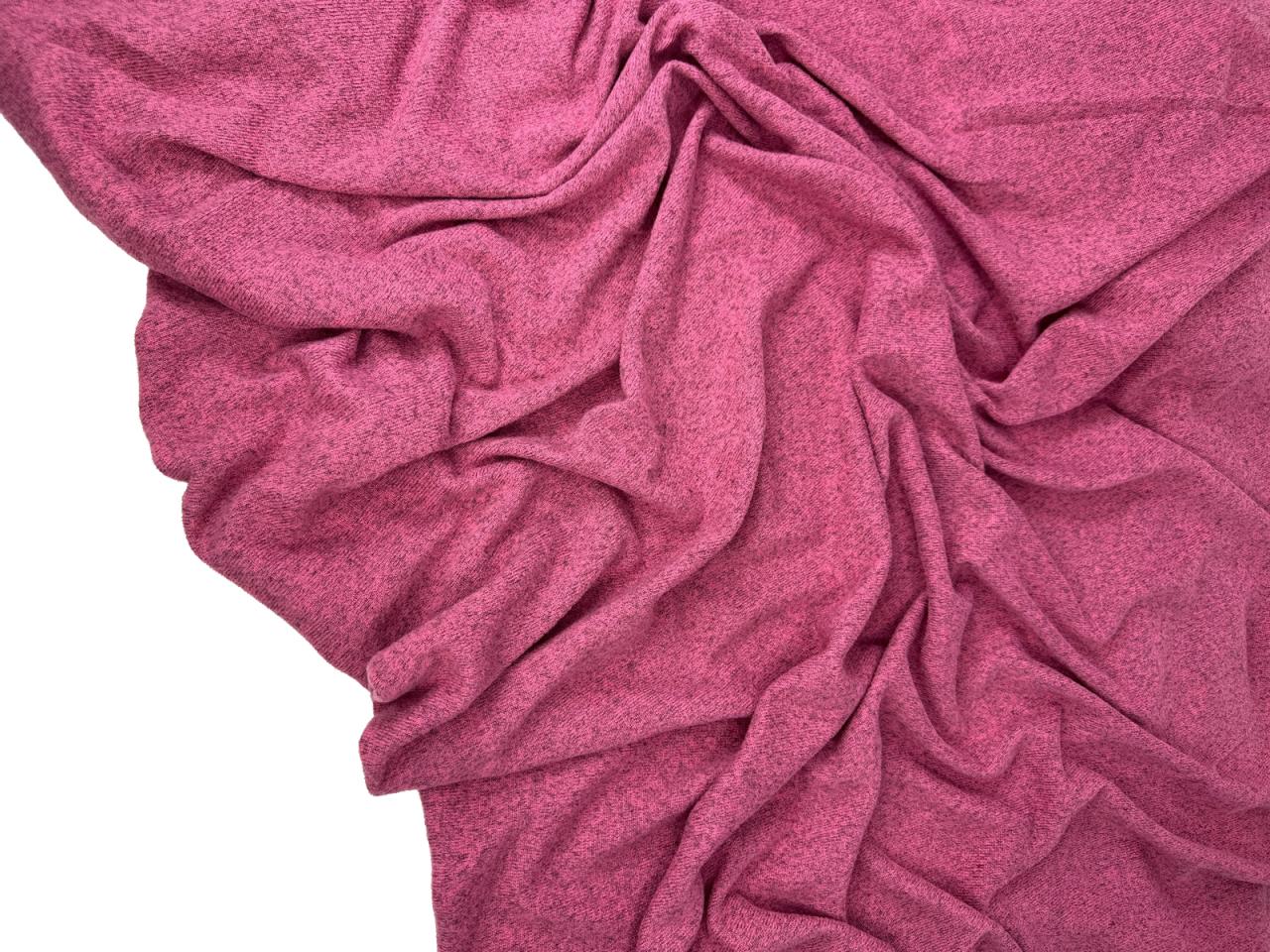Вязаный трикотаж сандра цвет помада с меланжевым эффектом. Мягкое трикотажное полотно малой плотности (220 гр) с высокой эластичностью. Ниспадает, струится, закладывается в тонкие складки. Не дает усадку. Край не сыпется, но требует обработки. Хорошо тянется и возвращается в исходную форму.