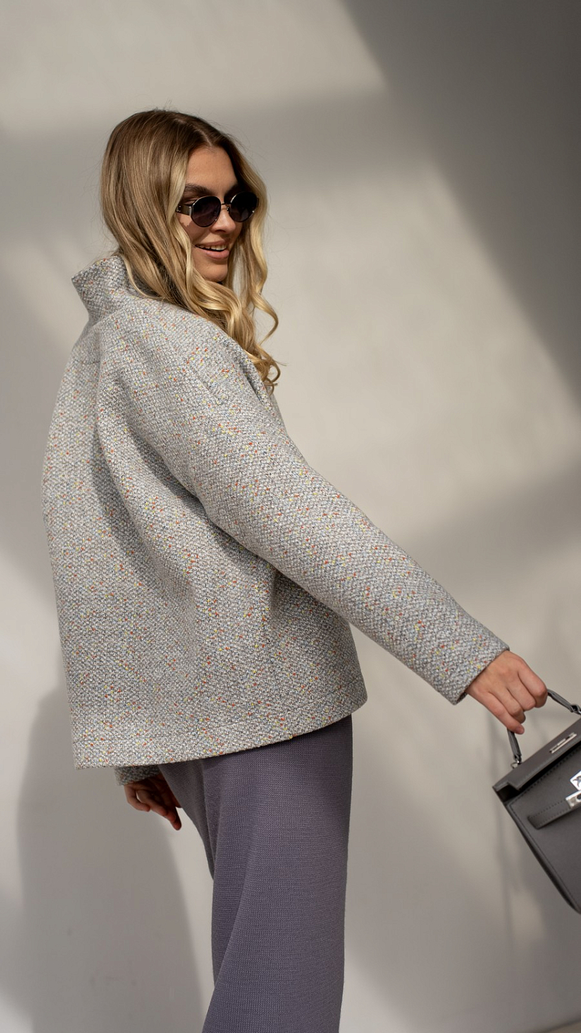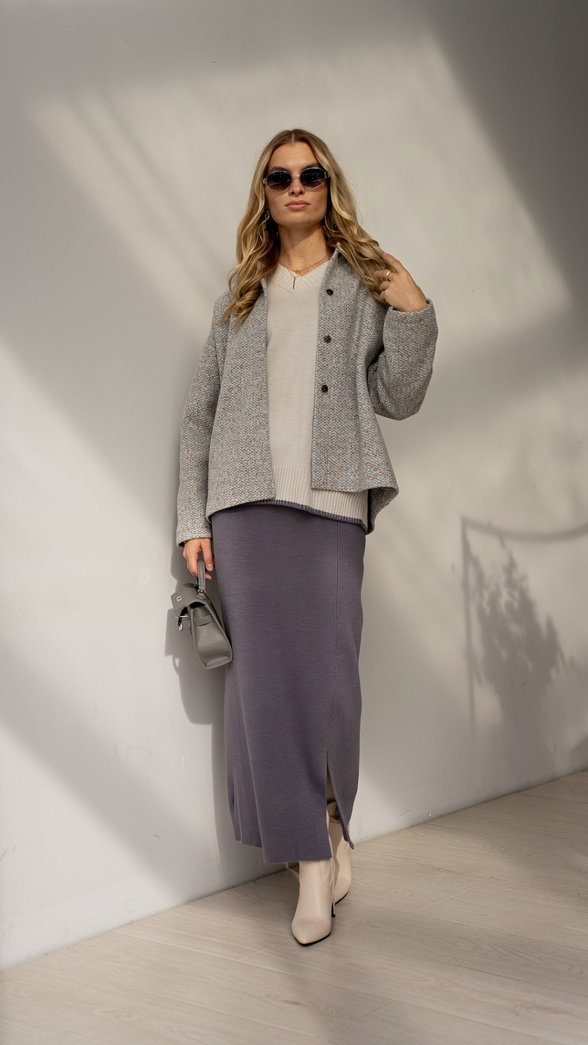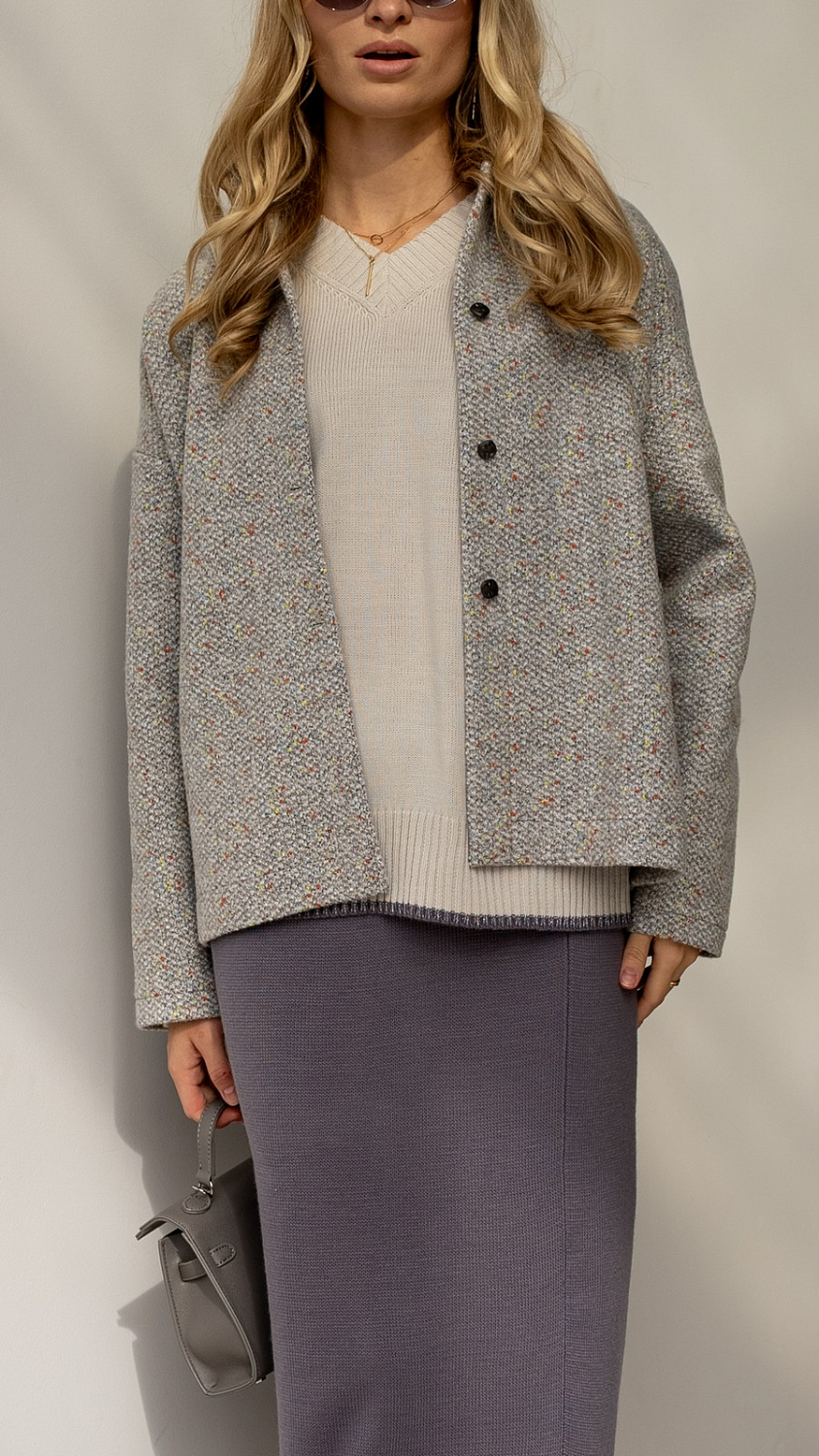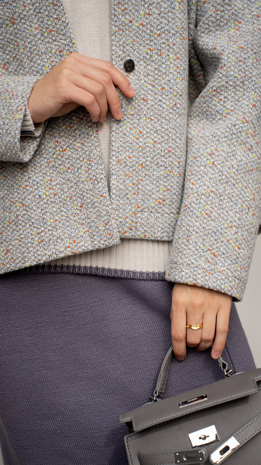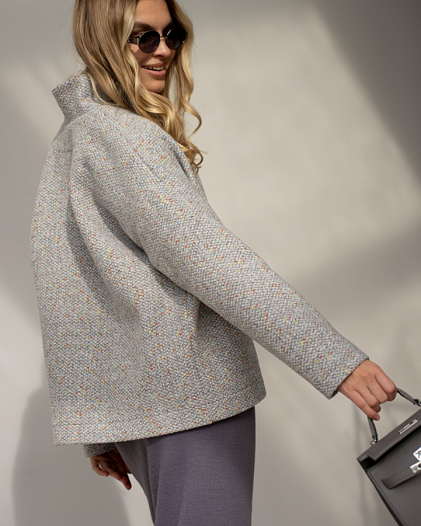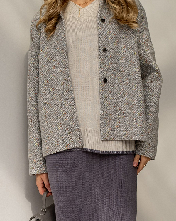 Еще один пошив мягкого жакета из ткани букле/меланж/люрекс цвет Графит. Мягкий синтетический материал с добавлением шерсти и богатой фактурой станет идеальным решением для жакетов, юбок, брюк и полноценных костюмов. Ткань не колется, но первый слой необходим, особенно если у вас чувствительная кожа.