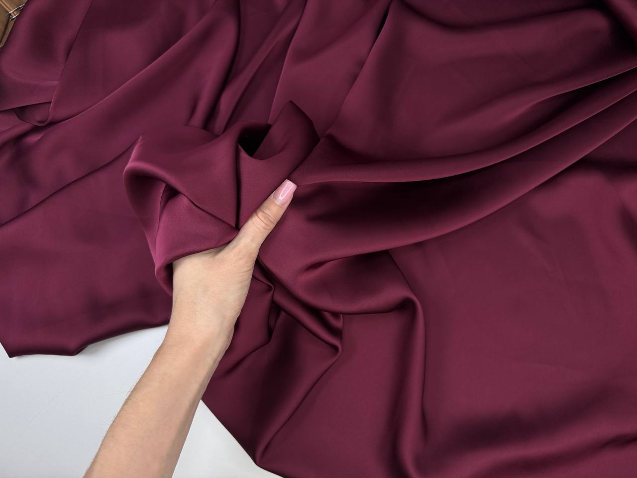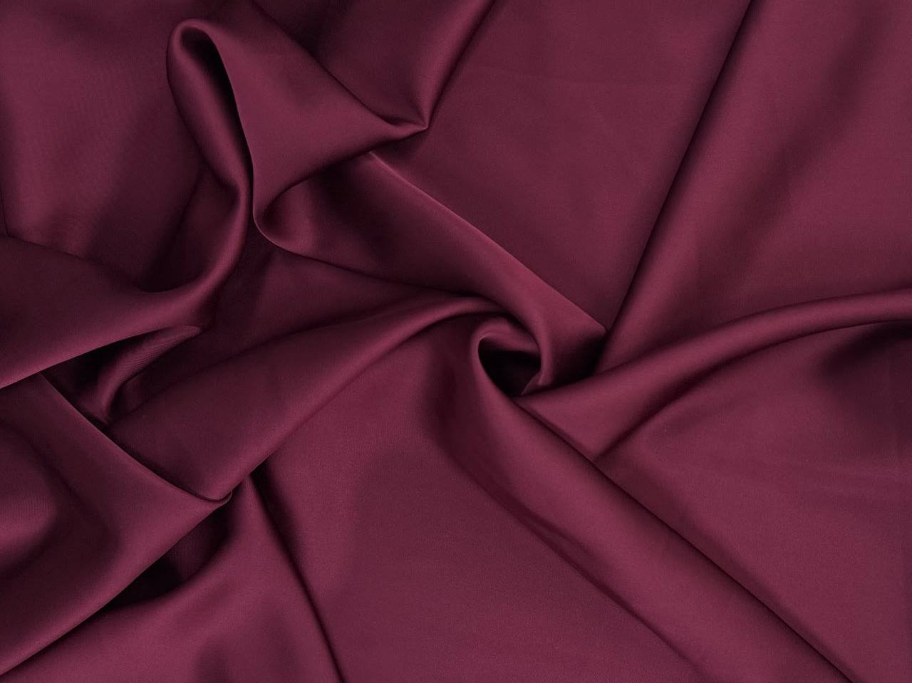 Дубайский шелк цвет бордо – вид атласа с шелковистой поверхностью. Струящееся пластичное полотно, дает эффектные драпировки. Растяжим по поперечной нити. Средняя сминаемость. Не дает усадку. Плотненький. Никаких пятен от воды.Не боится зацепок. Идеально подходит для кроя изделий по косой!