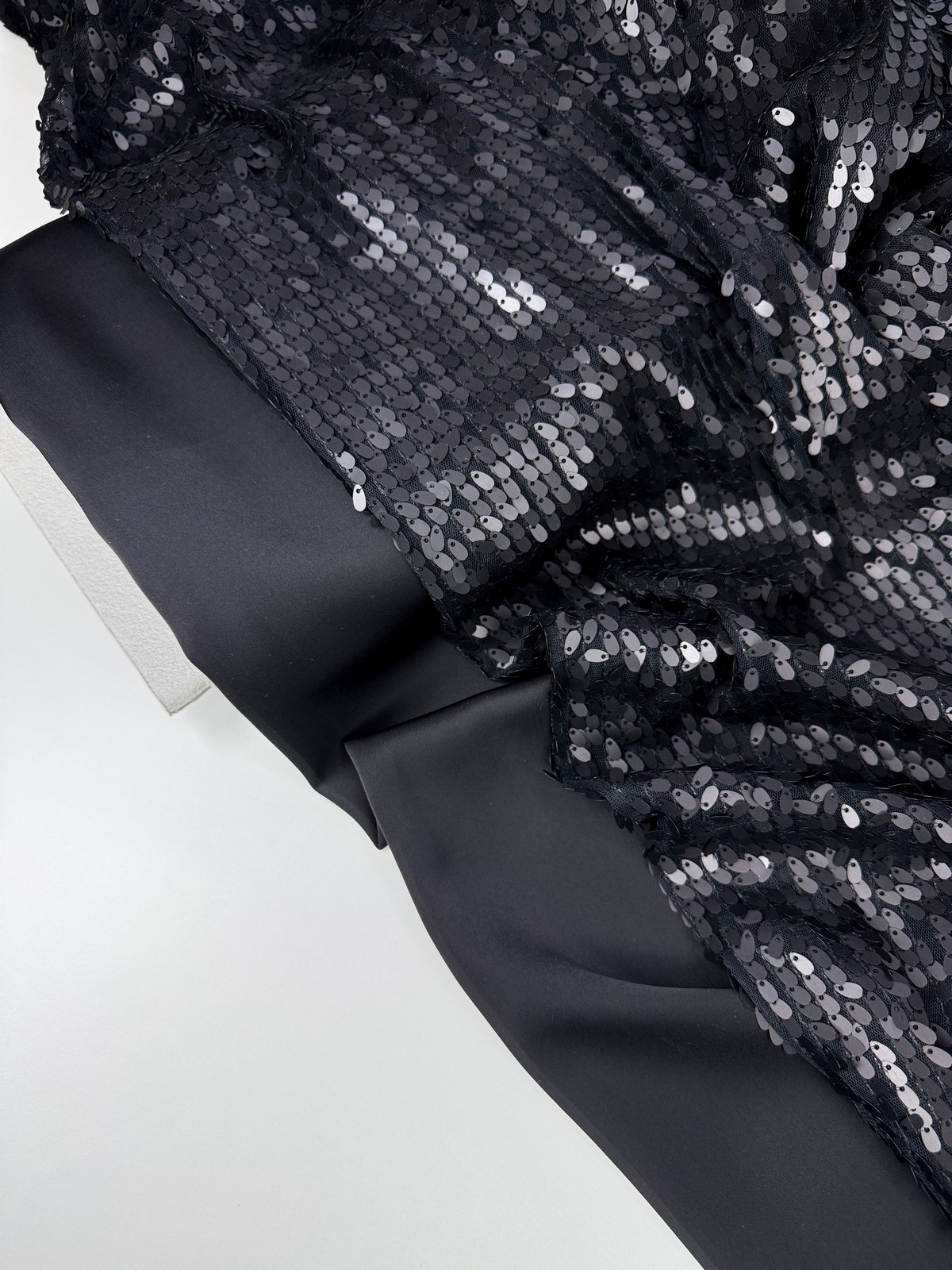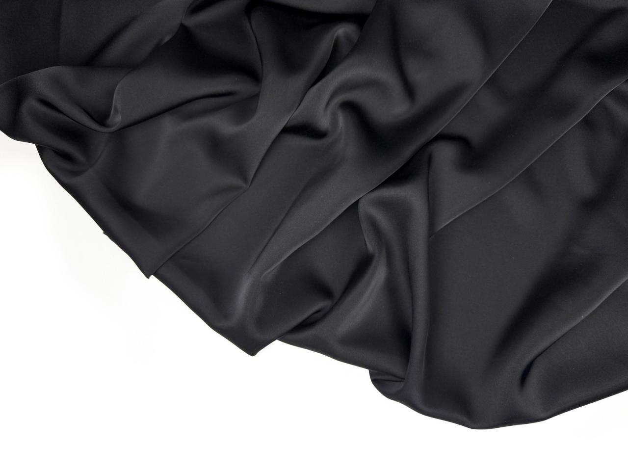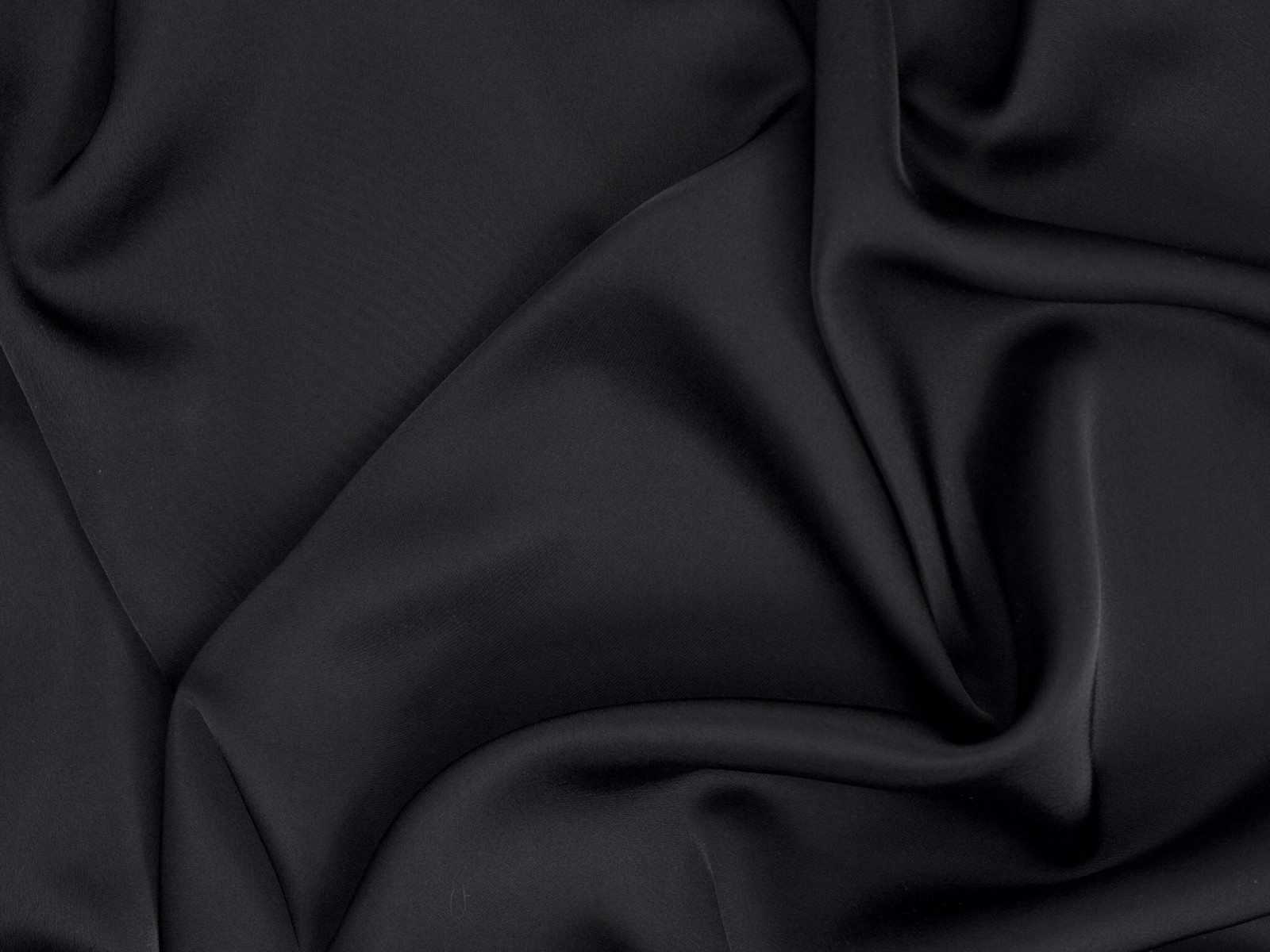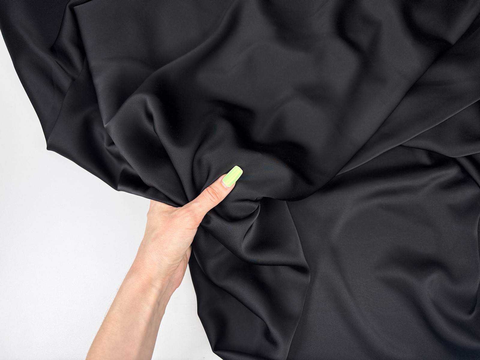 Дубайский шелк цвет черный – вид атласа с шелковистой поверхностью. Струящееся пластичное полотно, дает эффектные драпировки. Растяжим по поперечной нити. Средняя сминаемость. Не дает усадку. Плотненький. Никаких пятен от воды.Не боится зацепок. Идеально подходит для кроя изделий по косой!