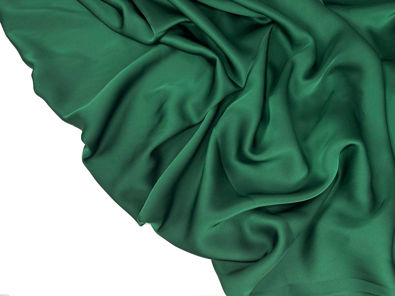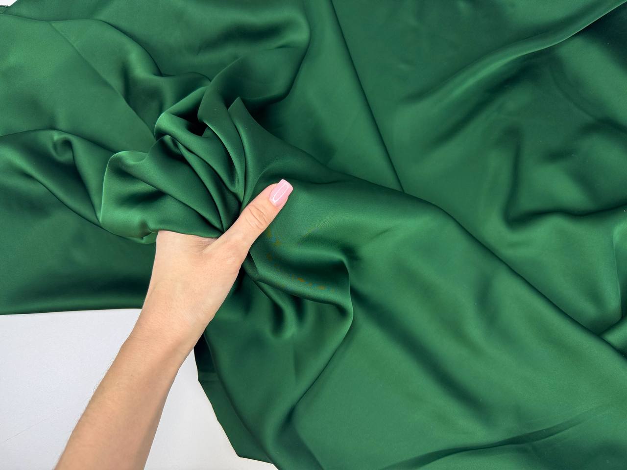 Дубайский шелк цвет изумруд – вид атласа с шелковистой поверхностью. Струящееся пластичное полотно, дает эффектные драпировки. Растяжим по поперечной нити. Средняя сминаемость. Не дает усадку. Плотненький. Никаких пятен от воды.Не боится зацепок. Идеально подходит для кроя изделий по косой!