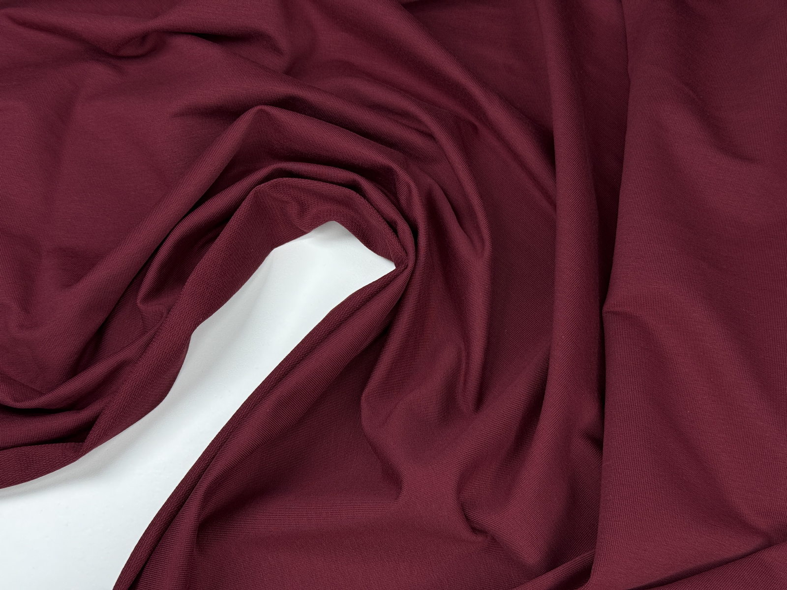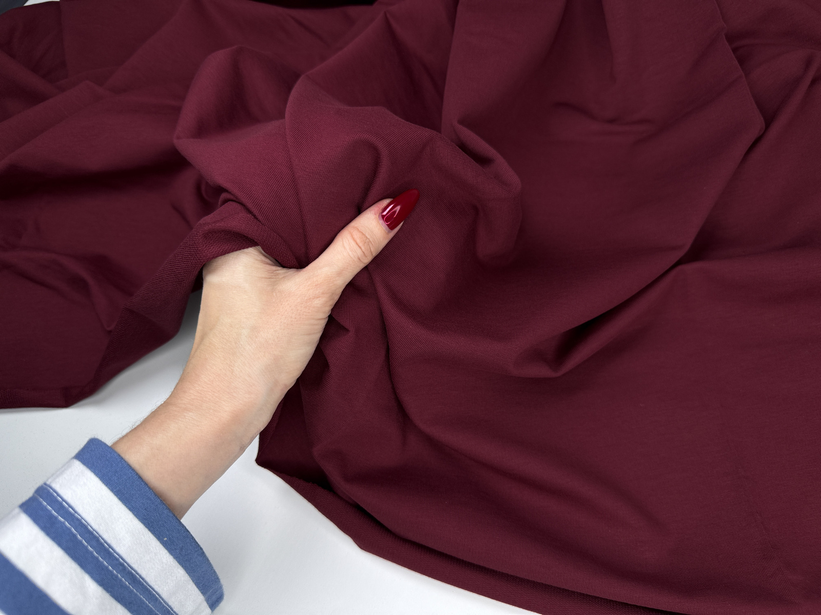 Ткань футер 2-х нитка плотность 250 гр цвет винный. Мягкая и гладкая лицевая сторона, изнанка с аккуратной петелькой. Состав 95% хлопка и 5% лайкры и качество Компакт Пенье обеспечивает материалу хорошую эластичность и устойчивость к потере формы после стирок.