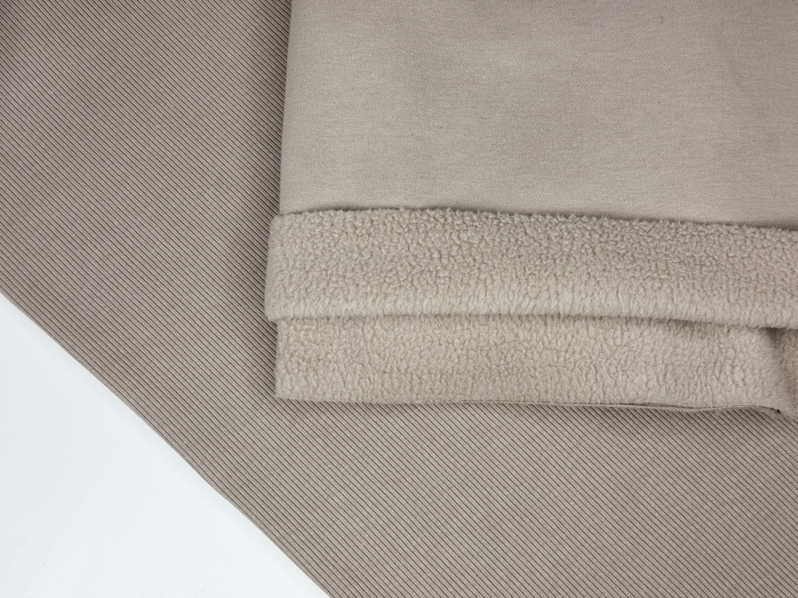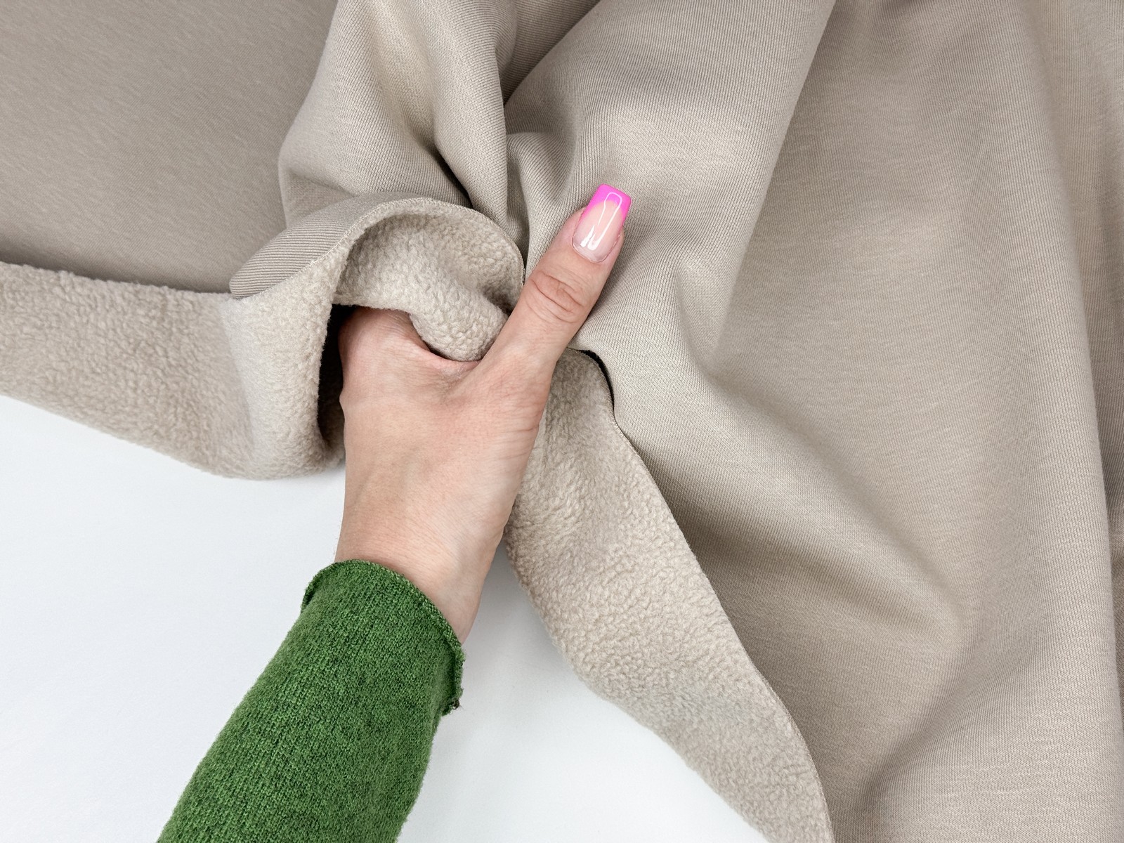 Футер имеет гладкую хлопковую лицевую сторону, а с изнанки ворс обработан специальным способом и напоминает шерсть барашка. Теплый, отлично держит форму, не пиллингуется. Его можно шить на обе стороны, что позволяет значительно экономить время и деньги. В наличии кашкорсе в тон.