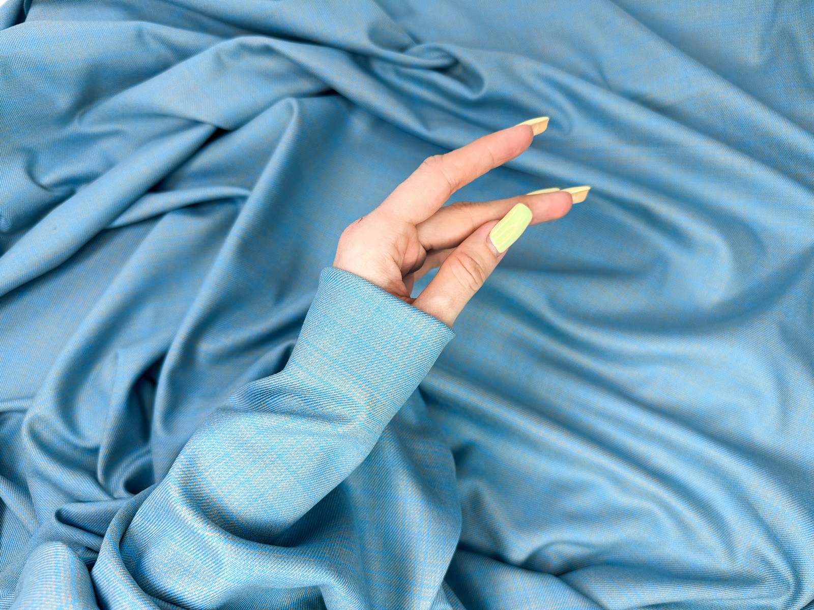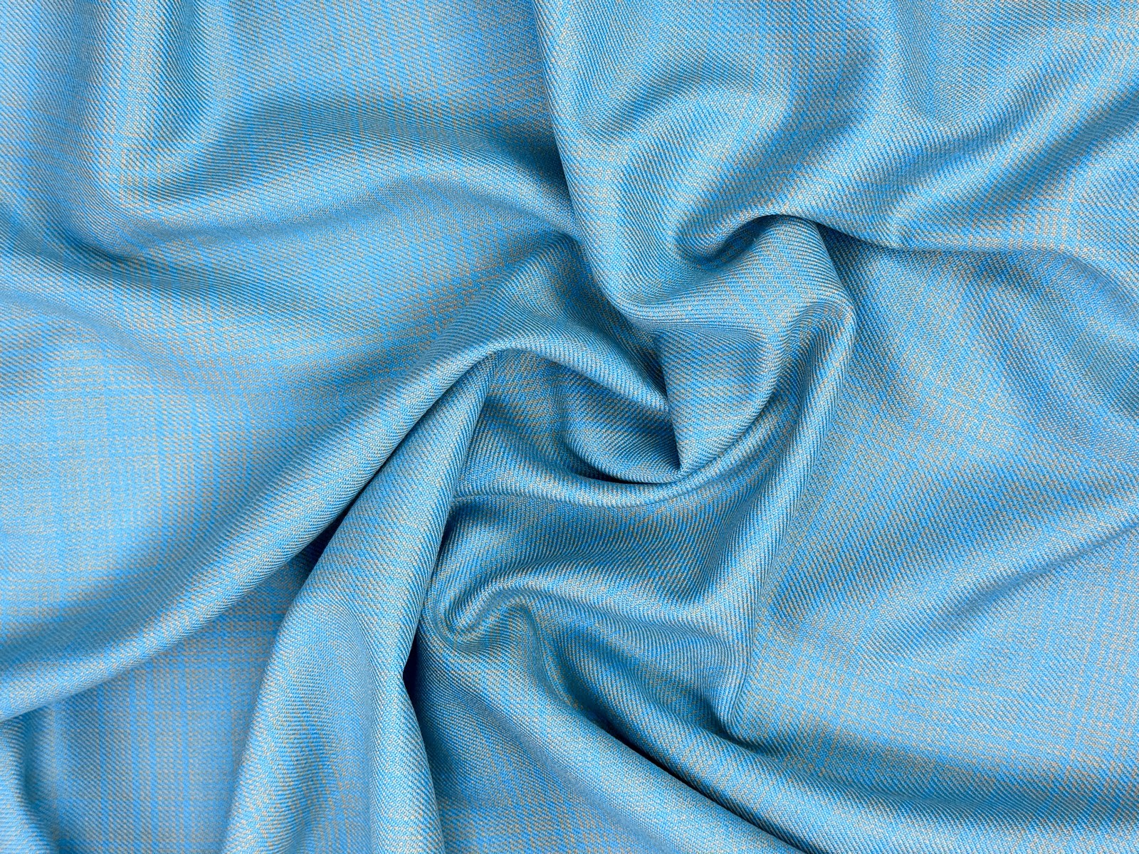Костюмная ткань из смесового состава на основе вискозы производства Италия цвет голубой-беж.Нежна деликатная бежевая клетка наполняет полотно глубиной и изящными переливами на свету. Эластичная. Обладает малой сминаемостью. Закладывается в средние складки. Легкая в обработке. Возможна усадка до 5%.