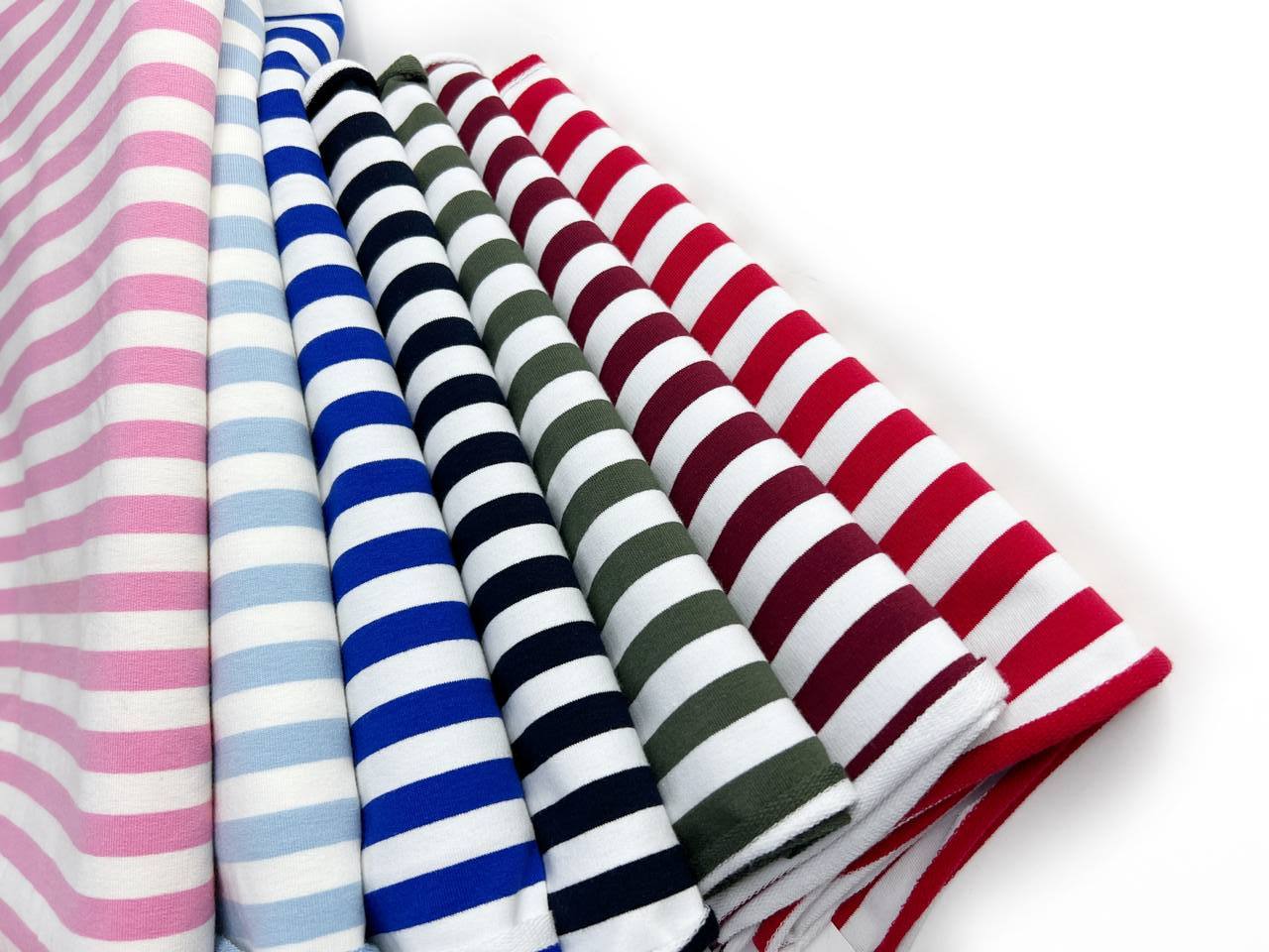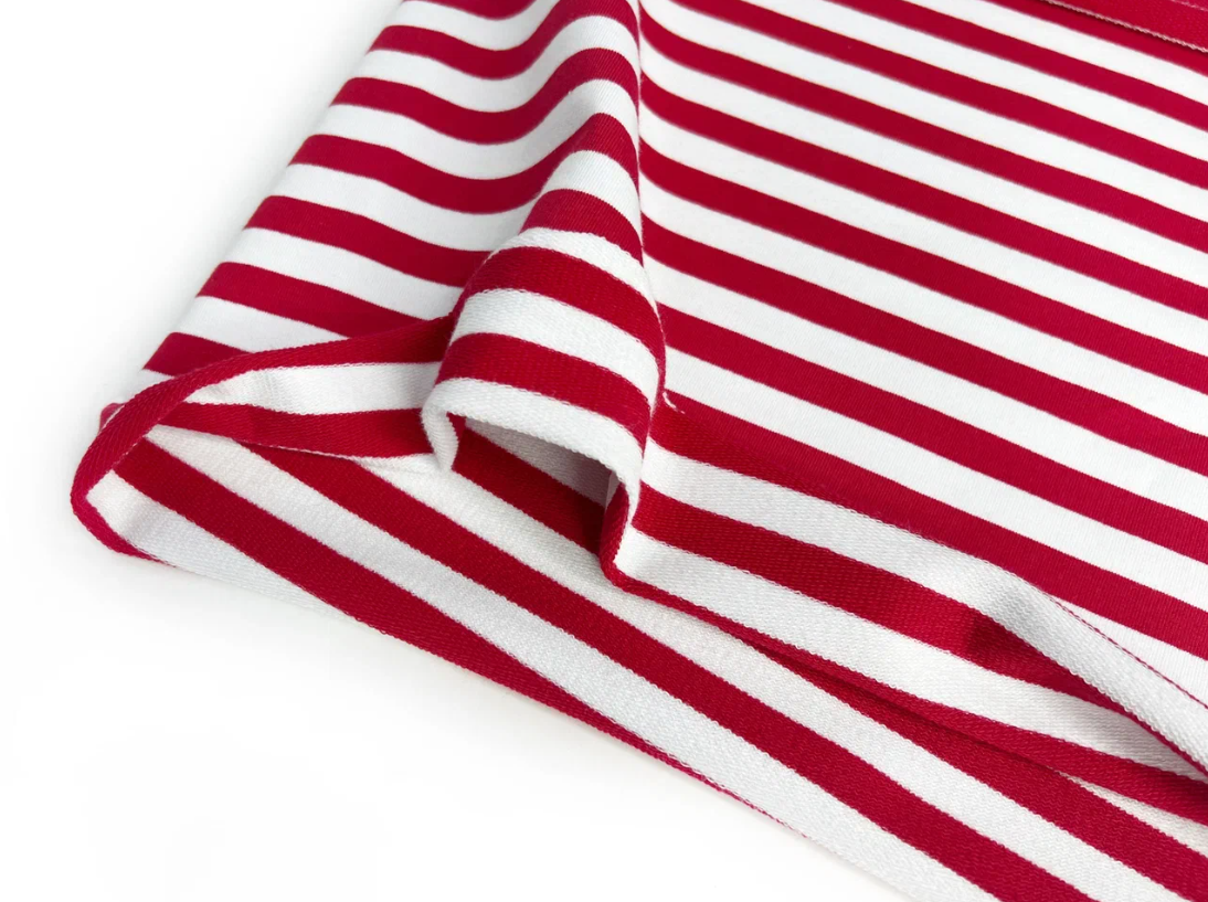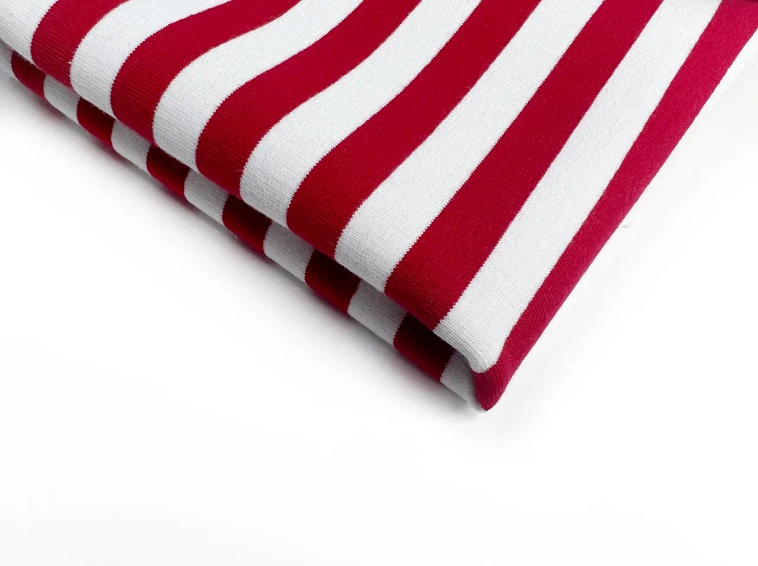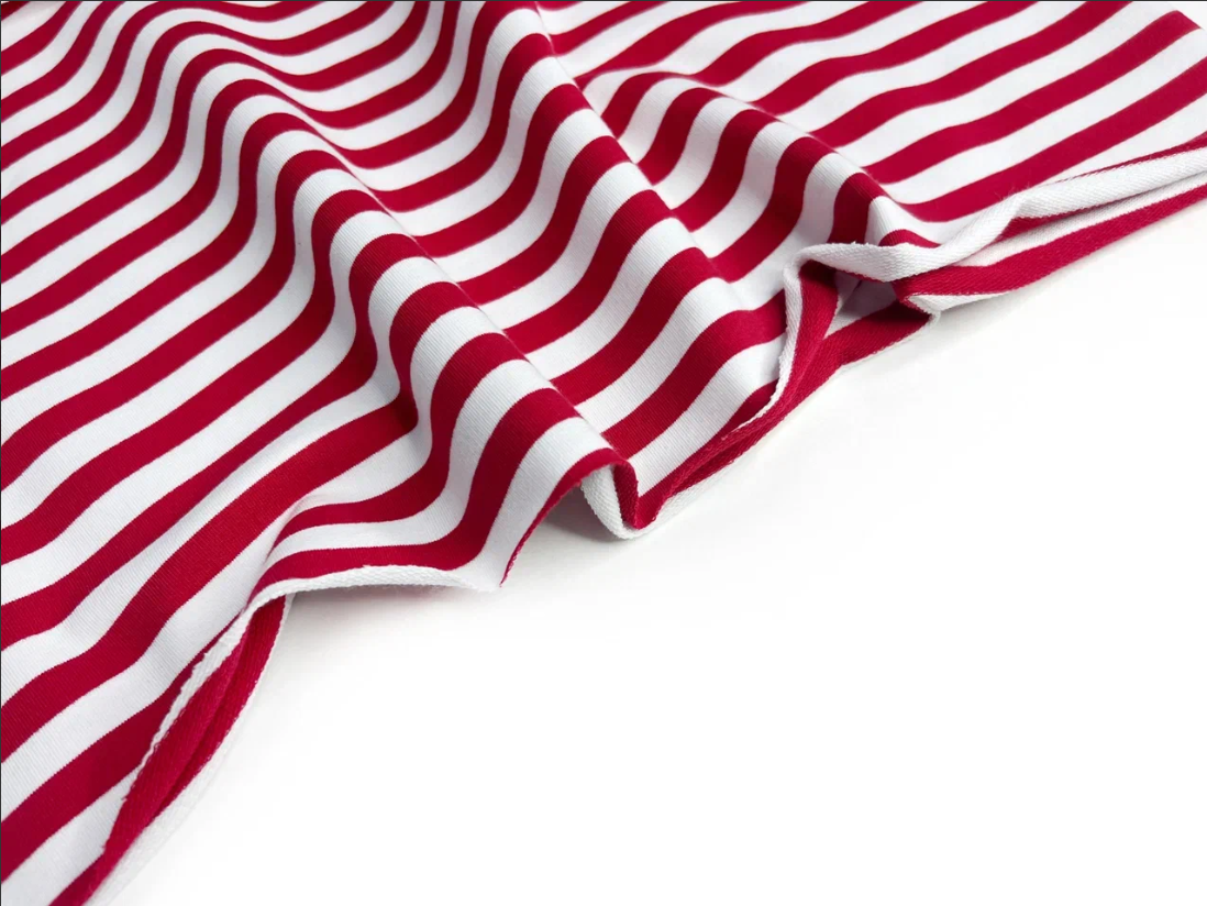 Ткань футер 2-х нитка Тельняшка цвет красный, узкая полоска плотностью 250 гр с шириной полотна 180 см. Мягкая и гладкая лицевая сторона, изнанка с аккуратной петелькой. Состав 95% хлопка и 5% лайкры и качество Компакт Пенье обеспечивает материалу хорошую эластичность и устойчивость к потери формы после стирок. Ширина цветной полоски 1 см, молочной 1 см.
