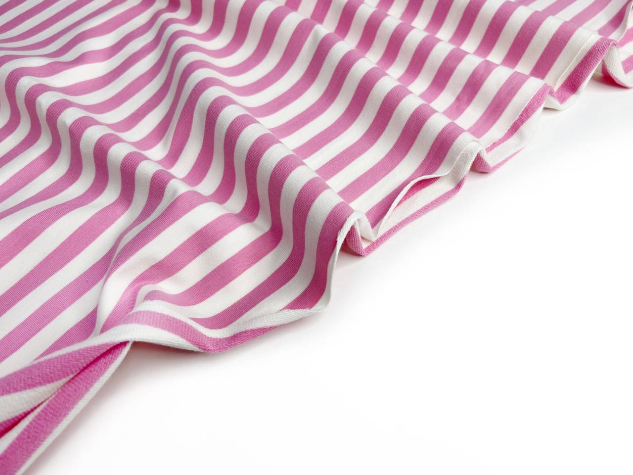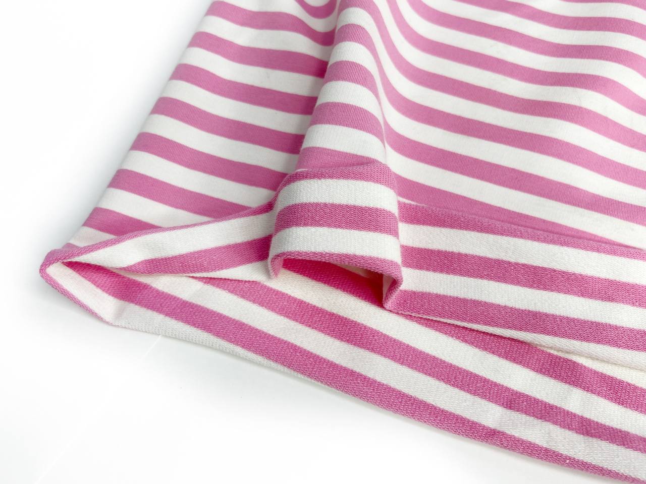 Ткань футер 2-х нитка Тельняшка цвет розовый плотностью 250 гр с шириной полотна 180 см. Мягкая и гладкая лицевая сторона, изнанка с аккуратной петелькой. Состав 95% хлопка и 5% лайкры и качество Компакт Пенье обеспечивает материалу хорошую эластичность и устойчивость к потери формы после стирок. Ширина полосок (экрю, цветная) 1 см.