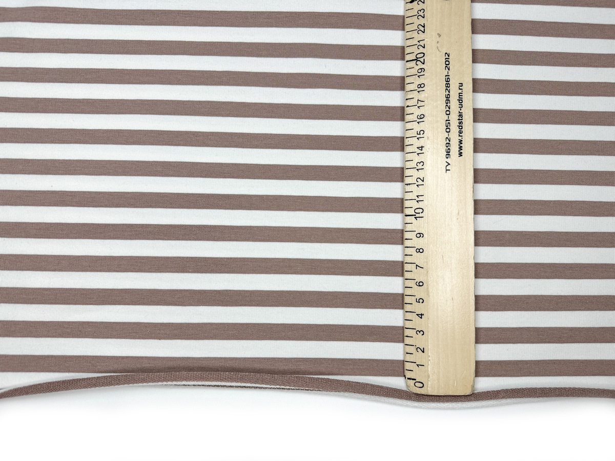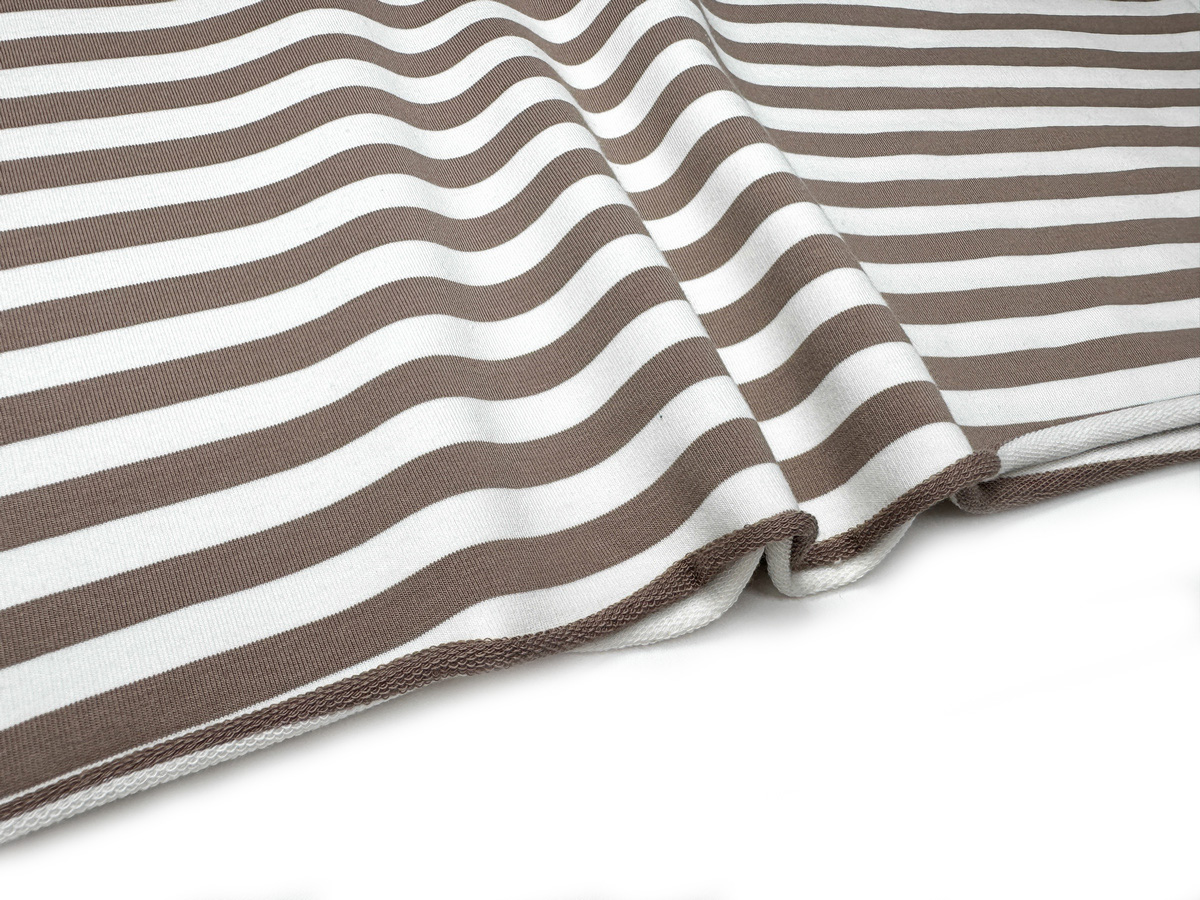 Ткань футер 2-х нитка Тельняшка цвет тауп, узкая полоска плотностью 250 гр с шириной полотна 180 см. Мягкая и гладкая лицевая сторона, изнанка с аккуратной петелькой. Состав 95% хлопка и 5% лайкры и качество Компакт Пенье обеспечивает материалу хорошую эластичность и устойчивость к потери формы после стирок. Ширина цветной полоски 1 см, молочной 1 см.
