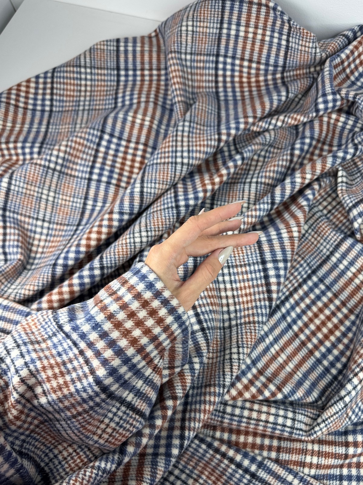 Ткань клетка цвет джинс-терракот. Синтетическое плотное с плотностью 420 гр и шириной 150 см. Лицевая с минимальным ворсом, изнанка гладкая. Не тянется, учитывайте это при выборе модели. Закладывается в упругие складки складки. Хорошо держит форму. Не мнется. Минимальная усадка 3%.