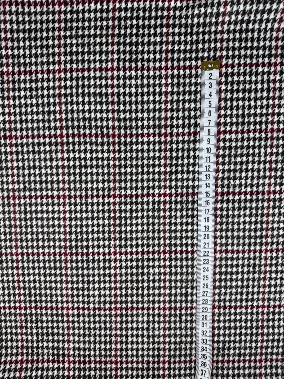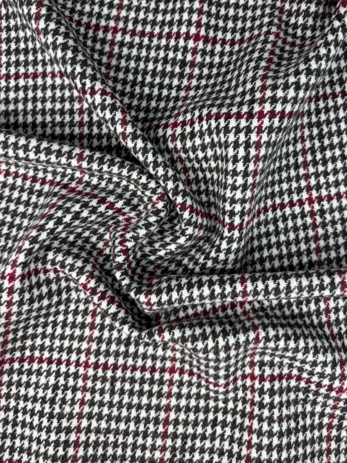 Ткань клетка с рисунком гусиная лапка цвет шоколад-винный. Синтетическое плотное с плотностью 450 гр и шириной 150 см. Лицевая с минимальным ворсом, изнанка гладкая. Не тянется, учитывайте это при выборе модели. Закладывается в плотные объемные складки. Хорошо держит форму. Не мнется. Минимальная усадка 3%.