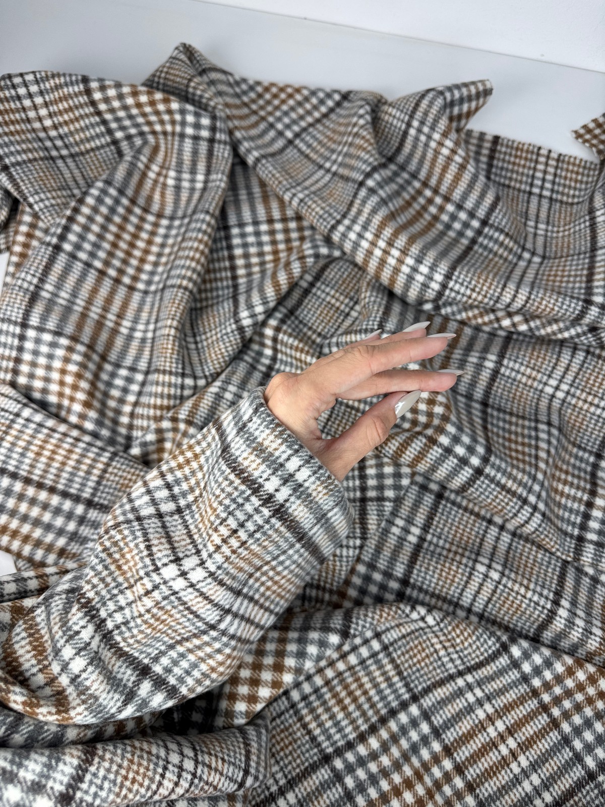 Ткань клетка шотландская цвет беж. Синтетическое плотное с плотностью 420 гр и шириной 150 см. Лицевая с небольшим ворсом, изнанка гладкая. Не тянется, учитывайте это при выборе модели. Закладывается в мягкие небольшие складки. Хорошо держит форму. Не мнется. Минимальная усадка 3%.